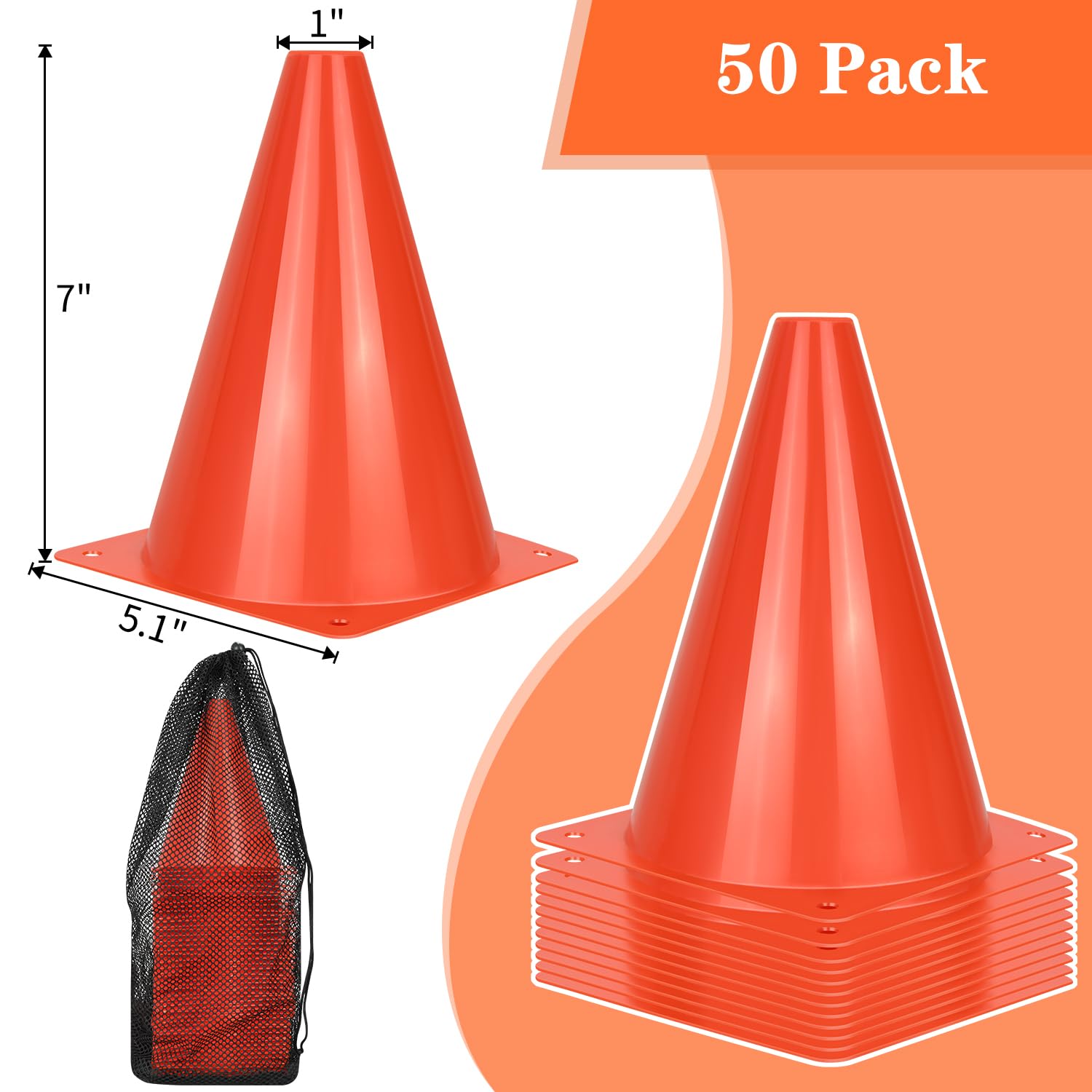 【Package Include】- Soccer cones set includes 50pcs sport cones and 1pcs carry bag, the height of each soccer cone is 7", the diameter of the top side is 1" and the diameter of the bottom of the square base is 5.1".