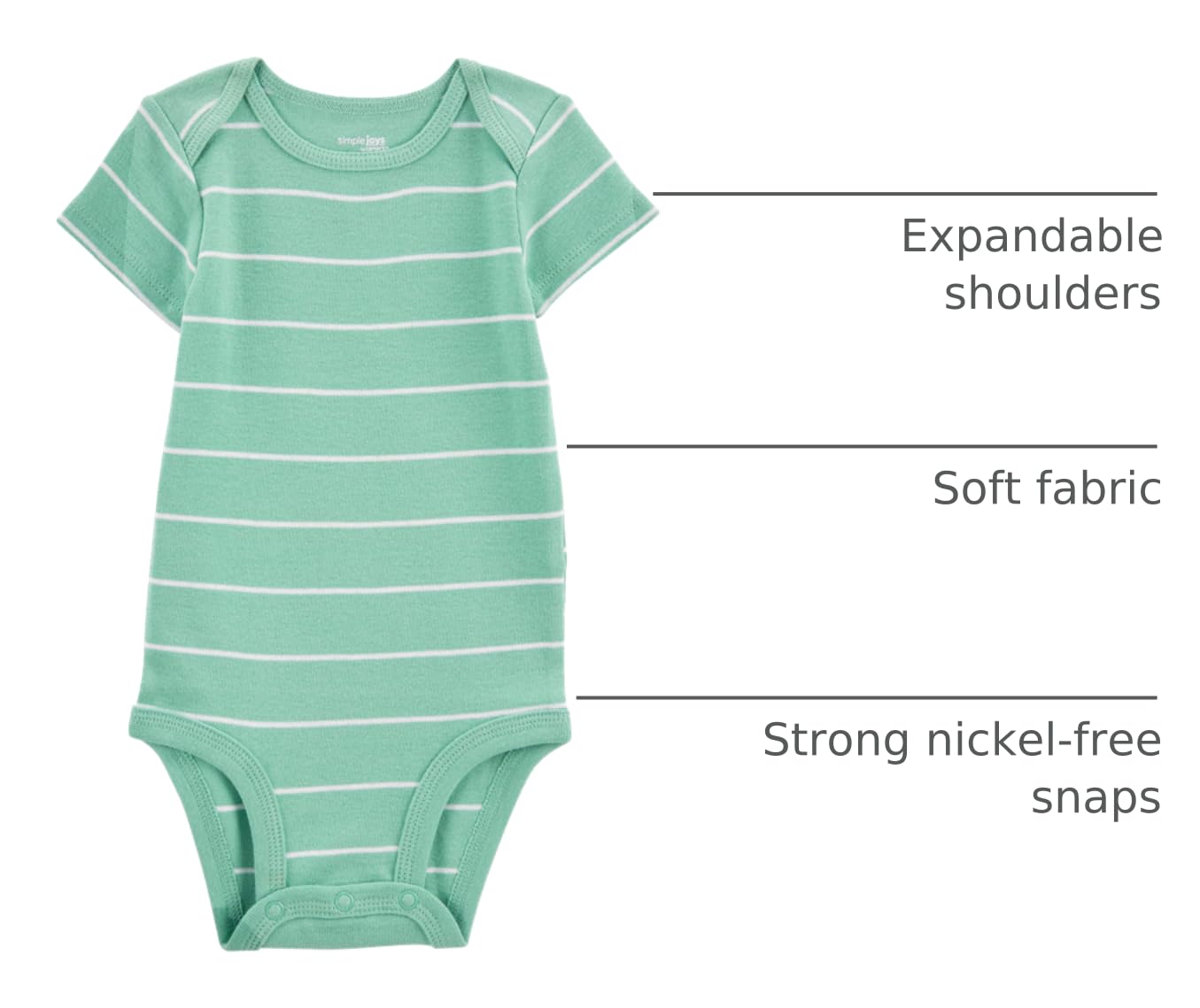 Description Simplify dressing your baby boy with this 6-pack of short-sleeve bodysuits from Simple Joys by Carter's. Each bodysuit features expandable shoulders that make it easy to slip over your baby’s head, while the strong, nickel-free snaps ensure quick and hassle-free diaper changes. Made from 100% soft and breathable cotton, these bodysuits are gentle on your baby's skin and perfect for everyday wear. The tagless design eliminates irritation, keeping your baby comfortable all day long. With OEKO-TEX Standard 100 certification, you can trust that these bodysuits are safe and free from harmful substances. Available in a convenient 6-pack, these bodysuits provide exceptional value and are designed to mix and match easily with any outfit. Simple Joys by Carter's delivers high-quality, stylish clothing at affordable prices, making this 6-pack a smart choice for parents looking for both quality and value.