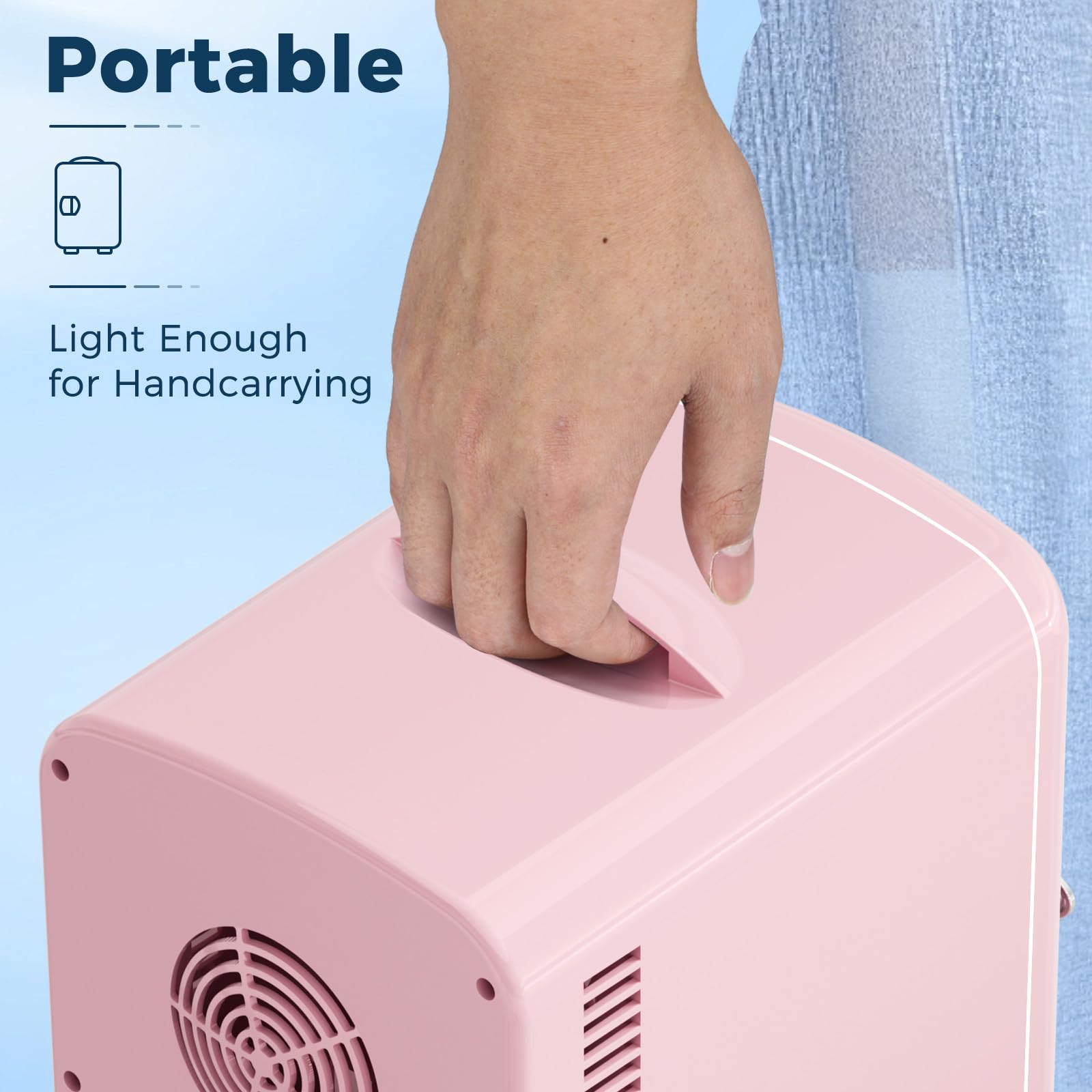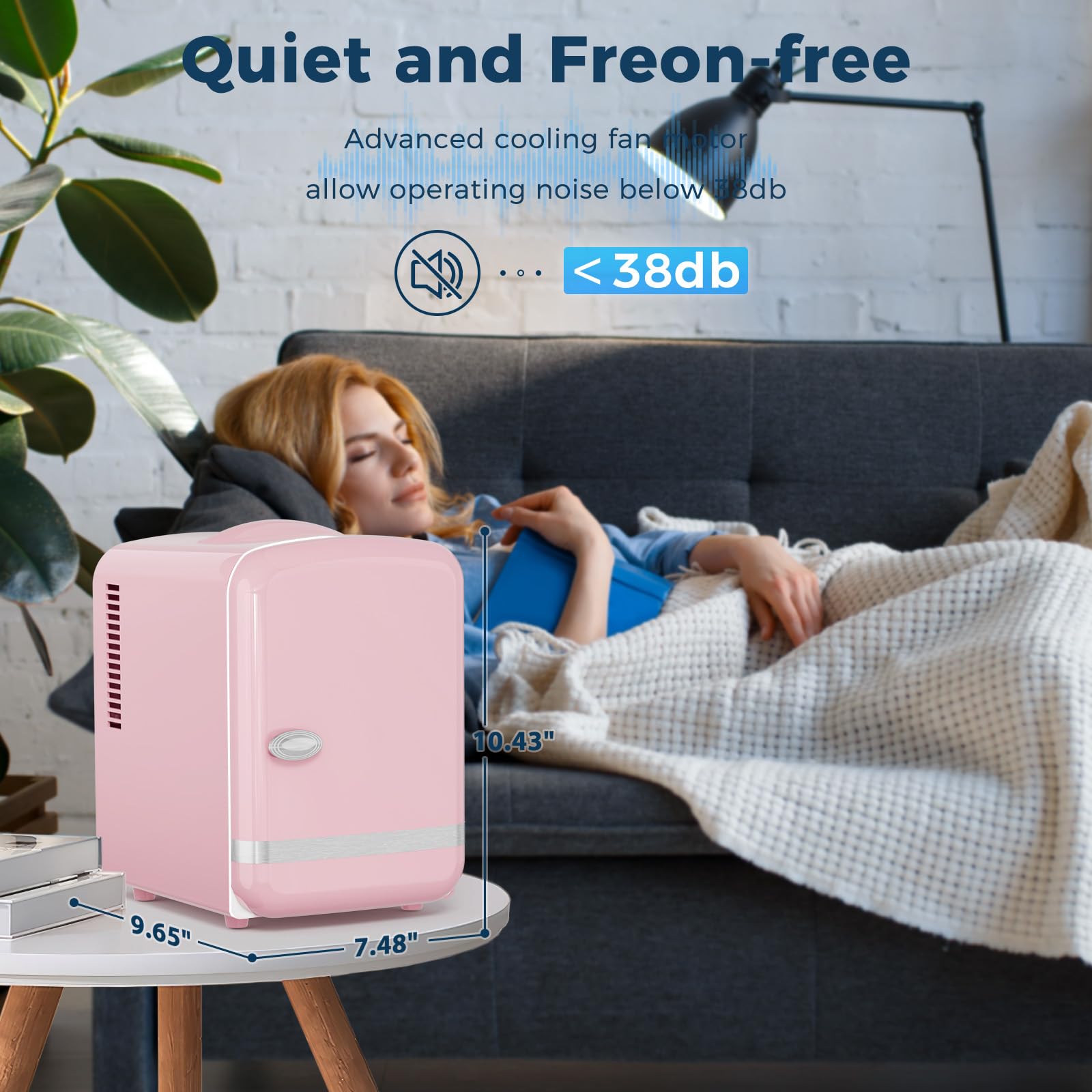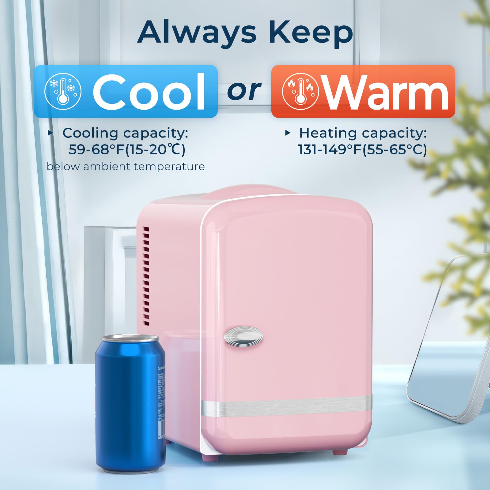 4L CAPACITY: Store 6 can/12 oz with no worry; dimensions are 9.65"D x 7.48"W x 10.43"H; The removable shelf makes the fridge become more flexible to store small items like breast milk, skincare, cosmetic, or food.