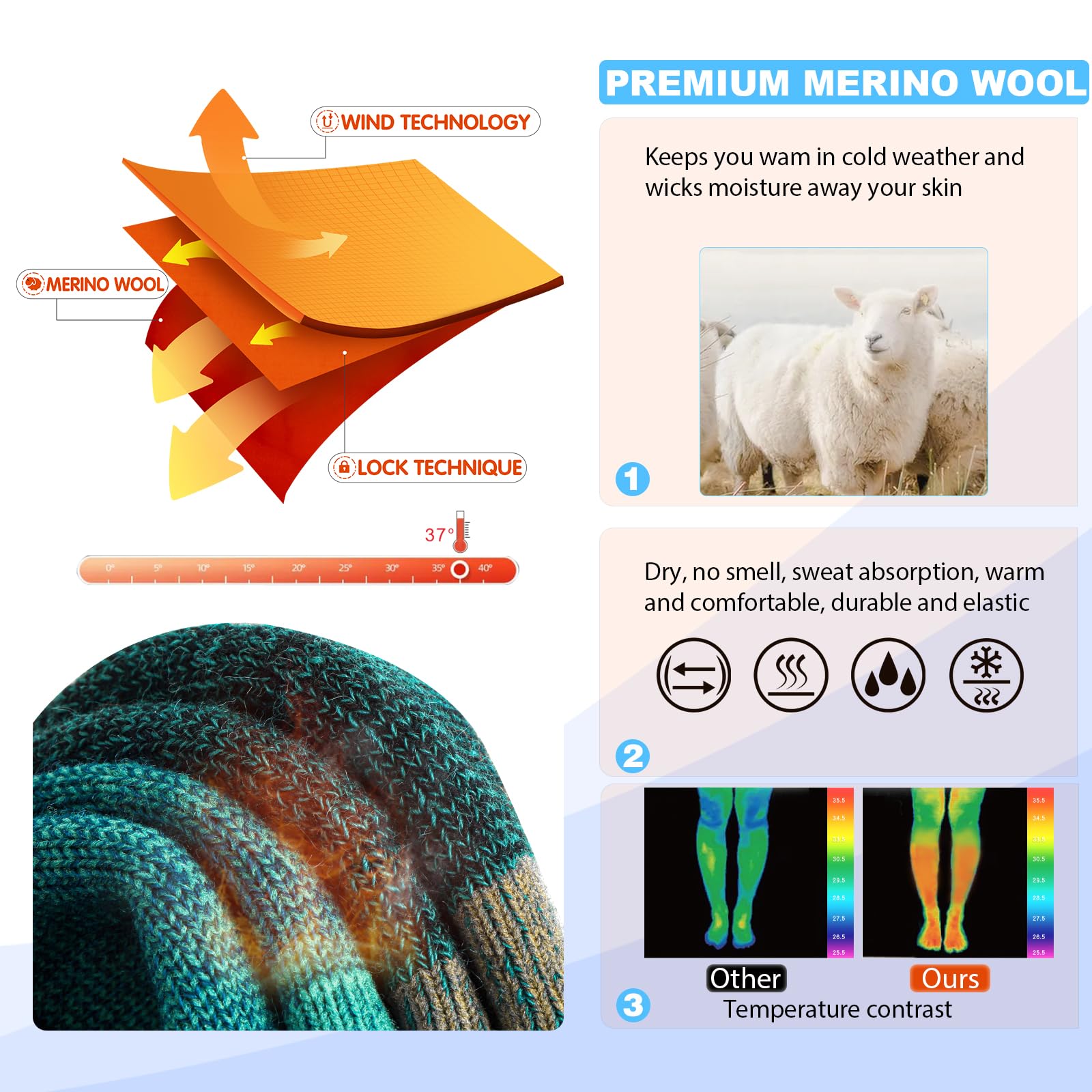 THERMAL MERINO WOOL SOCKS: These cold weather socks have been exclusively manufactured with Thermolite technology combined with natural Merino wool. Merino wool is the most Moisture wicking fabric transports sweat away from your body quickly and offer more breathability. Odor-resistant properties keeps smell fresh, dry and breathable while working, hiking, trekking, camping, hunting, ice fishing or playing winter sports