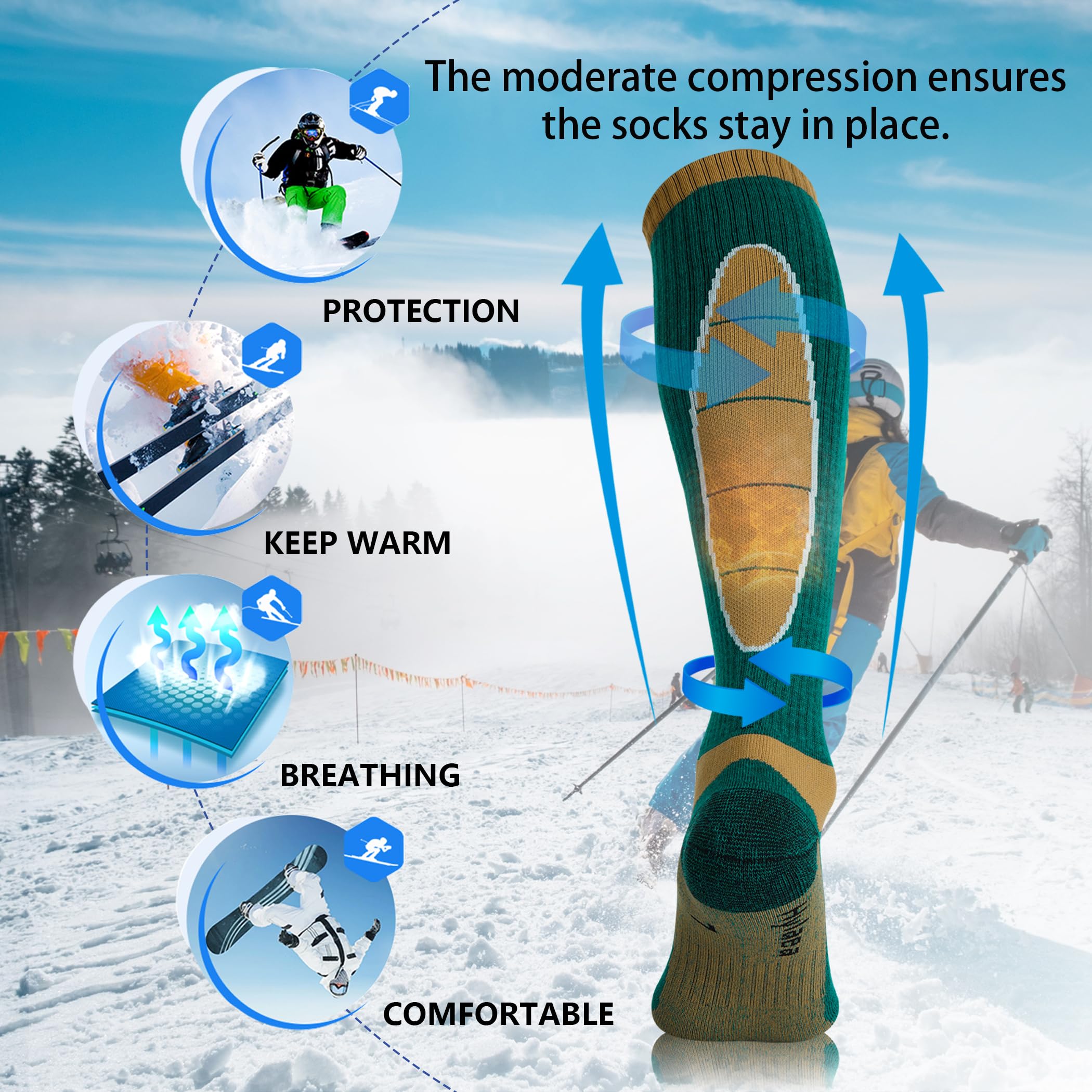 SOFT & COMFORTABLE: These thick-knee high socks feature thick terry loop in forefoot, heel, and toe specifically engineered for minimized friction and shock absorption. The snowboard socks added just the right amount of targeted padding on the front shin area where skiers and riders often need a little more cushion. This ski accessories are great options for skiers and riders who know a great day on the mountain starts with a great pair of socks