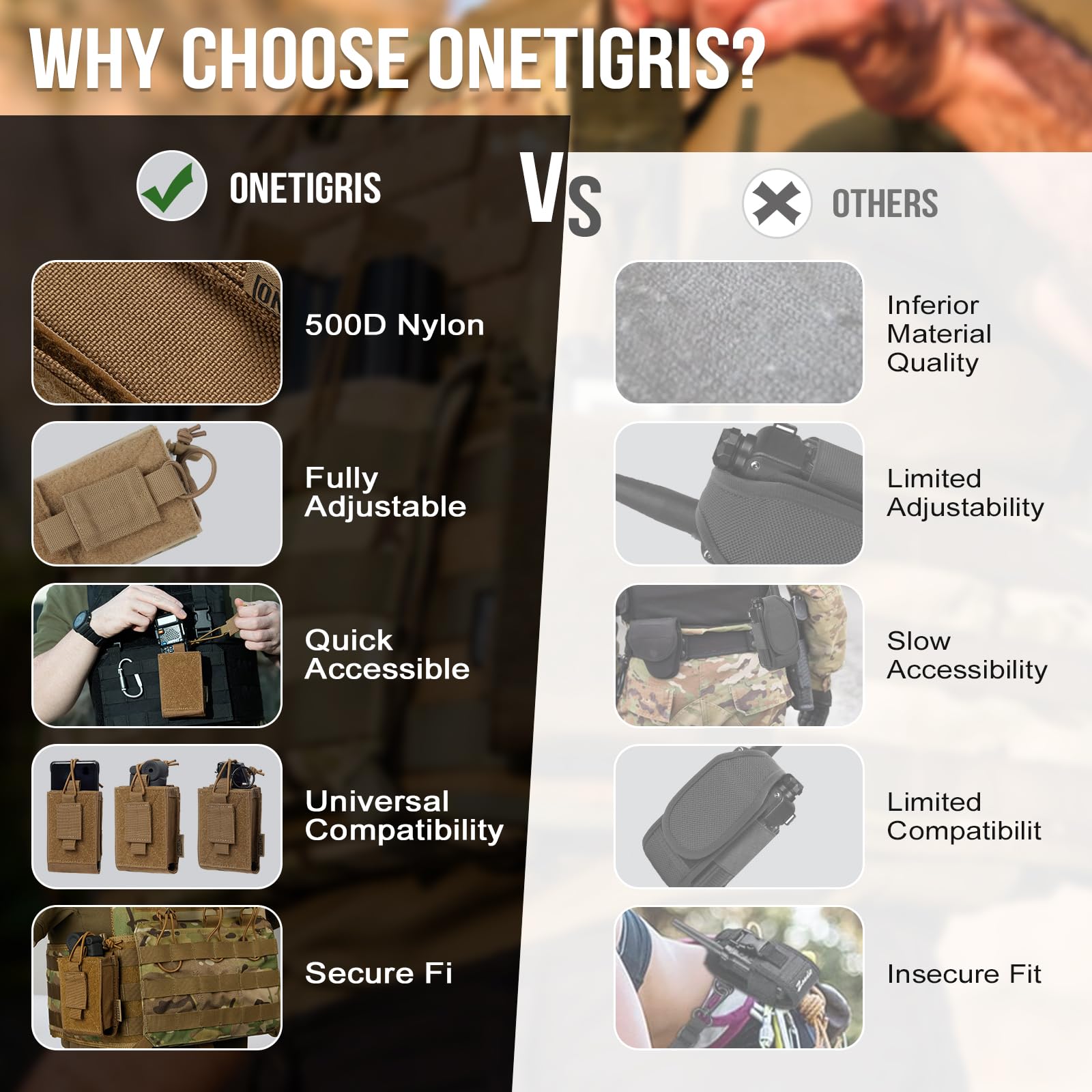 MOLLE Radio Holder: It is PALS compatible with webbing and snap-buttoned straps for modular attachment to gear.