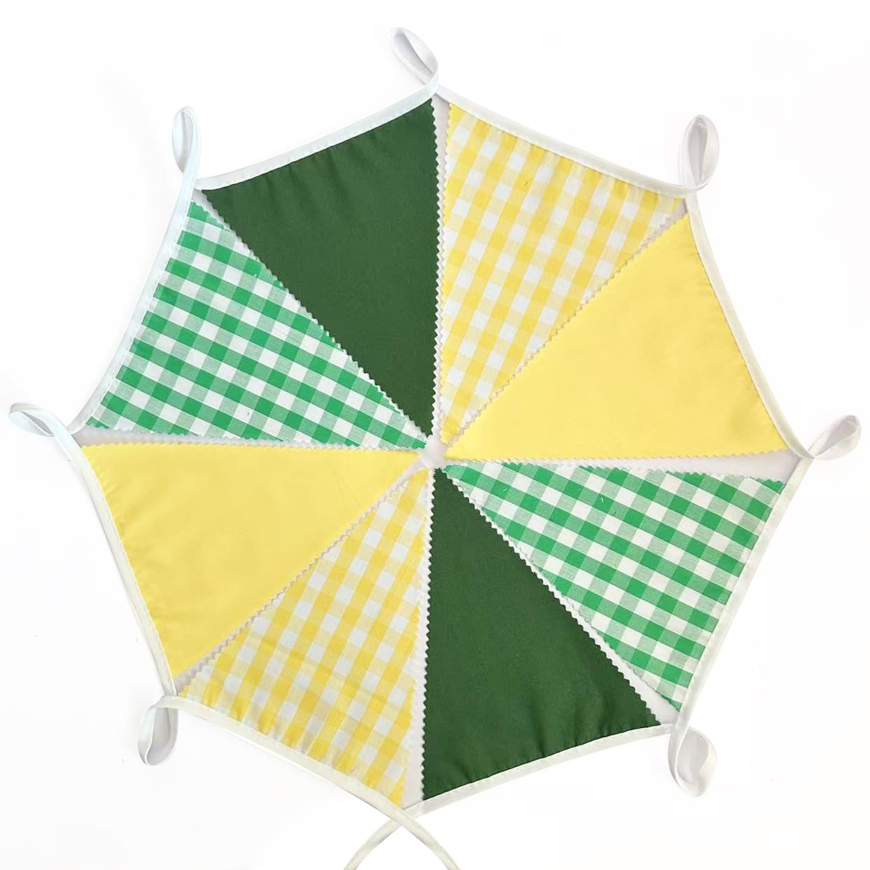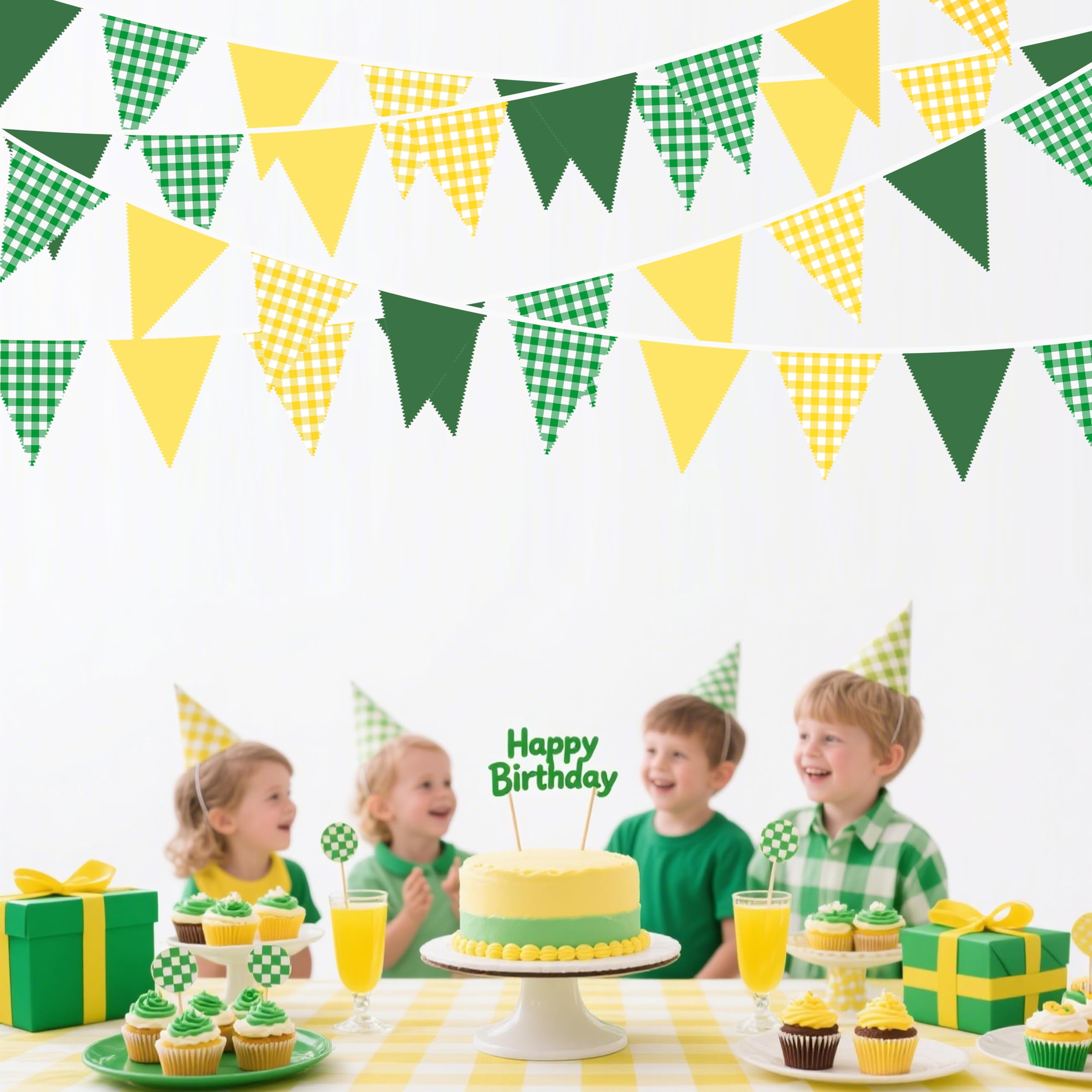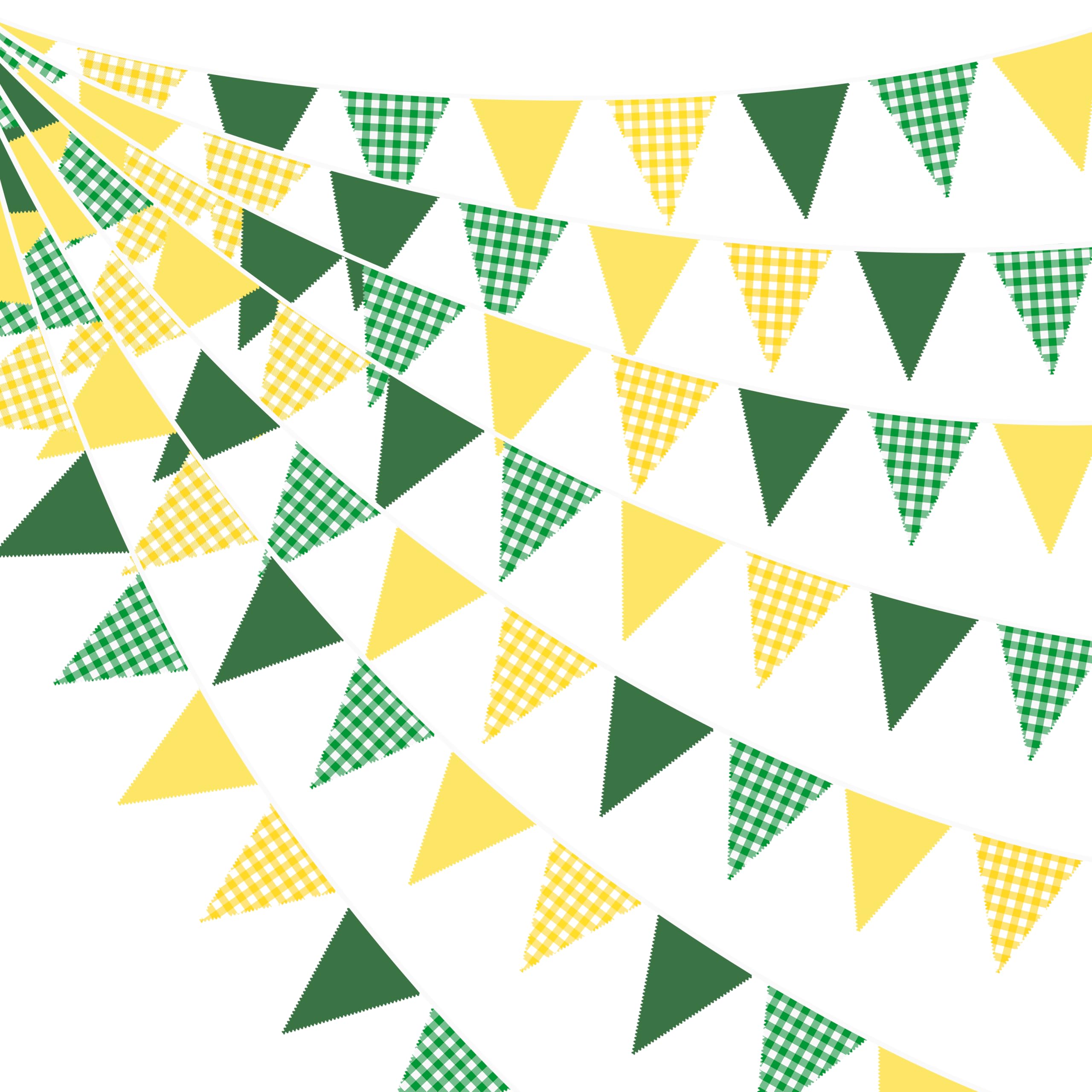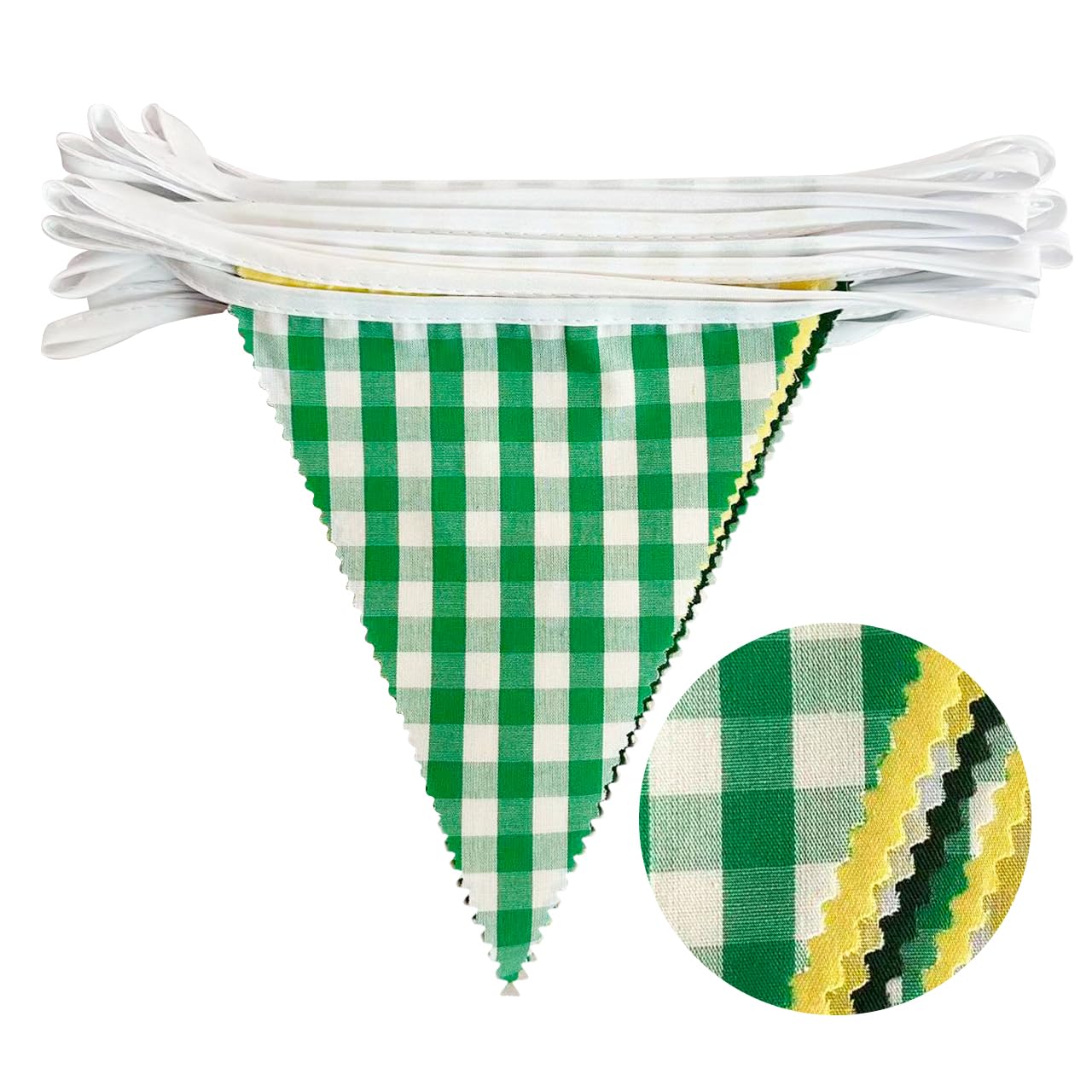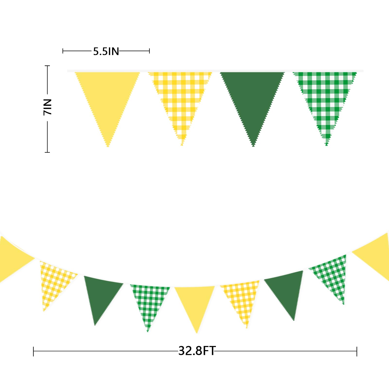 Package Including:1 pack green and yellow buffalo plaid checkered master golf theme fabric bunting banner garland in green gingham, yellow gingham and green yellow colors, with 36pcs flags in 10M/32.8Feet. Flag Size: 5.5in width x 7in height.