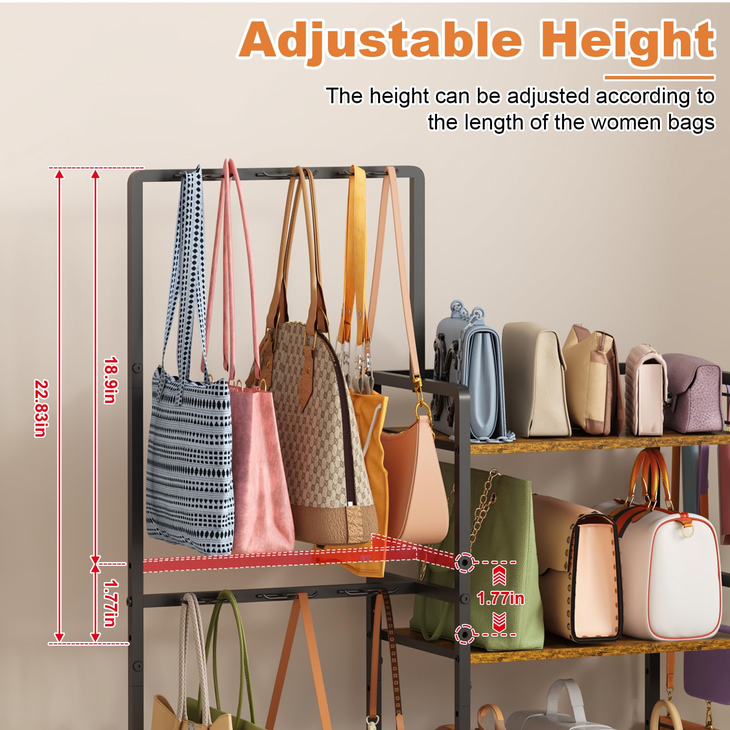 【Humanized Design Details】:Our purse storage organizer is designed to be user-friendly in the details. The 2-tier bag rack on the left can be adjusted to fit the length of your bag. The top shelf on the right has an enclosure to store purses and handbags and prevent them from falling. The three side hooks can be used to store wallets.These bags can be hung at a glance and is easy to access.