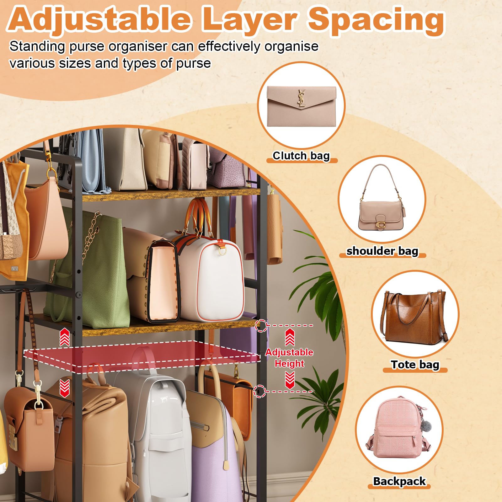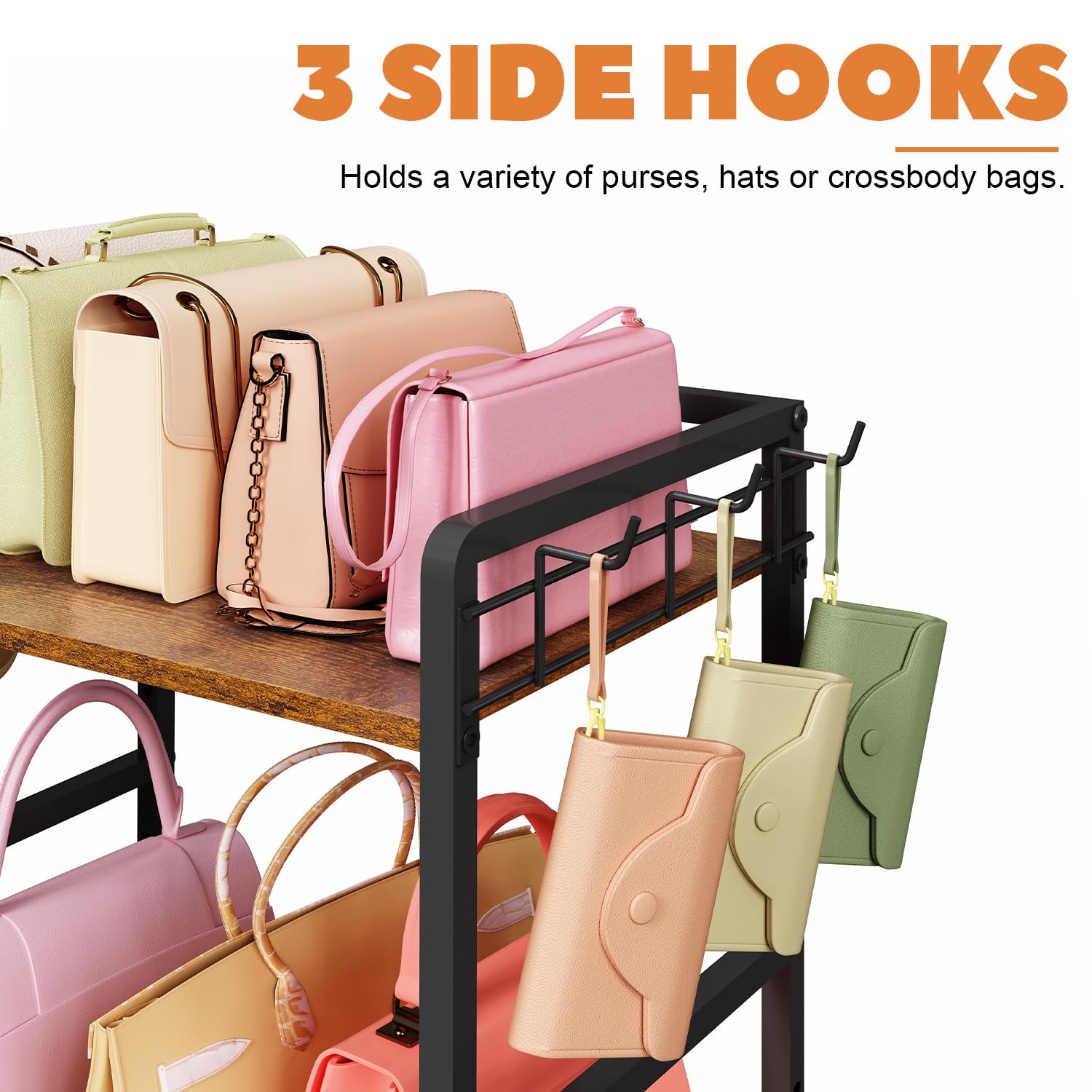 【Powerful Storage Functions】:This is a standing purse organizer shelf with powerful storage functions. There are 2 layers of hooks on the left side, each layer has 6 hooks, which can fully store every beloved bag you have. On the right is a 3-layer purse storage rack with a fence on the top. It can easily accommodate bags of various sizes and styles. Whether it's a small handbag or a spacious backpack, you can find a suitable location.It is good purse organizer closet systems.