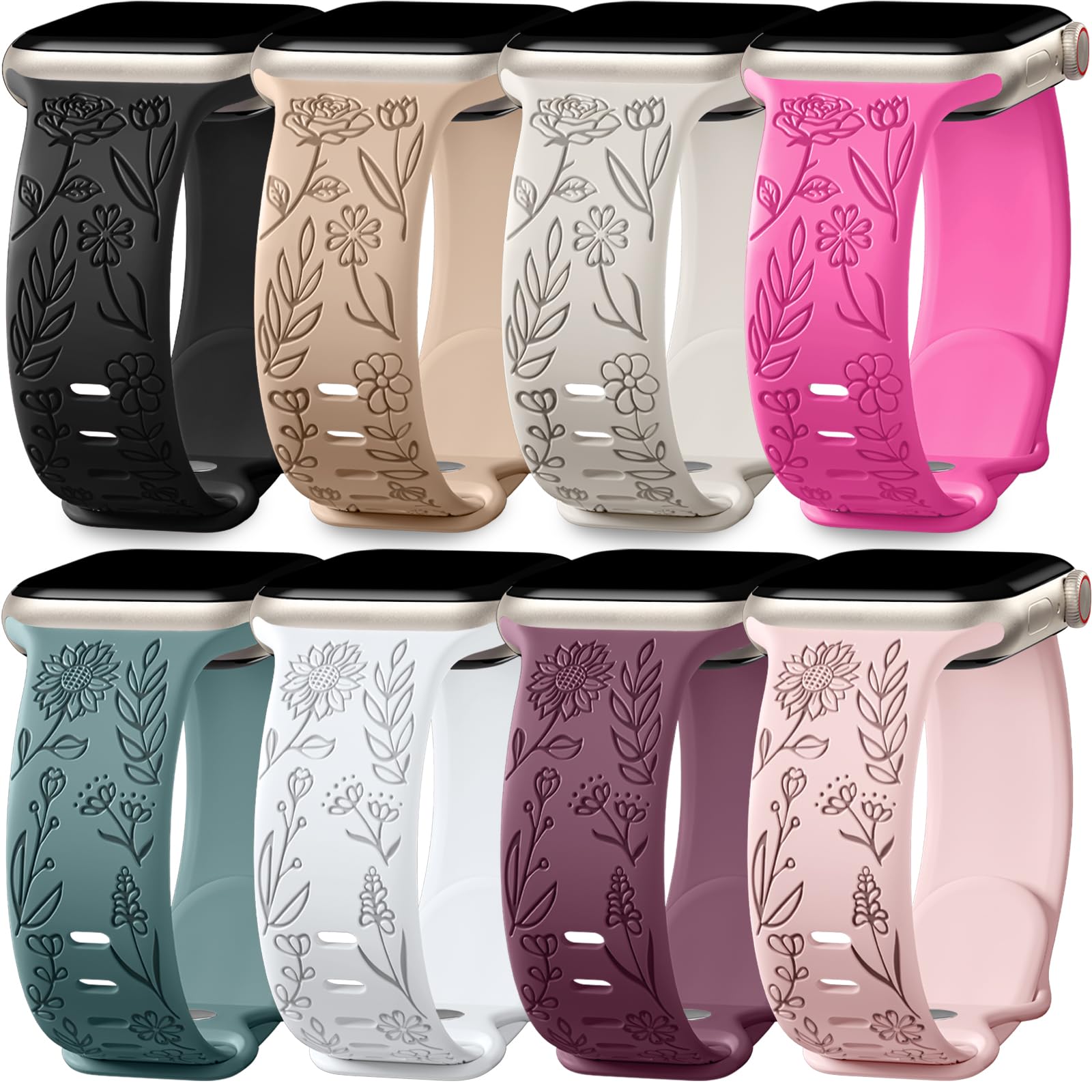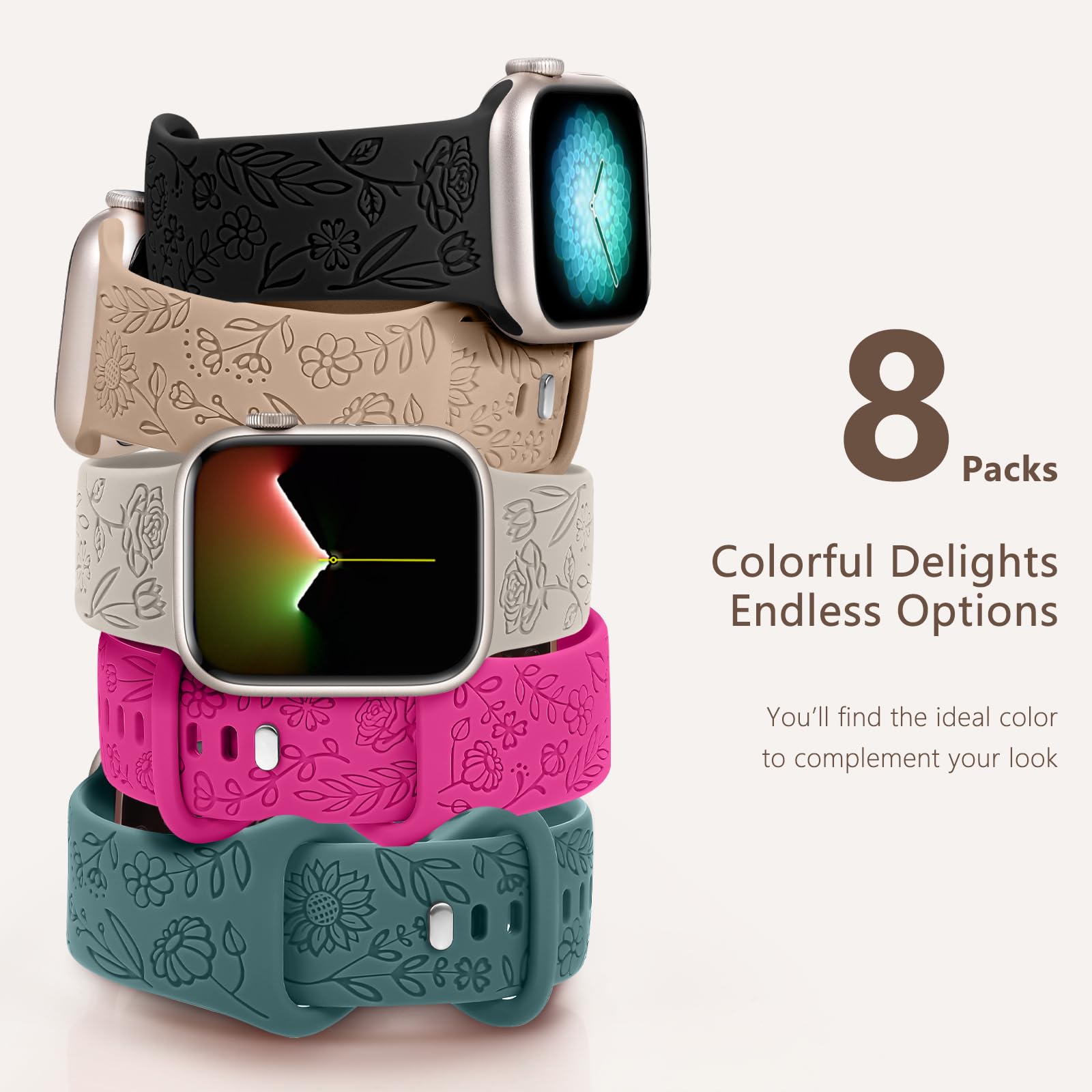 ✅ Floral Elegance for Your Apple Watch: Elevate your Apple watch style with our 8 pack floral engraved iWatch bands. Featuring intricate rose and cheerful sunflowers, they combine expert craftsmanship with trendy colors. Perfect for formal elegance and a touch of modern flair for casual wear