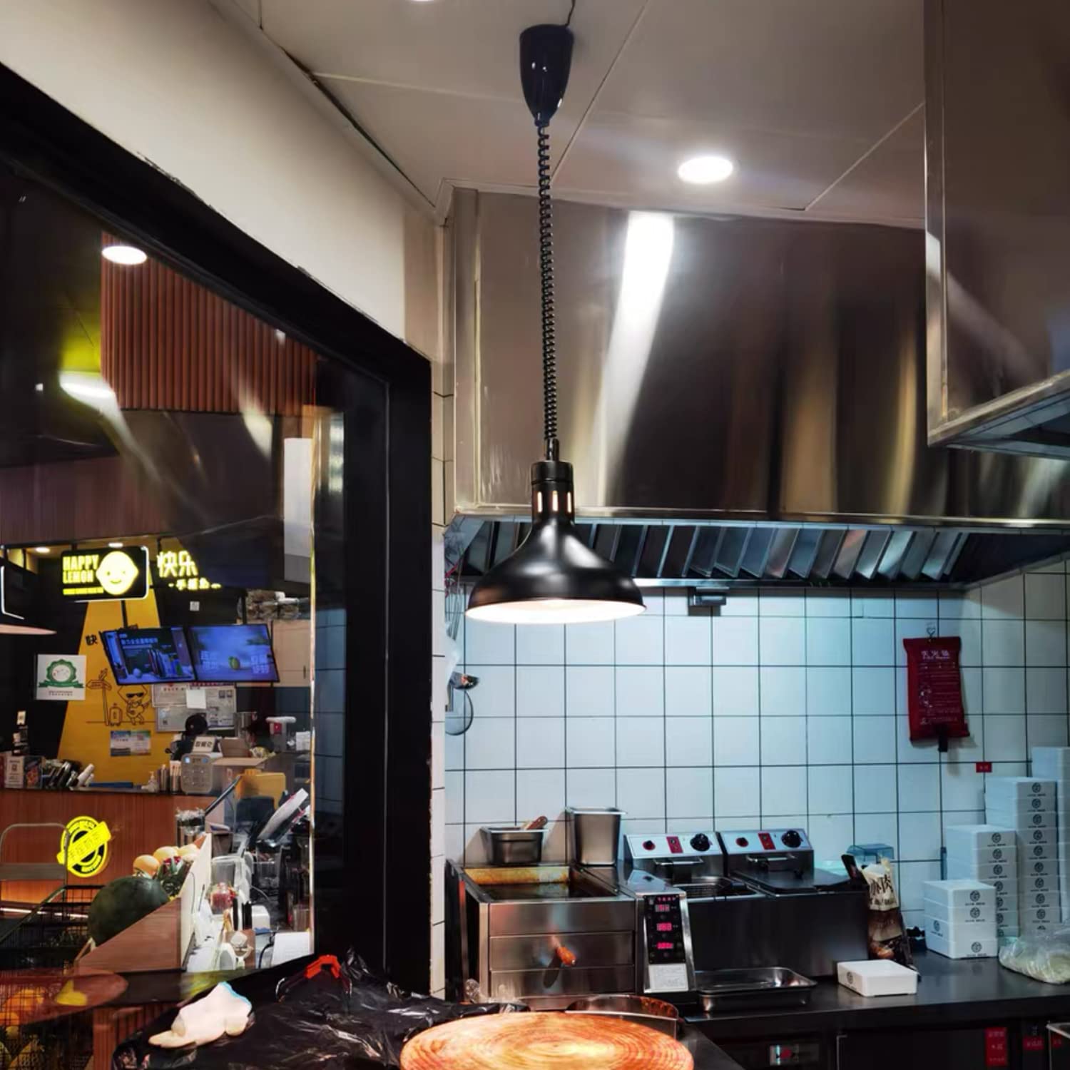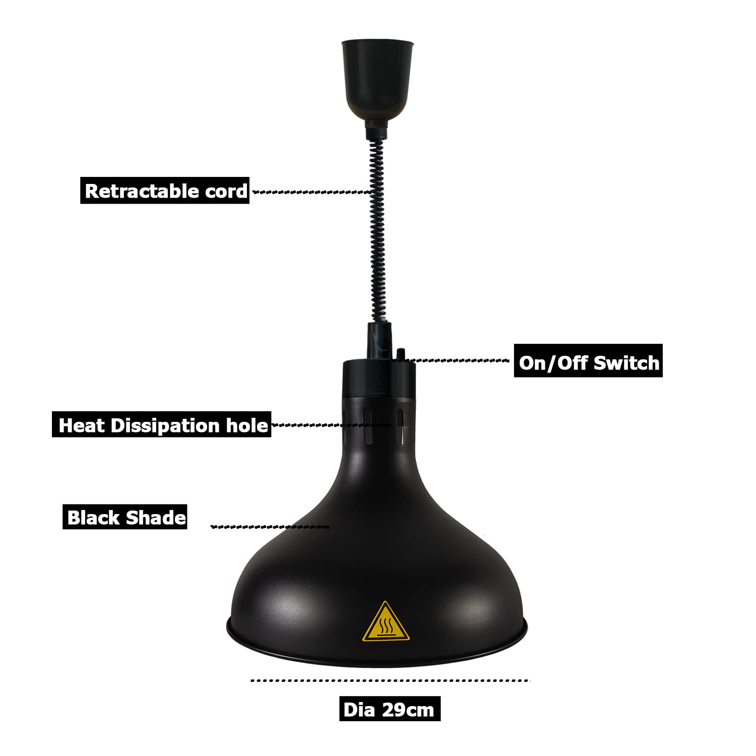 black heat lamps for food hanging food heat lamps will keep food at the perfect serving temperature ideal for use in any commercial kitchen,buffet,restaurant,snack bars Product Specification Diamter:290mm Rang of cord:600 to 1500mm Lamp Wattage:250W Voltage:110V/60Hz Packing Include 1xblack food heat lamp 1x250 watts food heat lamp bulb
