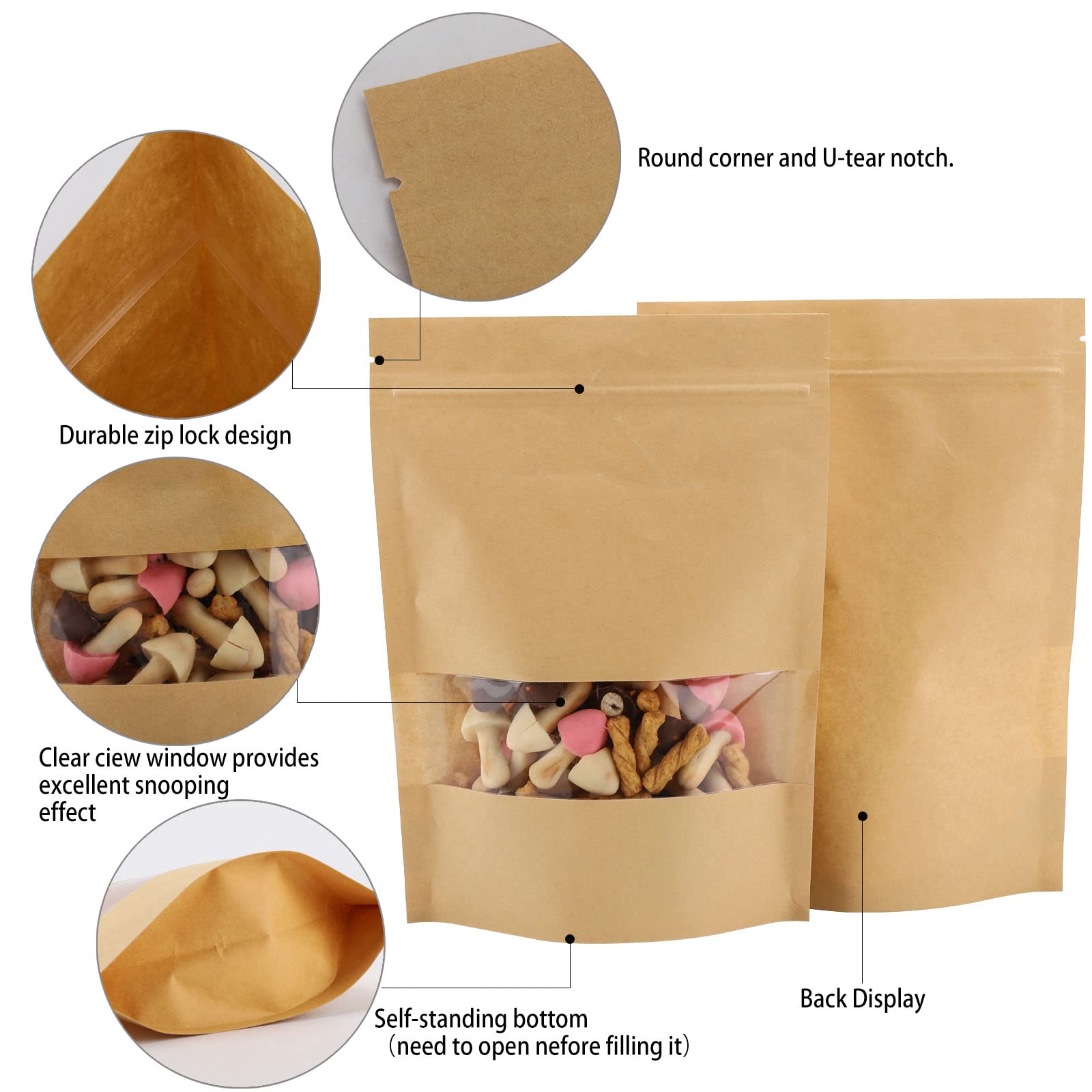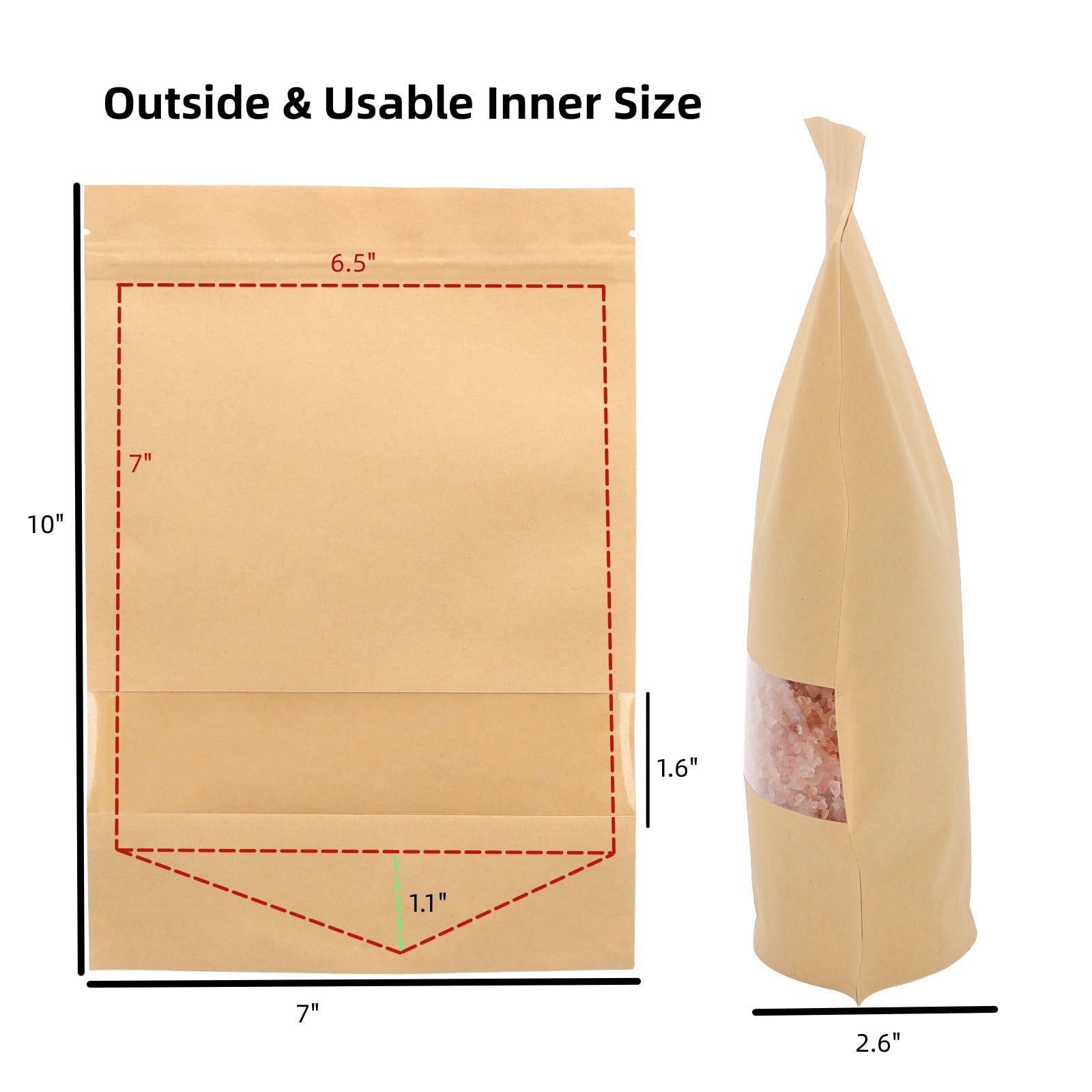 What You Get: 100 pack ziplock paper bags with window, outer size 7 inch x 10 inch, inner size 6.5 inch x 7 inch; Perfect large usage size food bags for packaging herb, bath salt,dried fruit