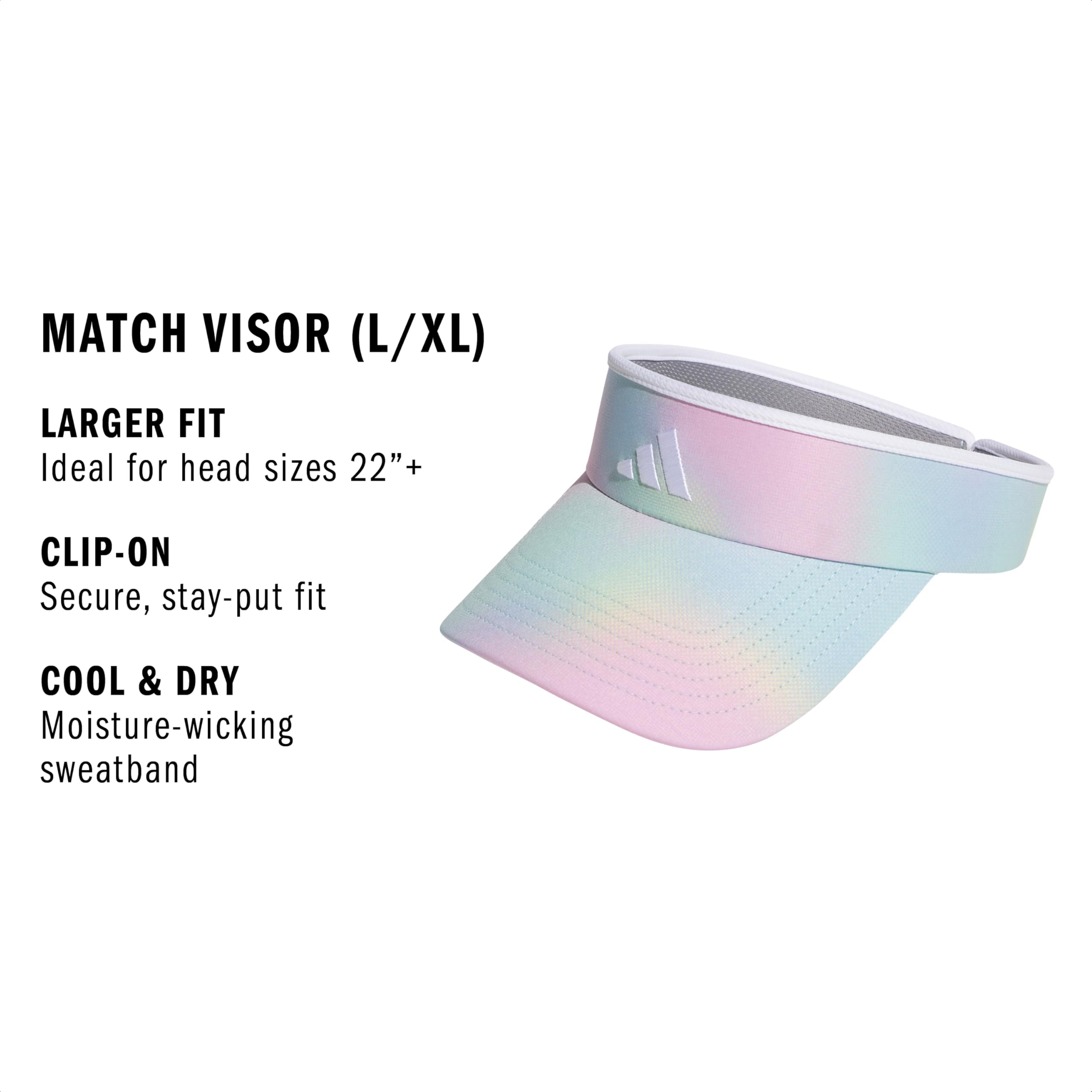 Description Keep glare and hair out of your eyes wearing this women's adidas Match 2 Visor. Its lightweight, one-size-fits-all design provides full brim coverage for the court, the beach or wherever. Sweat-wicking material keeps you dry through game, set and match.