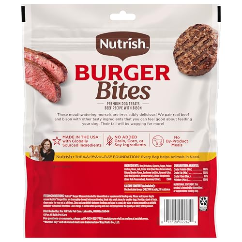 Product Description Your pup deserves pet treats that are as tasty as they are wholesome—like Nutrish Burger Bites Beef Recipe with Bison, great for all dog sizes, life stages and breeds. These soft dog treats are made with real beef as the #1 ingredient and packed with savory flavor that’ll have your dog’s tail wagging. Perfect as training treats for dogs of all sizes, life stages and breeds, everyday treating or just as dog snacks, they’re made in the USA with globally sourced ingredients and contain no added corn or soy ingredients and no by-product meals. Plus, the resealable bag helps keep every treat fresh. Pick up some grain free dog treats today and a portion of your purchase will help animals in need through The Rachael Ray Foundation. Manufacturer Contact Information Post Consumer Brands, 20802 Kensington Blvd, Lakeville, MN 55044