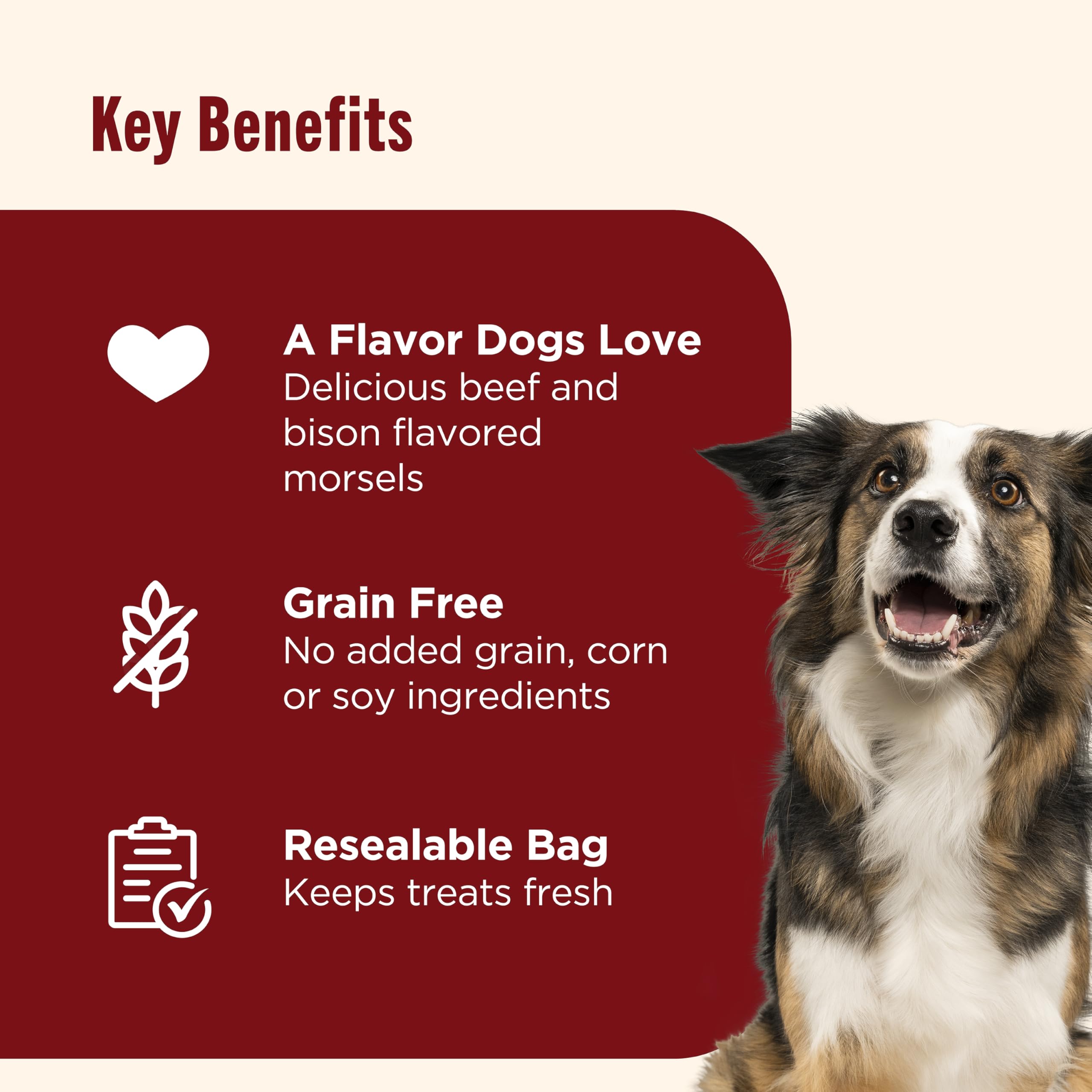 Contains one (1) 12-ounce pouch of premium dog treats with real beef and bison