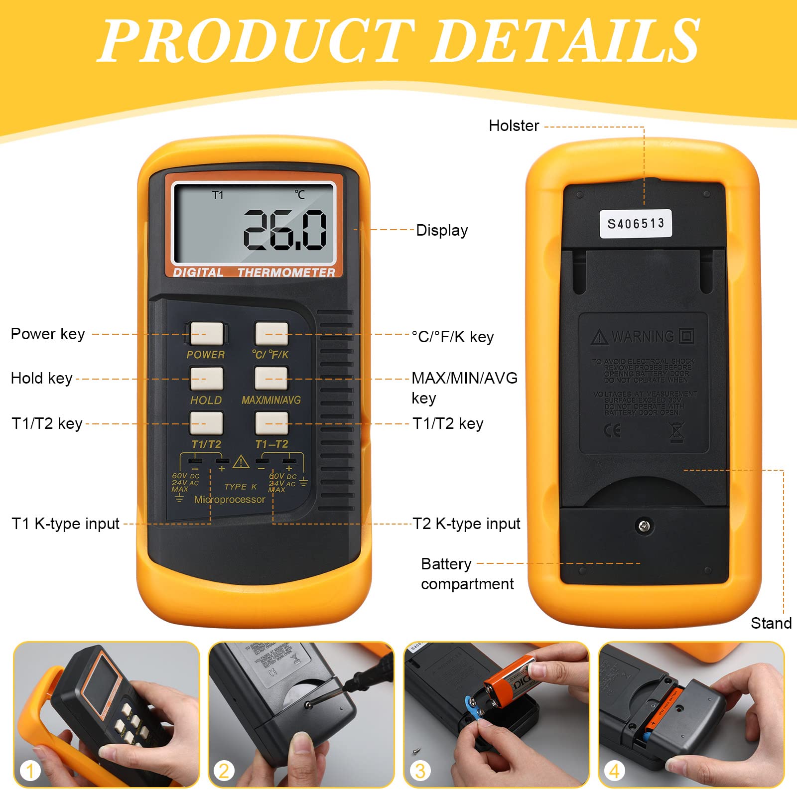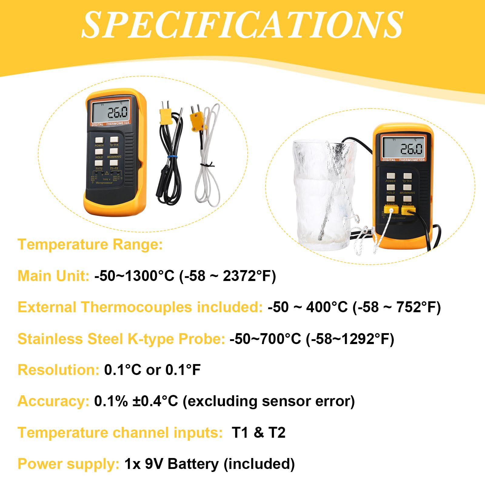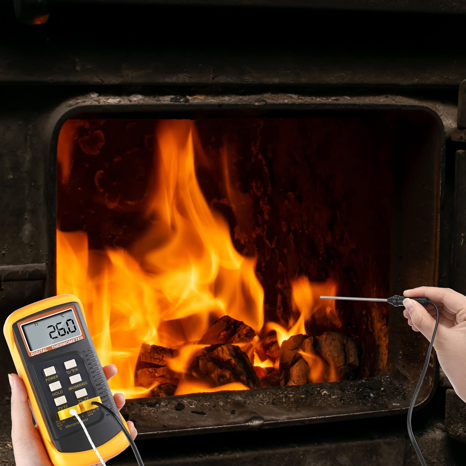 Wide Measurement Temperature Range: mainframe range of digital k type thermometer is about -50°C to 1300°C (-58°F to 2372°F); The included wire thermocouple is about -50 to 400°C (-58 to 752°F) with °C, °F and K temperature modes; The stainless steel K probe is about -50 to 700°C (-58 to 1292°F)