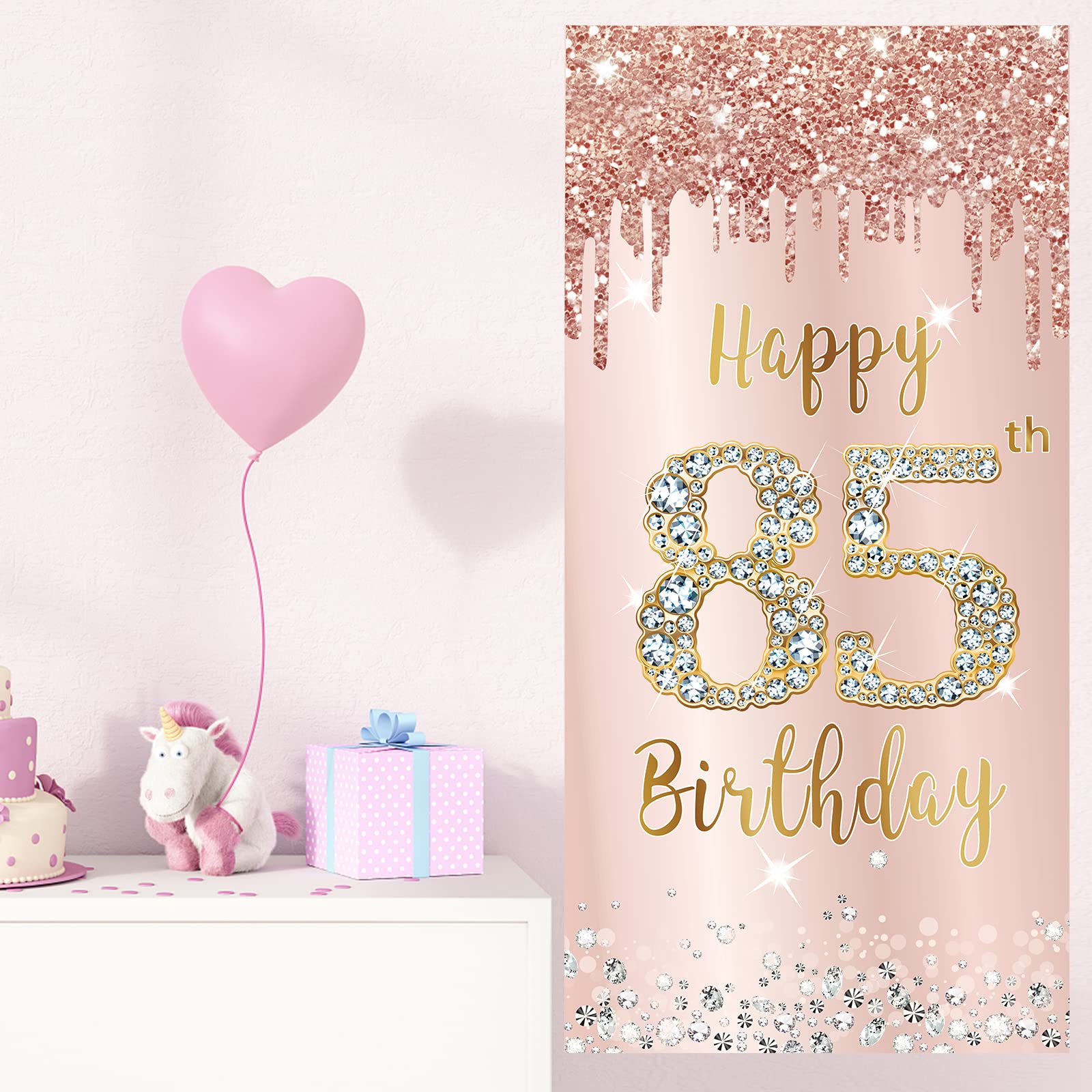 [New design] - This is a door banner decoration specially designed for 85-year-old women’s birthday party, using elegant rose pink as the background color, with the number "85" covered with shiny diamond elements and flashing Stars and shiny rose gold pink diamond party elements, the design is very beautiful and novel, which can add gorgeous decoration to your birthday party.