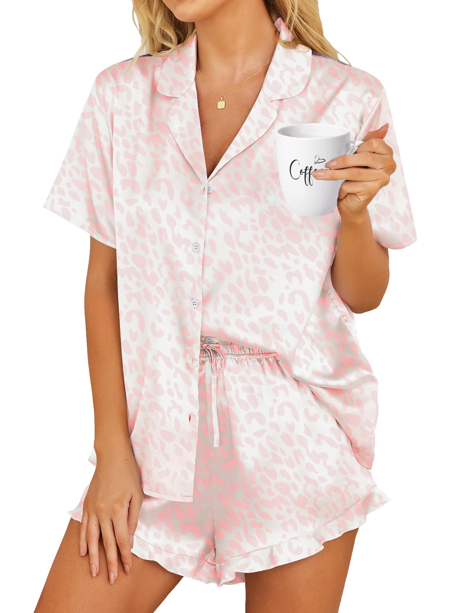 【Unique Fashion Designed】Silk pj set for women, Short Sleeve: Classic Notch Collar, Full Button Design is easy to put on and take off. Pajama shorts: Ruffled design, Bow tie decor, high & elastic waist. Cute satin pajamas set will give you more comfortable and freedom feeling when you wear it.