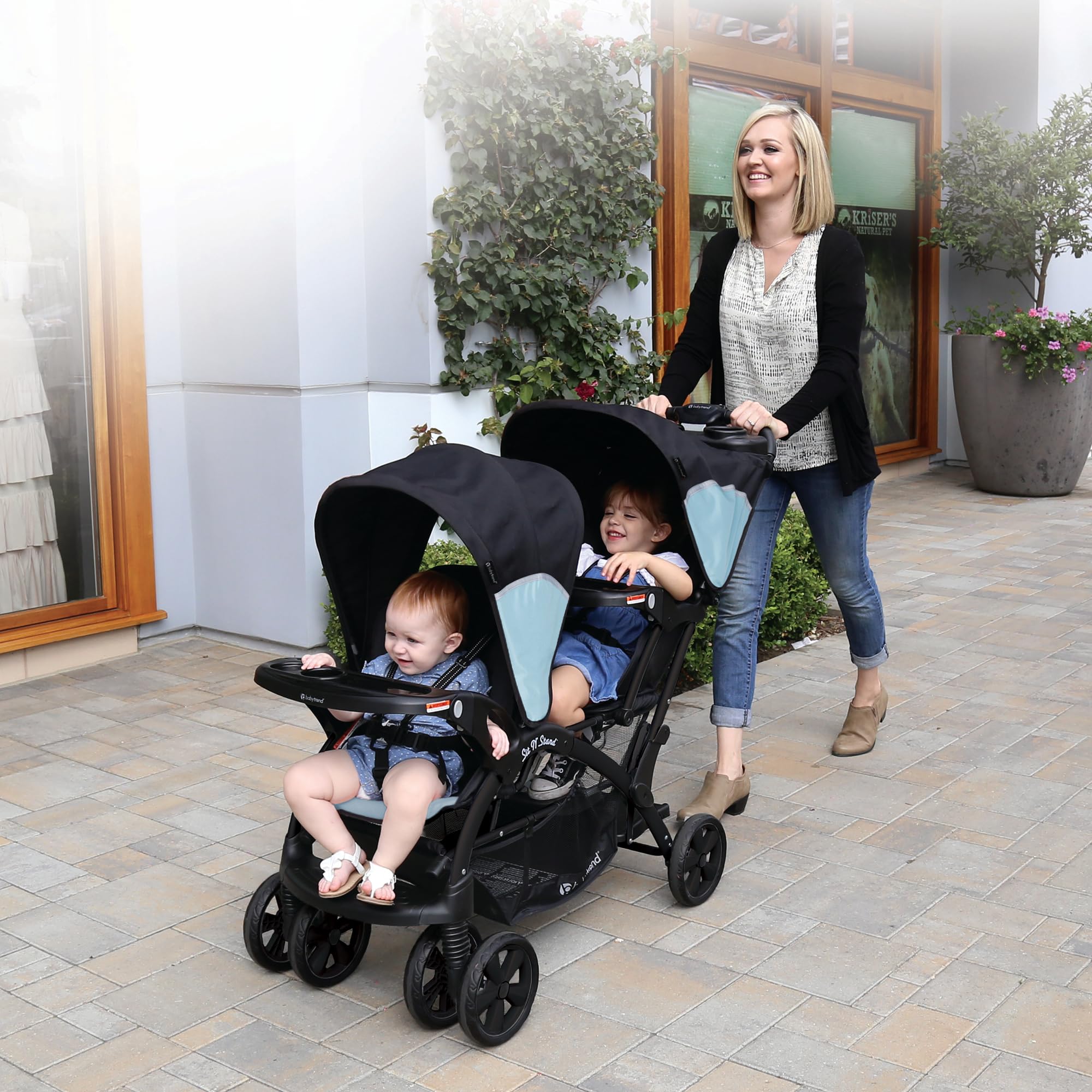 Experience the ultimate in versatility with the Sit Nâ Stand Double Stroller from Baby Trend. It comfortably seats two children, and the rear seat can be removed for use of the included jump seat or standing platform. The two ratcheting canopies provide excellent sun protection for both of your passengers. The parent tray features 2 cup holders and a covered storage compartment for small incidentals and the roomy storage basket holds larger items. Both full-sized seats are equipped with reclining seatbacks, child trays with cup holders, and 5-point safety harnesses. The padded jump seat also includes a 3-point safety harness. The 8" EVA tires provide a smooth, comfortable ride and the lockable rear wheels provide stability on command. After your excursion, the Sit Nâ Stand folds compact for convenient transport or storage.