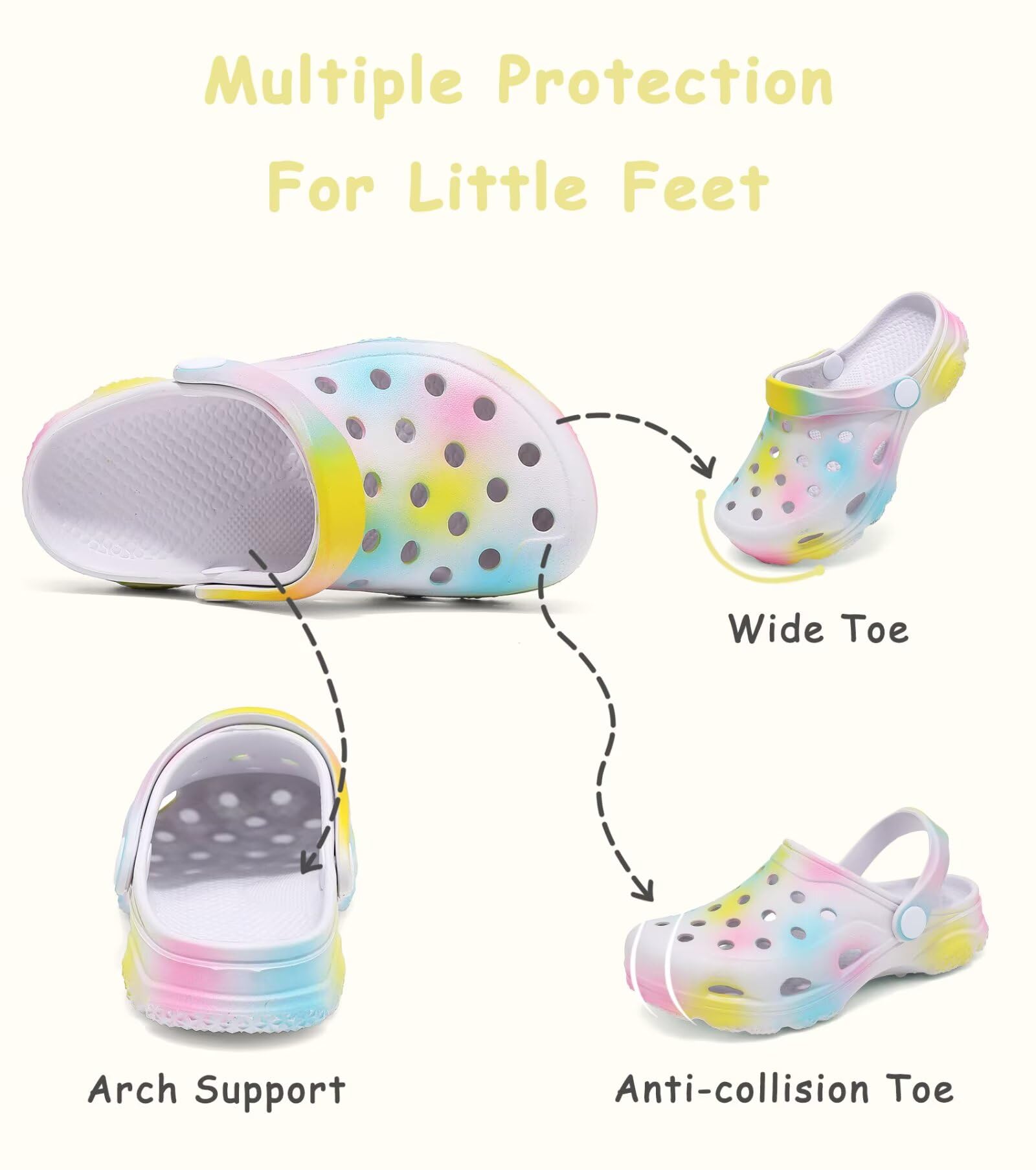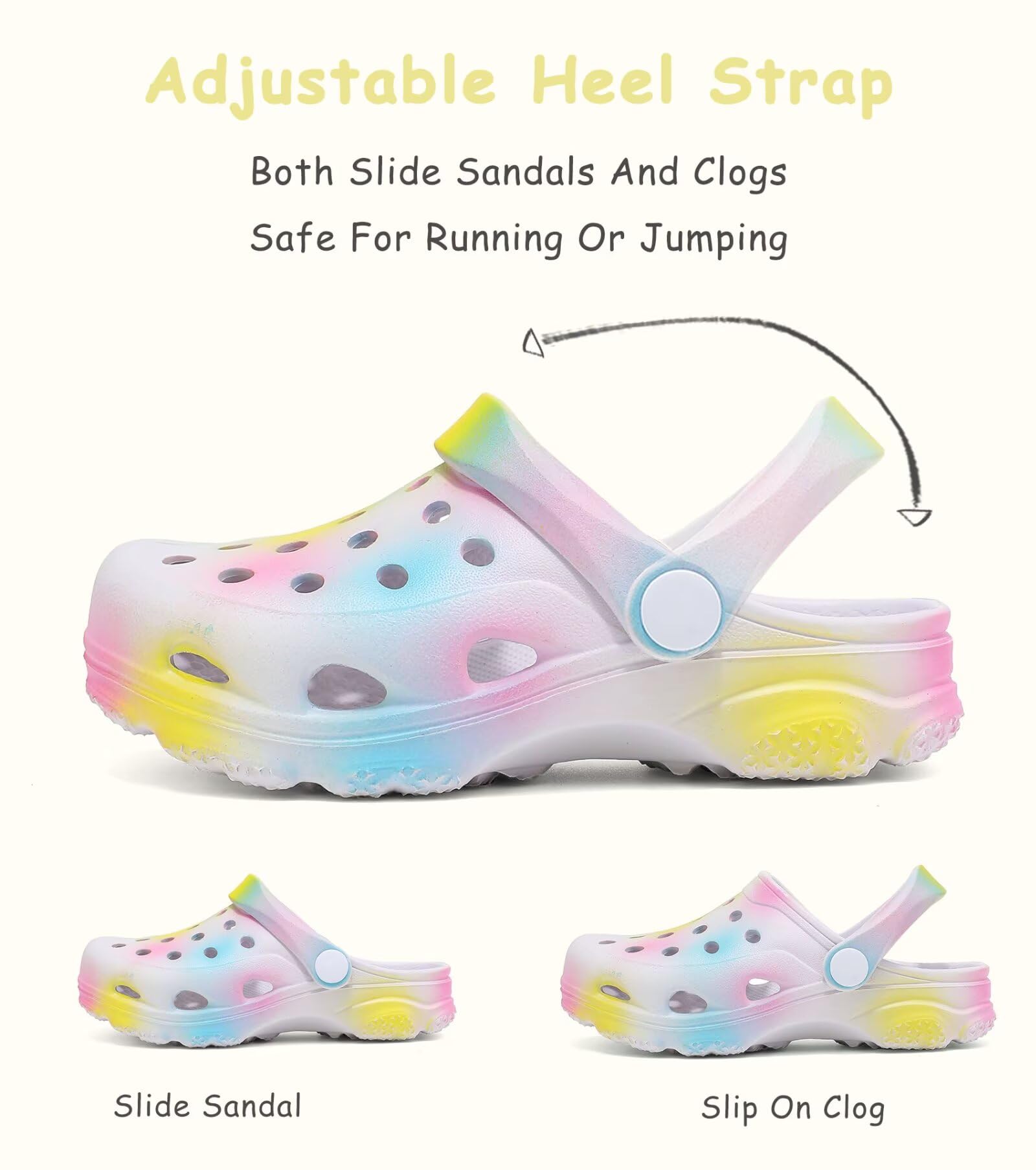 Stylish Appearance: We offer a variety of style for you to choose from: tie dye, camo, spider, high shine, rainbow. Step out in style with kids clogs that effortlessly blend fashion with comfort.