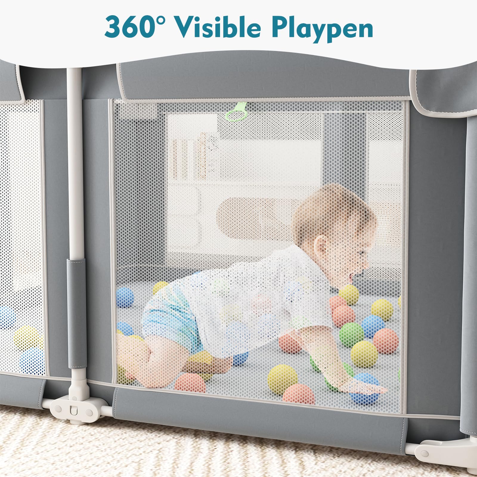 360° Panoramic Design: This baby playpen features a 360° transparent mesh design, allowing parents to easily monitor their baby's activities and ensure safety. Whether the baby is playing or sleeping, parents can always keep a clear view of their little one for constant protection