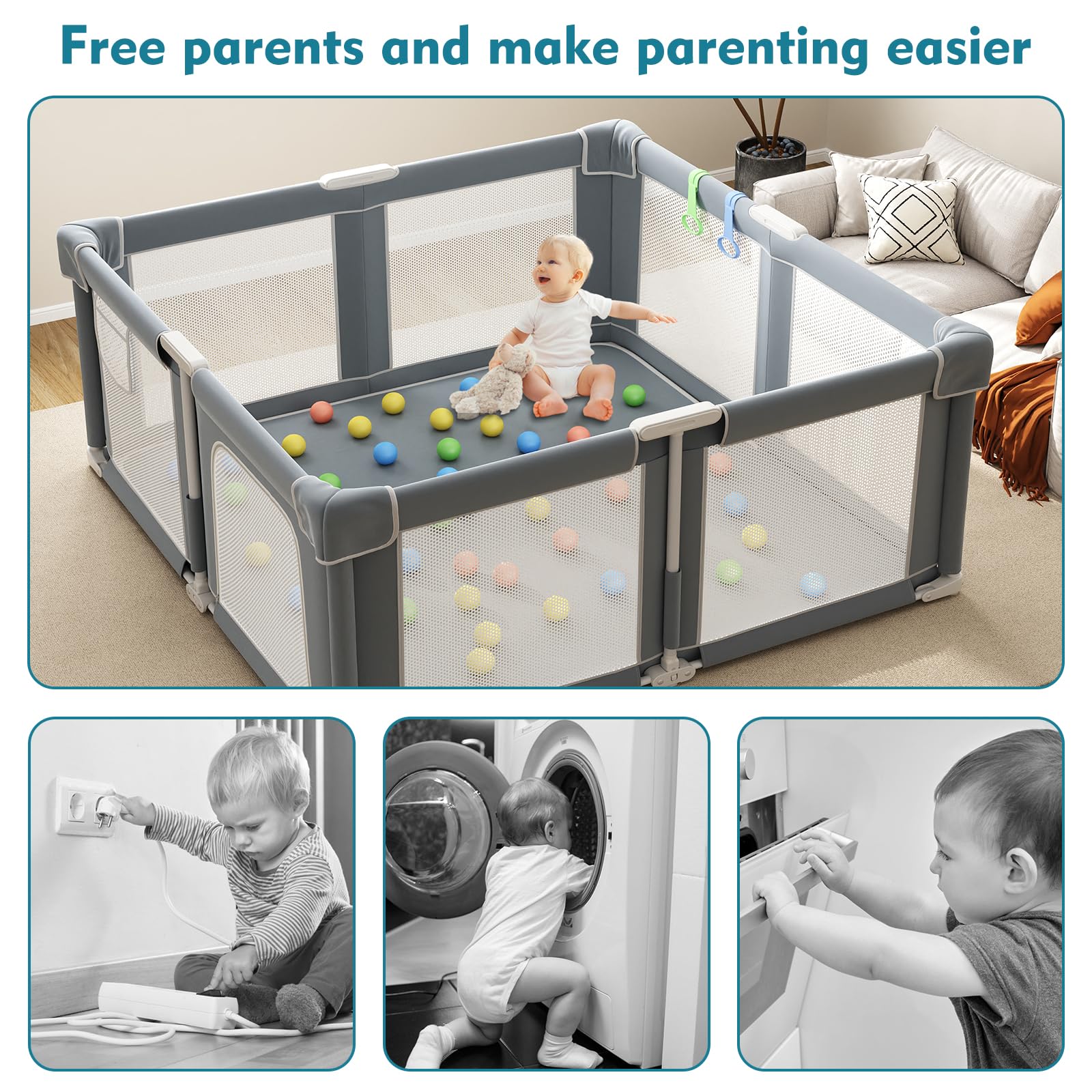 Soft, Easy-to-Clean Protective Mat: The playpen is equipped with a waterproof, soft mat that is machine washable or wiped clean with owel, providing a hygienic play environment for baby. Its soft and comfortable mat effectively cushions impacts from hard floors, enhancing safety and comfort