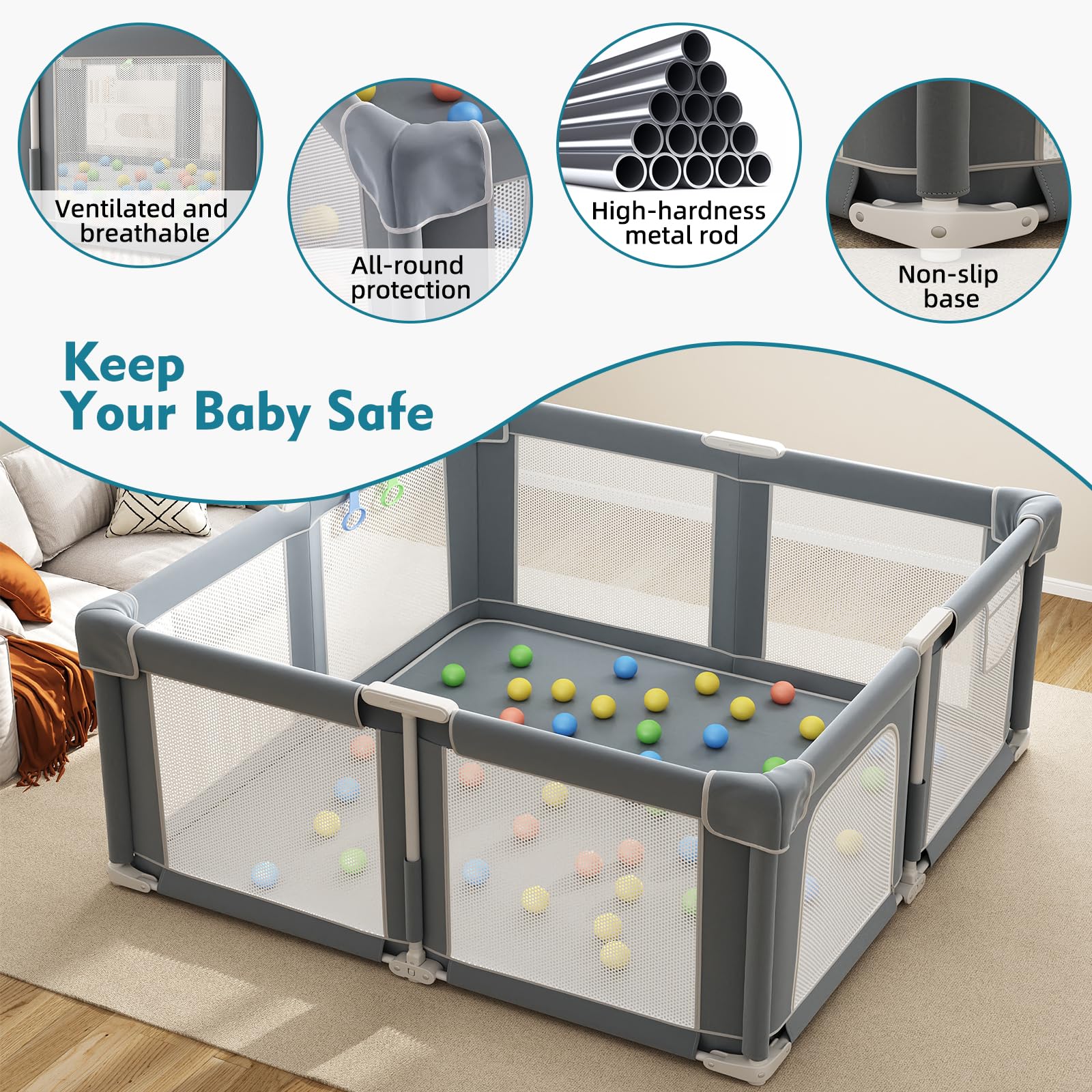 Stable, Safe, and Eco-friendly: The playpen is constructed with thickened steel frames and features a slip-resistant base to ensure your baby's safety. It is made of thickened, non-toxic 300D Oxford fabric, with handles that include thick sponge padding for comprehensive protection of your baby