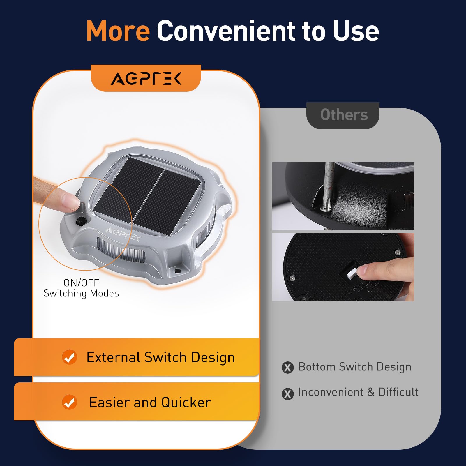 【External Switch & One-Button Operation】Adopts external button design, more easier to use than bottom button design solar driveway lights. One button controls ON/OFF and mode switching, no more complicated button operation. (Note: Please turn the switch on and fully charge it before first use.)