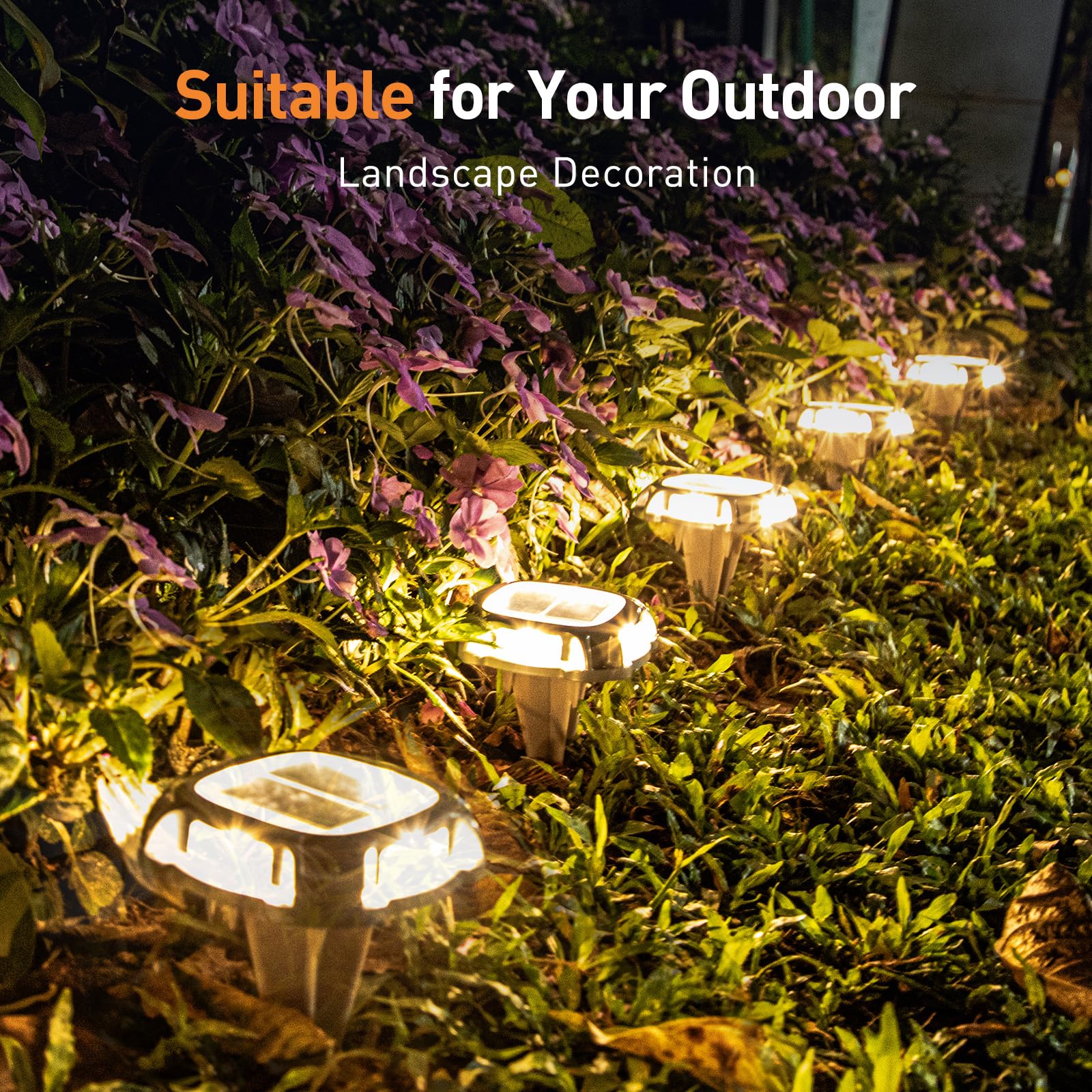 【Easy Installation & Wide Applications】Both Ground Spikes & Screw Mounting are supported, fits for more scenes. You can easily put these solar lights on lawn, flowerbeds or the sides along the pathway with ground nails, also can use screws mounting on the hard floor like walkway, concrete driveways, pavers, steps, sidewalk and wooden deck dock etc