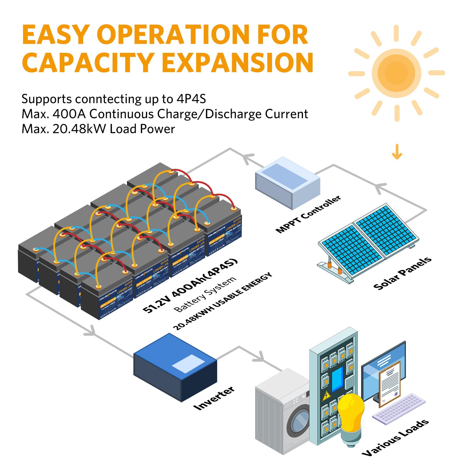 [Easy to Expand]: Need more battery capacity to meet your power needs? Our lithium trolling motor battery provides the flexibility of series or parallel configuration, allowing users to easily increase voltage or capacity as required. You can connect up to four batteries in series or parallel to achieve a total capacity of up to 51.2V 400Ah. This deep cycle battery can handle a heavy load output of up to 100A continuous discharge, making it ideal for off-grid outdoor applications, such as RVs and more