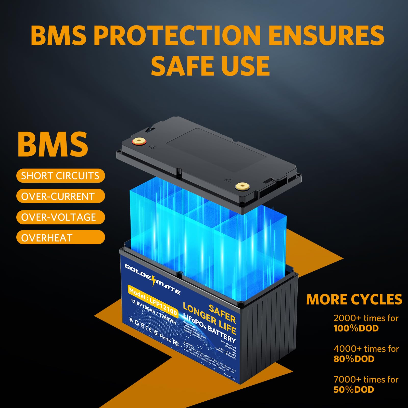 [Friendly Reminder]: This battery is not waterproof. When using it on a boat or in environments near water—such as as a power source for a trolling motor—please take additional waterproofing measures to protect it and prevent water ingress that may affect normal operation. If you are looking for a waterproof 12V 100Ah LiFePO4 battery from GOLDENMATE, please search the ASIN: B0DJ2KH4CY