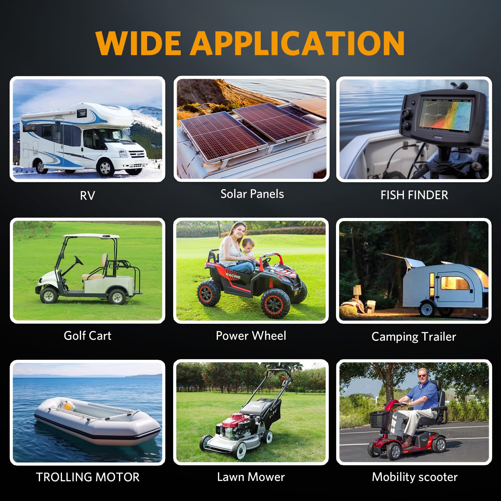 [Wide Applications]: Thanks to its remarkable energy density, prolonged cycle life, and exceptional performance, the 12v lifepo4 battery is widely applicable in various fields, including wheelchairs, emergency lighting, RV/outdoor camping, marine, golf carts, trolling motor, home energy storage, computer power backup, off-grid applications, solar panel wind energy storage solutions, among others