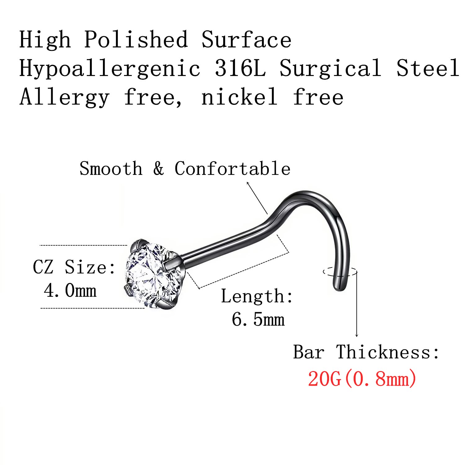 Quantity: 6pcs 4.0mm CZ screw nose rings. This screw nose ring size: Bar thickness: 20 gauge (0.8mm), Pin Length:6.5mm, Prong set cubic zirconia: 4.0mm, These stones a very bright and prong set by hand for accuracy.