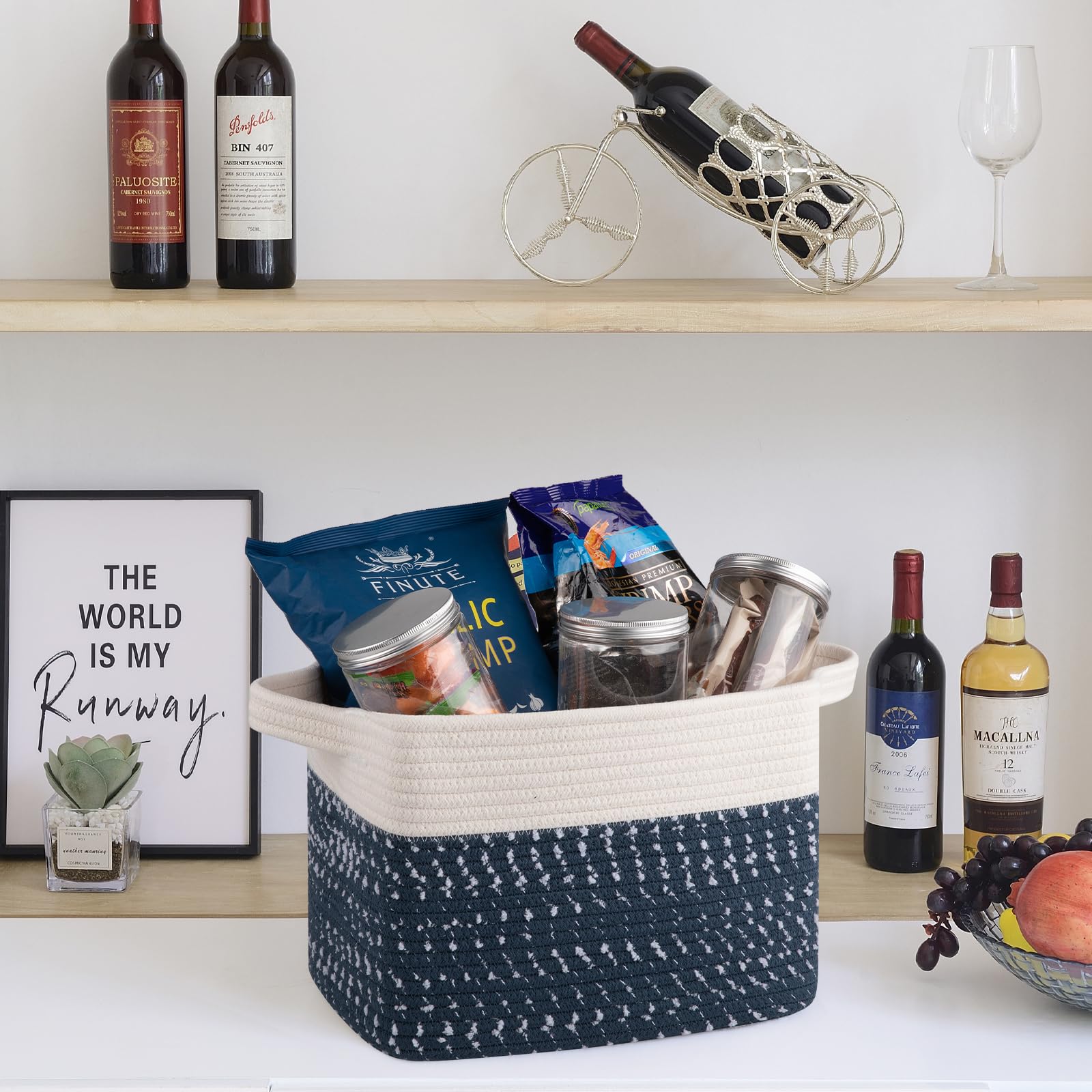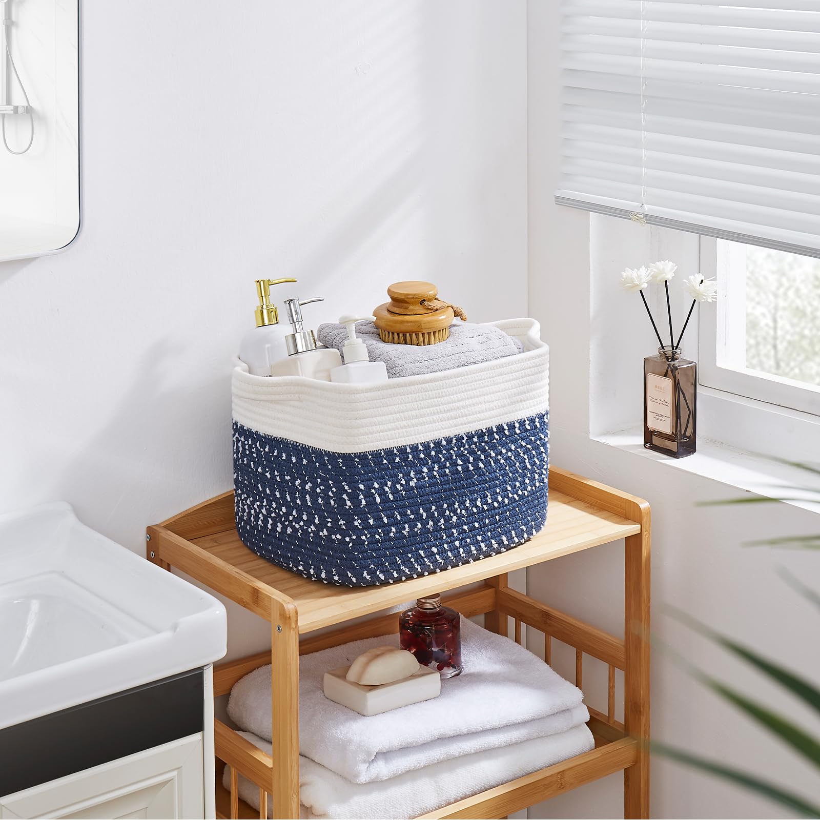 Unique Design:Small rope basket with foldable design and separate built-In handles for easy portability and store. The handle is made of 3-heeled braided rope, comfortable to the touch, even with heavy items your hand is not restrained.In addition the storage basket available in different unique colors. Provide a nice fine Nordic touch to any room of your house