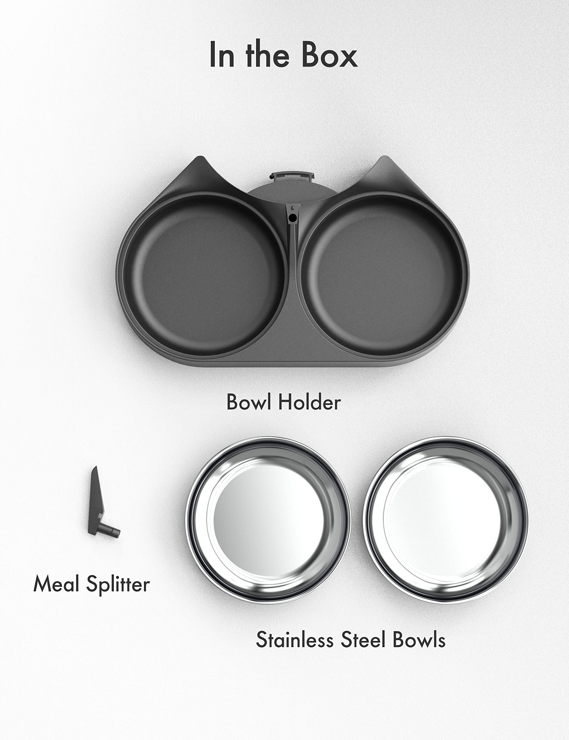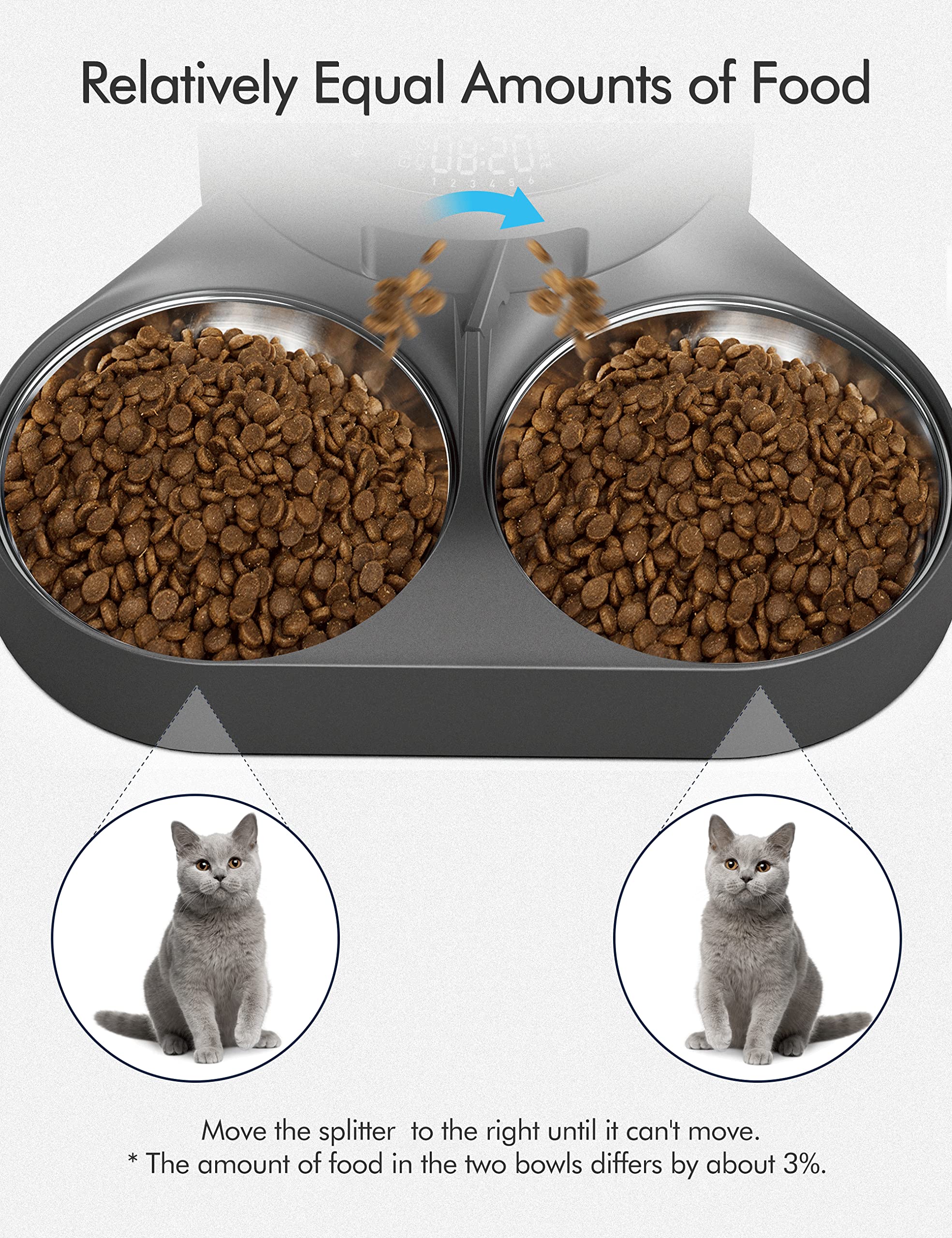 TWO CATS FRIENDLY DESIGN: PETLIBRO wifi automatic cat feeder is designed for two-cat families. Dry food is evenly distributed to two bowls to avoid competition for food grabbing. 5L large capacity to meet the diverse needs of cats and dogs. Up to 10 meals can be preset per day, and the amount of each meal can be freely adjusted (1-50 portions).
