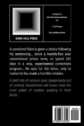 REVIEWS: " ... a cleverly executed [blend] of science fiction, suspense and horror. ... a certified dark journey into madness." - David Gammon, HORROR NEWS "Stadler - an experimental physicist by trade - effectively uses his background working in government and defense labs in painting vivid, appropriately clinical looks at the very base concept of torture. He spins it, however, into a horrifying tale of supernatural vengeance, one wrought with complex questions of faith, spirituality, and the after-life." - Chris Hallock, CHIZINE "Exoskeleton utilizes several science fiction and horror tropes: the medical experiment gone horribly wrong, the malevolent secret government organization that will stop at nothing to achieve its aims, vengeful spirits against which the fleshbound have no defense, [still] Stadler never lets the story devolve into cliche, but instead uses these tropes with originality and energy." - Tracie McBride, EXQUISITE CORPSE SYNOPSIS: A convicted felon is given a choice following his sentencing ... Serve a twenty five year conventional prison sentence ... Or spend 365 days in a new, experimental corrections program. He opts for the experimental program ... Only to realize he has made a horrible mistake. A dark tale of science spun dangerously out of control, Exoskeleton will leave even the most jaded of readers quaking in their boots.