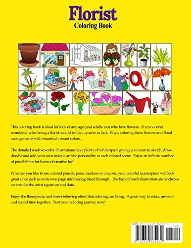 This coloring book is ideal for kids of any age (and adults too) who love flowers. If you've ever wondered about being a florist, you're in luck. Enjoy coloring these floral arrangements with beautiful vibrant colors. These detailed ready-to-color illustrations have plenty of white space giving you room to sketch, draw, doodle and add your own unique artistic personality to each colored scene. Enjoy an infinite number of possibilities for hours of creative fun! Benefits - Make your work look great using colored pencils, pens, markers or crayons - Illustrations on separate pages to protect your colorful masterpiece - Artist name & date box on back of each illustration - Share and give your colored art work to friends, family and loved ones as gifts or precious keepsake - Enjoy therapeutic, stress relieving effect coloring can bring - Relax, unwind and spend time together Makes a great gift for anyone who loves flowers and florists. Just hit the buy button and start your coloring journey now!