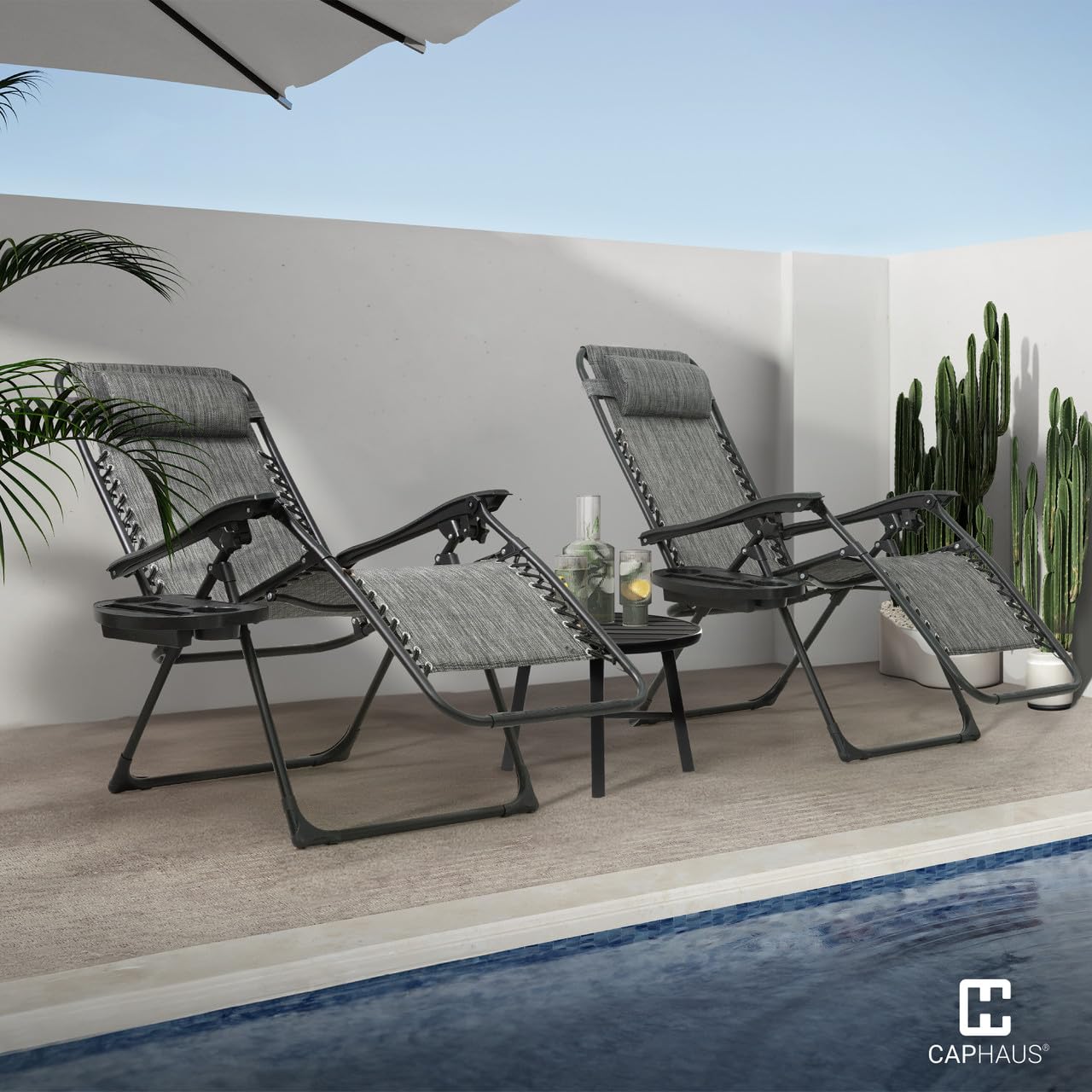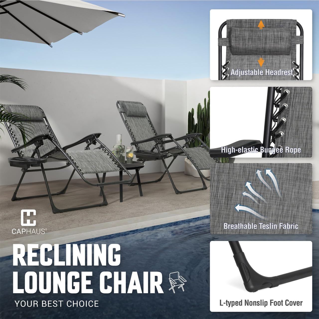 🪑 Detachable Side Trays - Each reclining chair in this set is thoughtfully equipped with a detachable side tray. The tray (15.2"W x 9.4"D x 2.6"H), which includes 2 cup holders, a phone holder and a tablet holder, gives you a convenient and accessible surface to place your drinks, snacks, books or even your favorite gadgets, ensuring you have everything you need within arm's reach as you sunbathe in comfort.