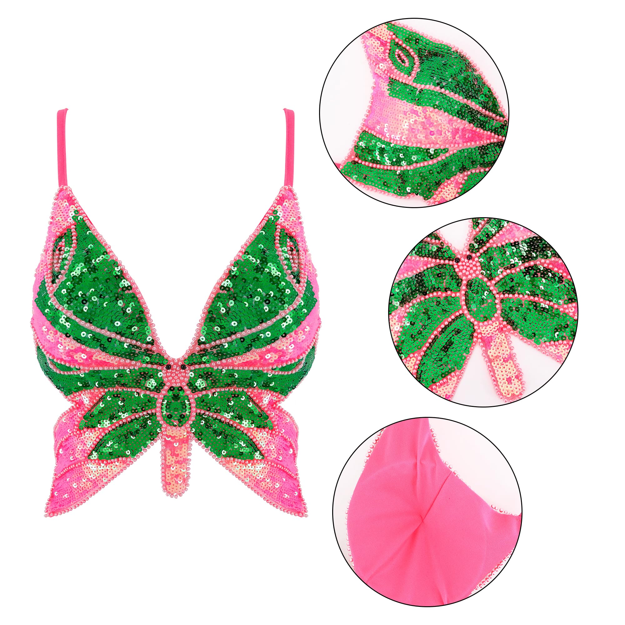 Material: These butterfly tops is made of good quality 100% polyester, stylish and comfortable, criss cross adjustable spaghetti straps, shiny sparkly metallic sequins emblishments. It is the perfect sexy crop tank top for party or rave.