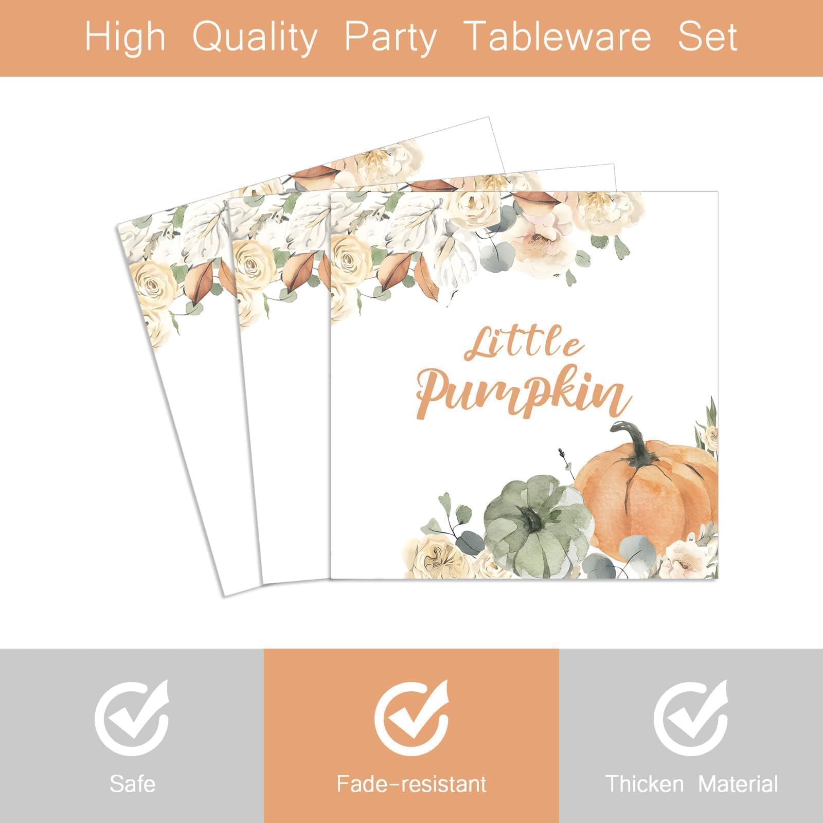 【Complete Set for Your Celebration】This little pumpkin baby shower tableware set includes 24 pieces of 9-inch dinner paper plates, 24 pieces of 7-inch dessert plates, 24 napkins, and 24 plastic forks, totaling 96 pieces to serve up to 24 guests with everything needed for a seamless party experience in one convenient package.