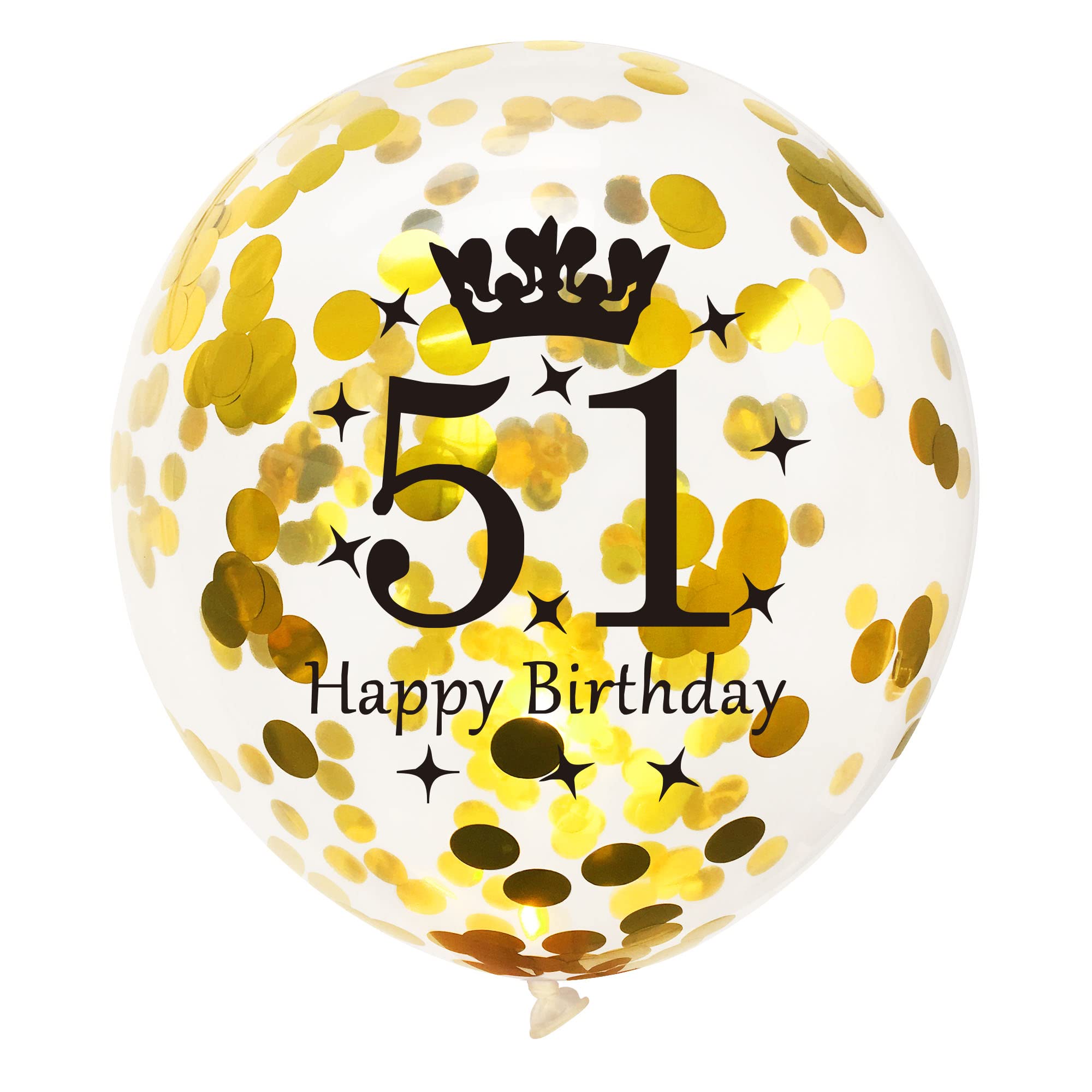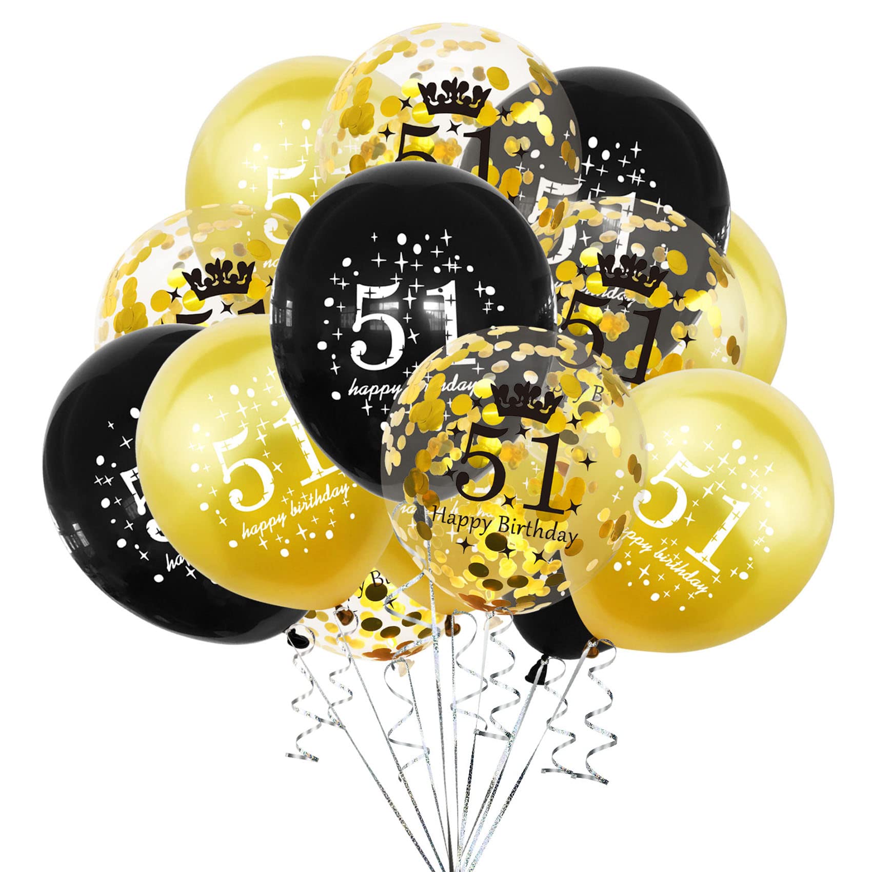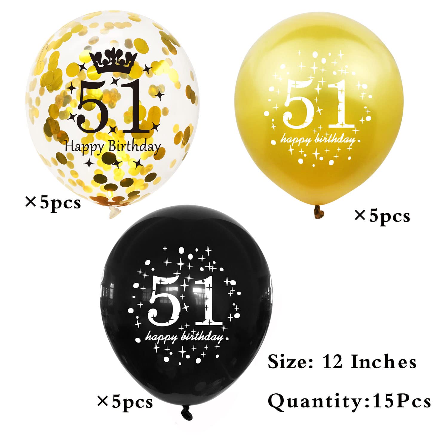 Package:5 pieces 12 inch black latex balloon printed with the words "51 Happy Birthday",5 pieces 12 inch gold latex balloon printed with the words"51 Happy Birthday",5 piece 12 inch gold confetti balloons printed with the words"51 Happy Birthday",very suitable for women men 51st birthday party decorations