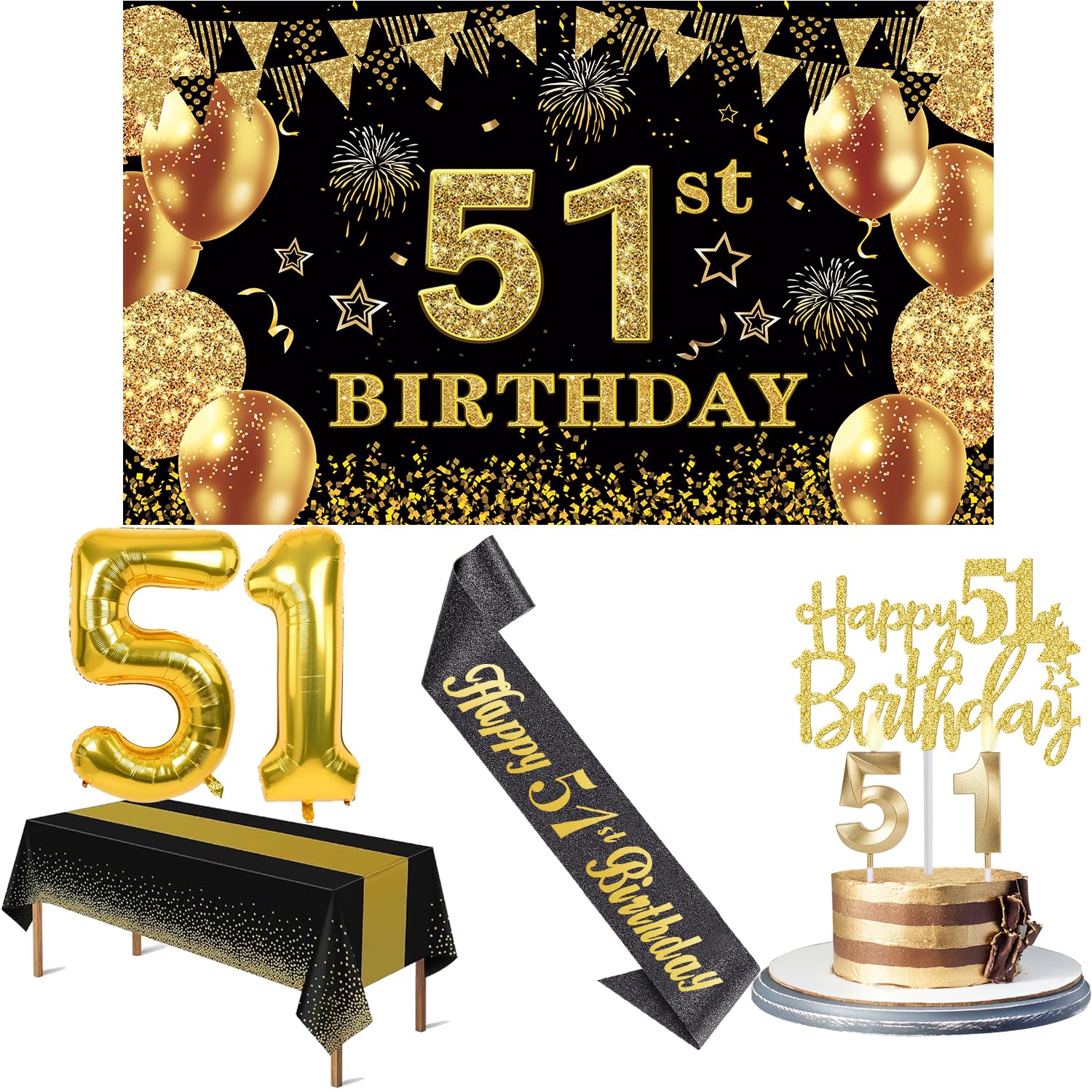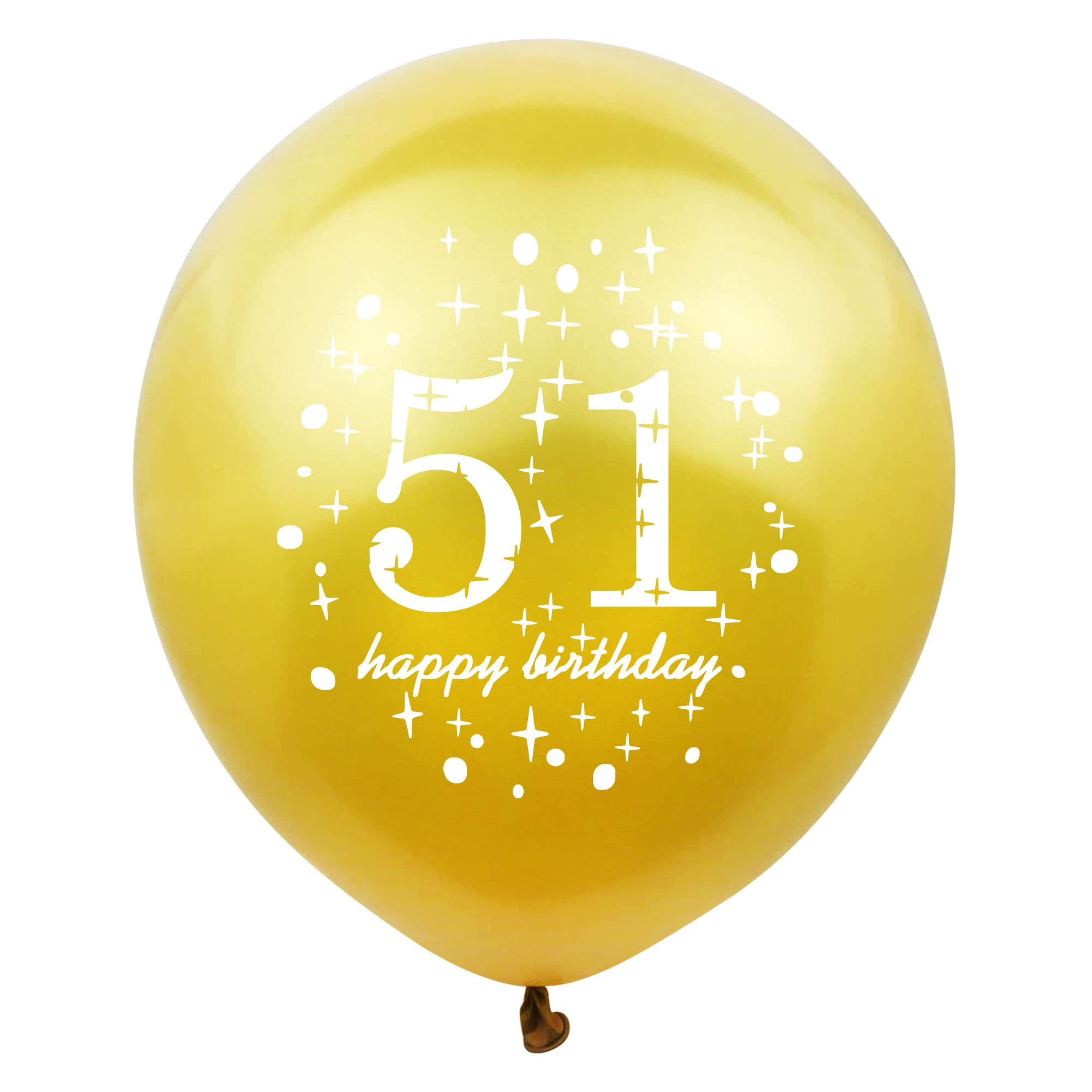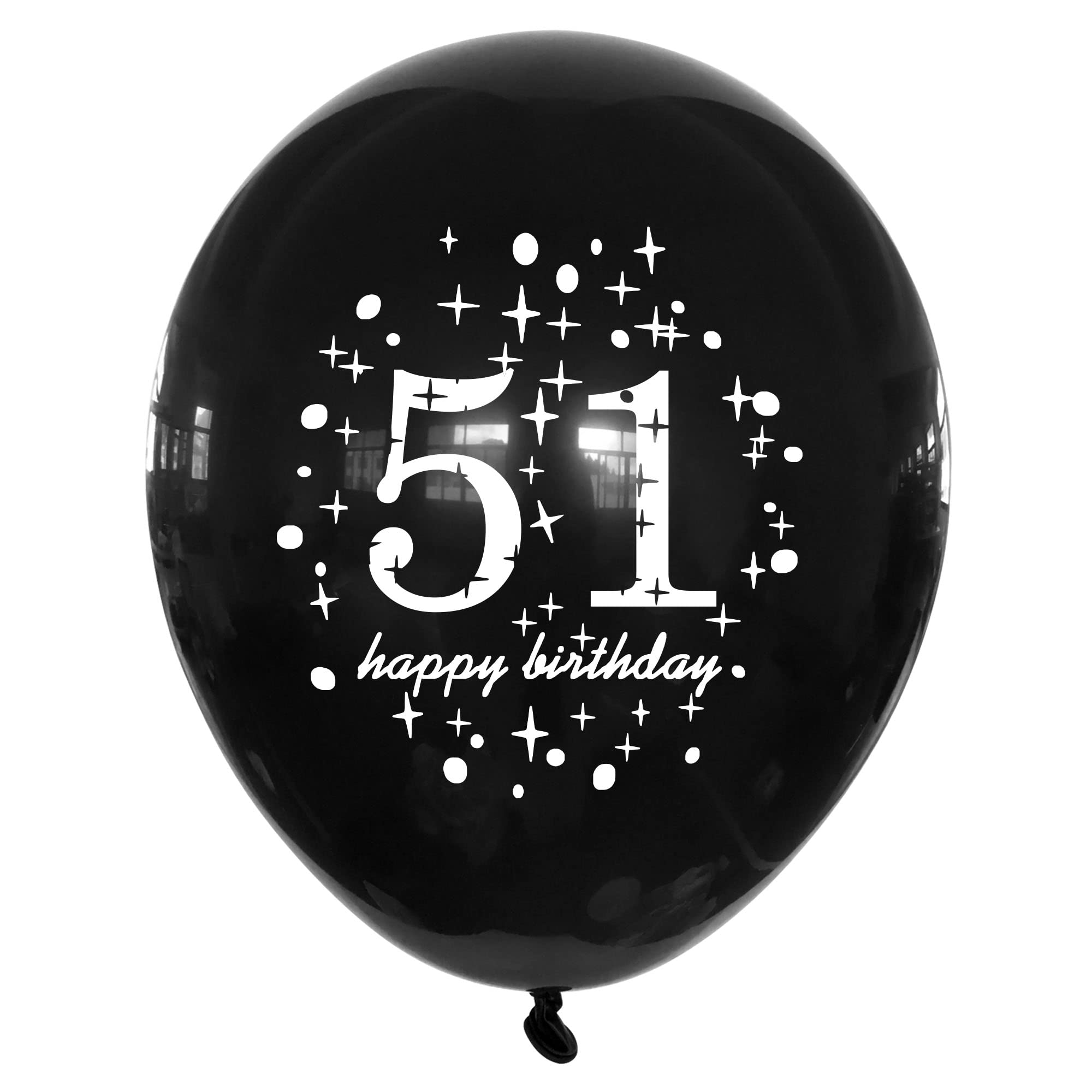 Package:5 pieces 12 inch black latex balloon printed with the words "51 Happy Birthday",5 pieces 12 inch gold latex balloon printed with the words"51 Happy Birthday",5 piece 12 inch gold confetti balloons printed with the words"51 Happy Birthday",very suitable for women men 51st birthday party decorations