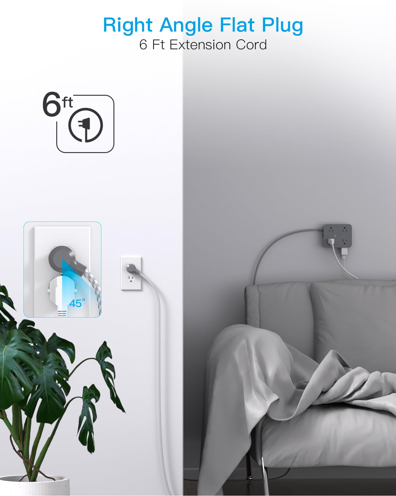 【6 Ft Extension Cord with Flat Plug】- The low profile flat plug fits easily in tight spaces; and the right angle flat plug design prevents bottom plug blocking; the 6Ft white braided extension cord is made of pure copper, which has better current carrying capacity (15A). The braided power cord is not easy to deform, durable and more safety; the two mounting holes on back allows this power strip to be securely installed in various applications.