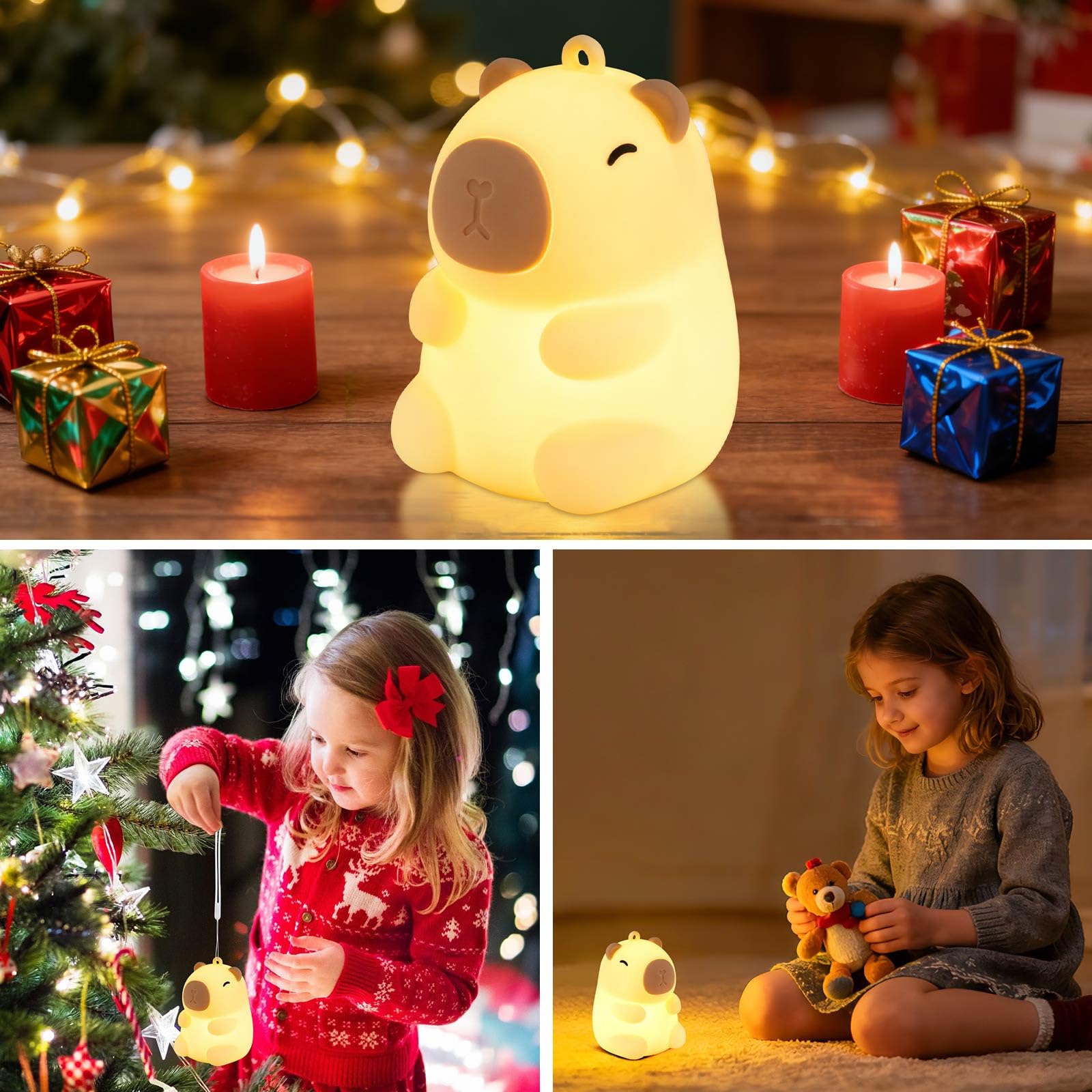 Squishy & Comfortable Silicone Design - Crafted from soft silicone, this squishy christmas capybara night light is delightfully squeezable and safe to handle. Its cute shape returns to its original form even after a good squeeze or playful poke, making it a quirky stress-reliever. The seamless exterior means there are no cracks to trap dirt, and a quick wipe with a damp cloth restores its shine.