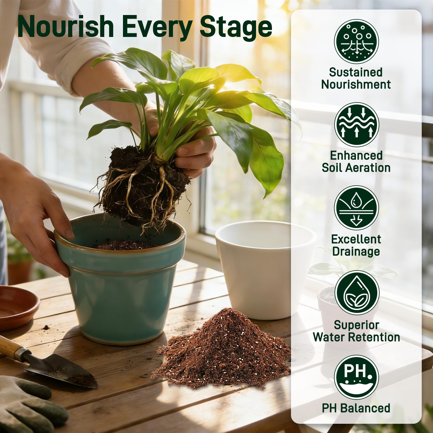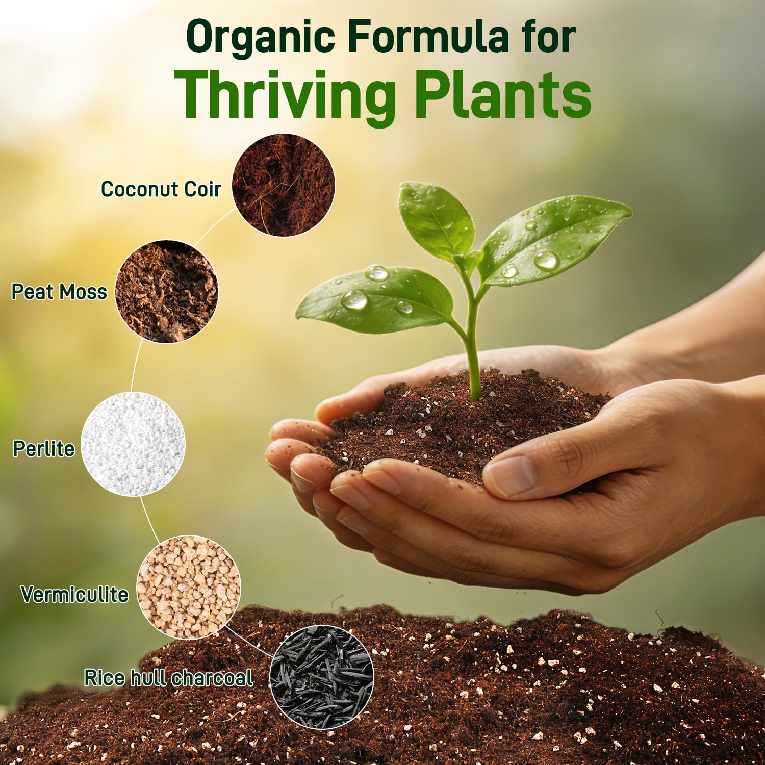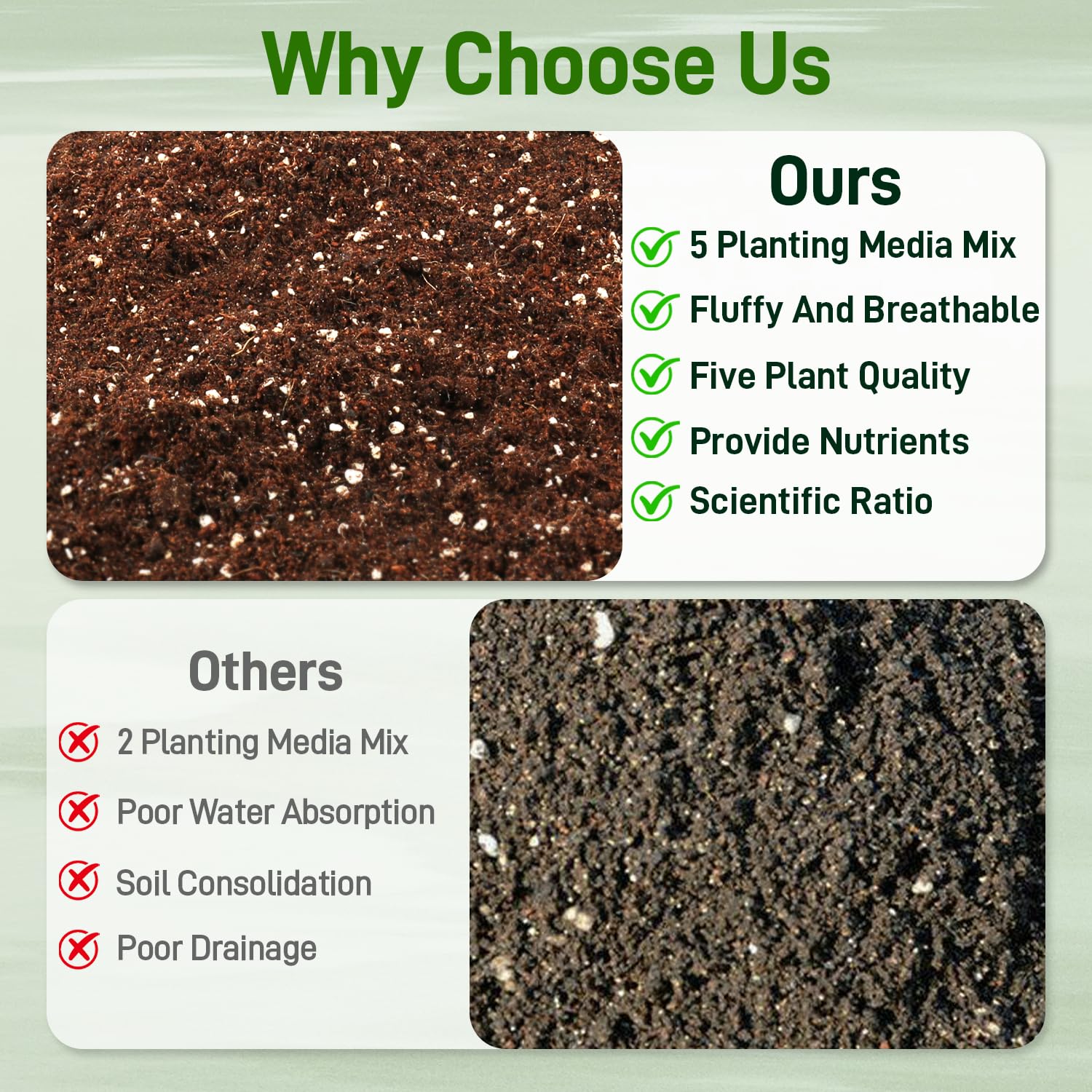 Five High-Quality Ingredients: A premium potting mix comprises a balanced blend of organic and inorganic materials. The components include 55% coconut coir fiber, 12% peat moss, 11% perlite, 11% vermiculite, and 11% rice hull charcoal. The scientifically balanced nutrition caters to the unique requirements of different plant types, promoting optimal plant growth.