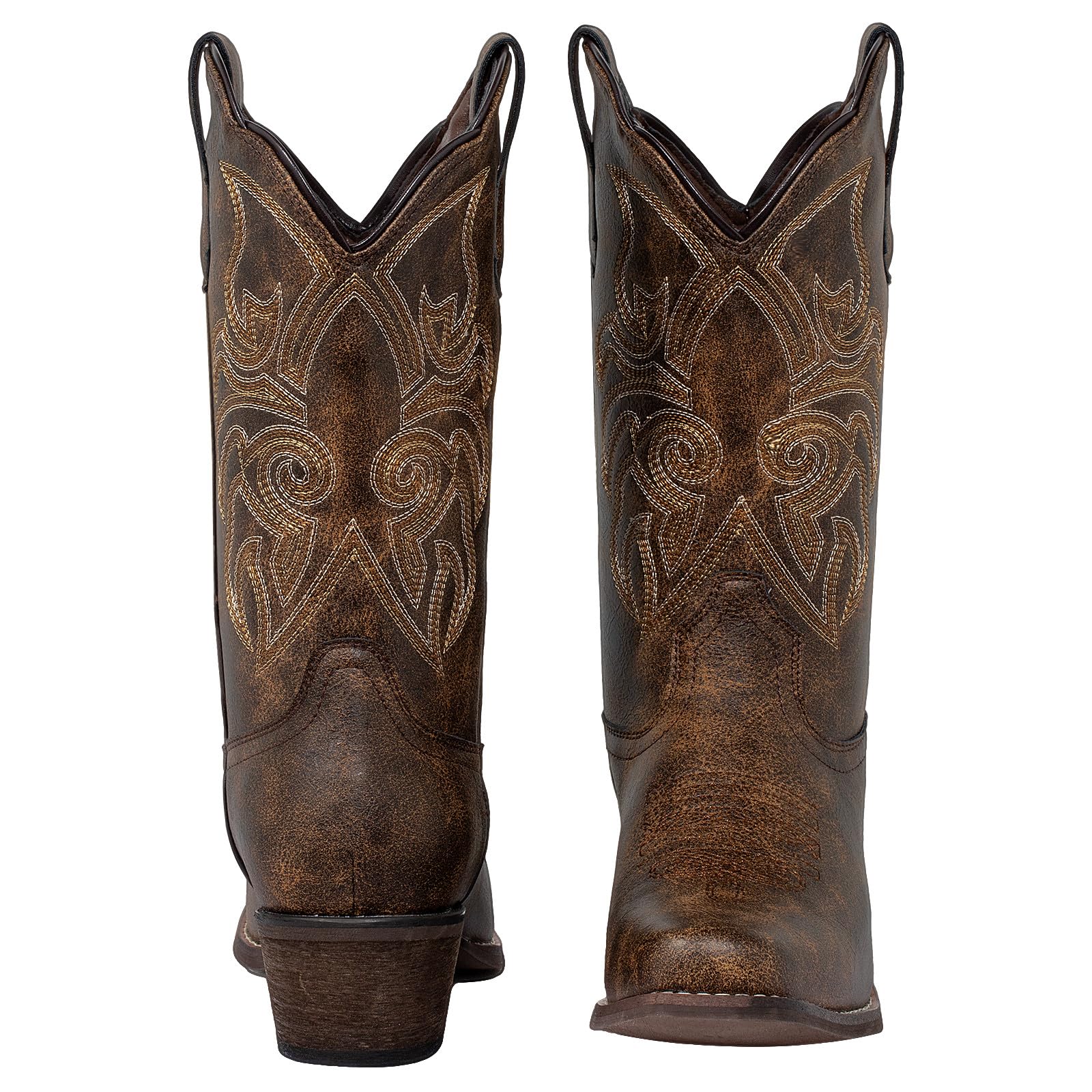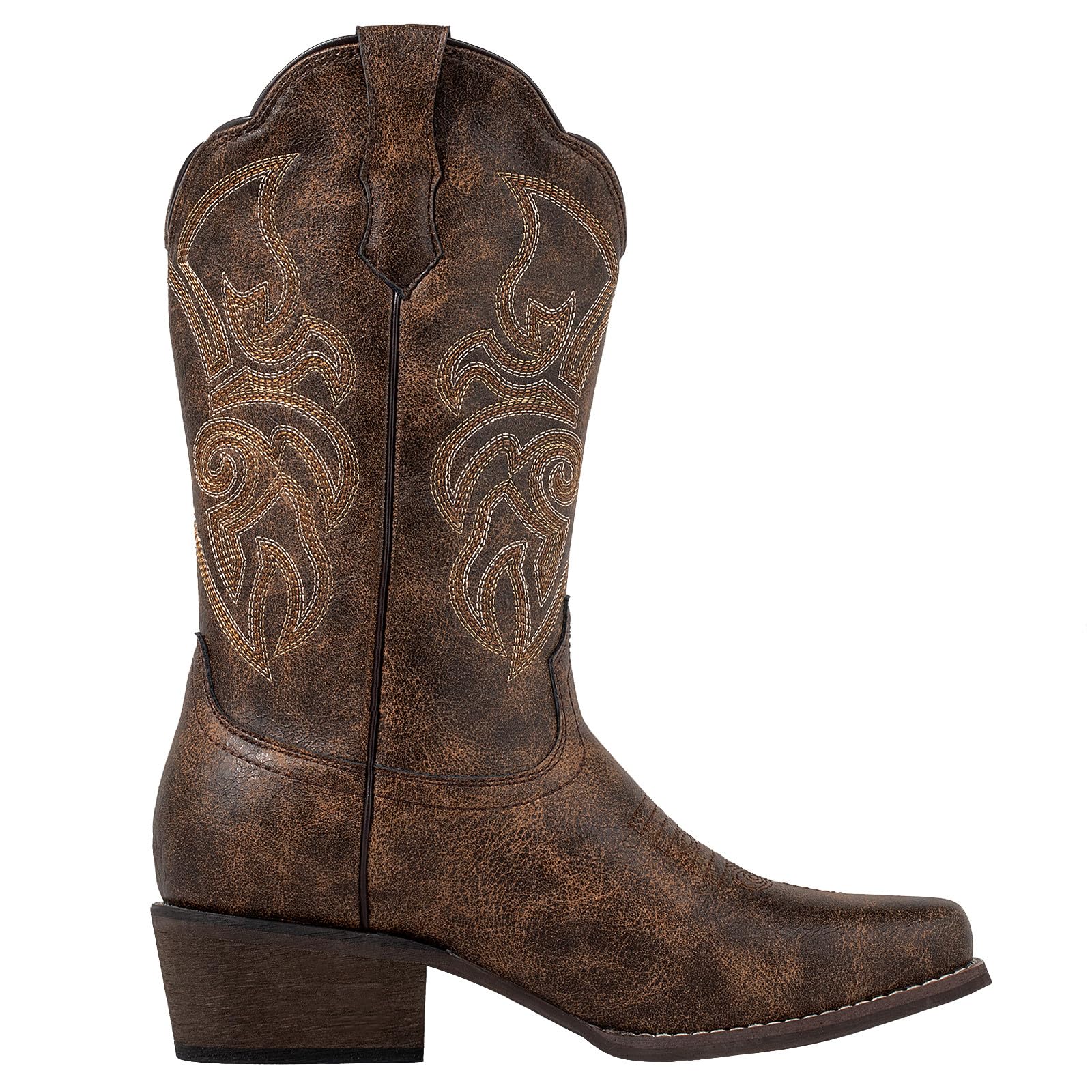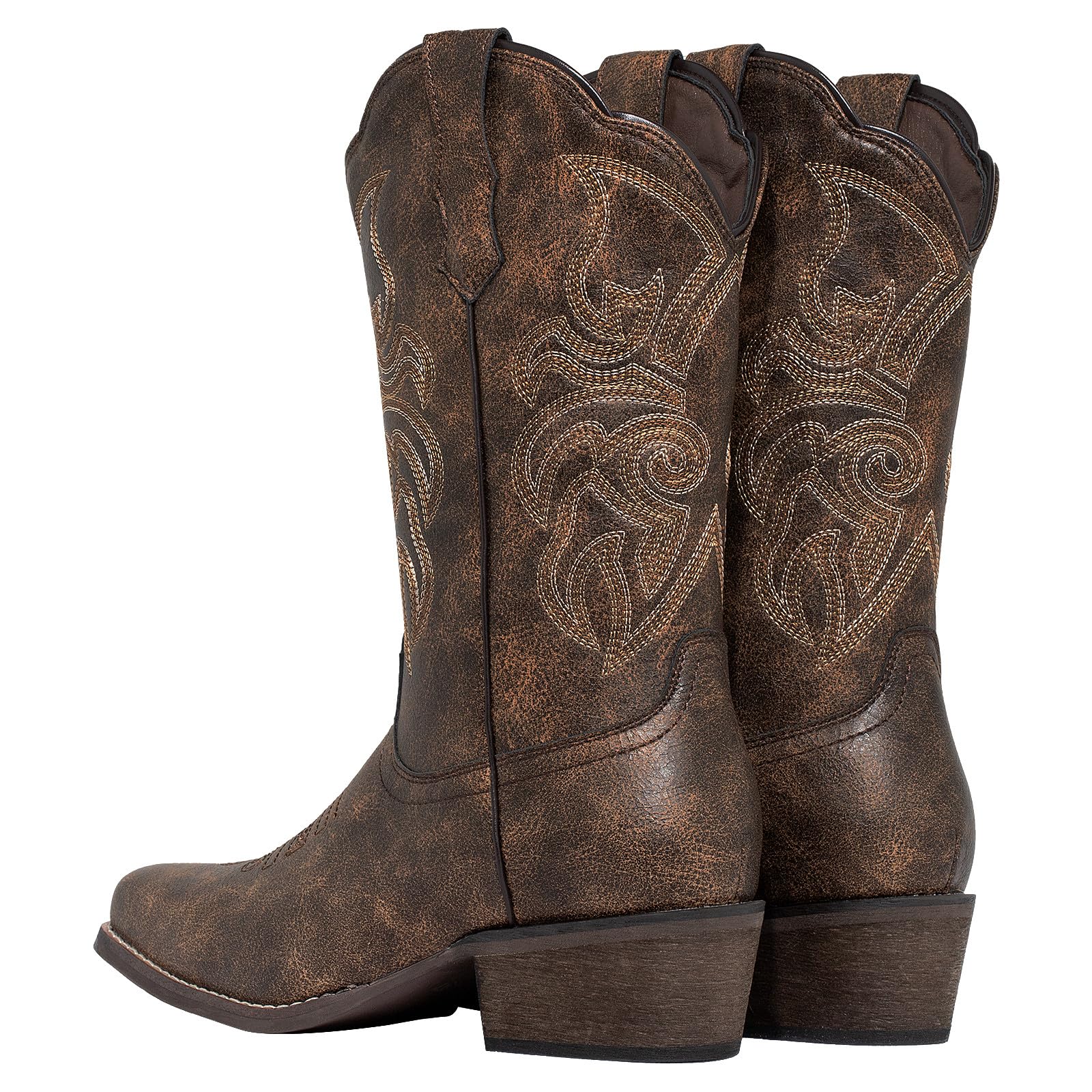 CLASSIC COWBOY STYLE: Designed to offer a blend of fashion and functionality, J's.o.l.e women's cowboy boots feature a mid wide calf, square toe, distressed six-row stitch pattern, side pull loops, and vintage block heel.