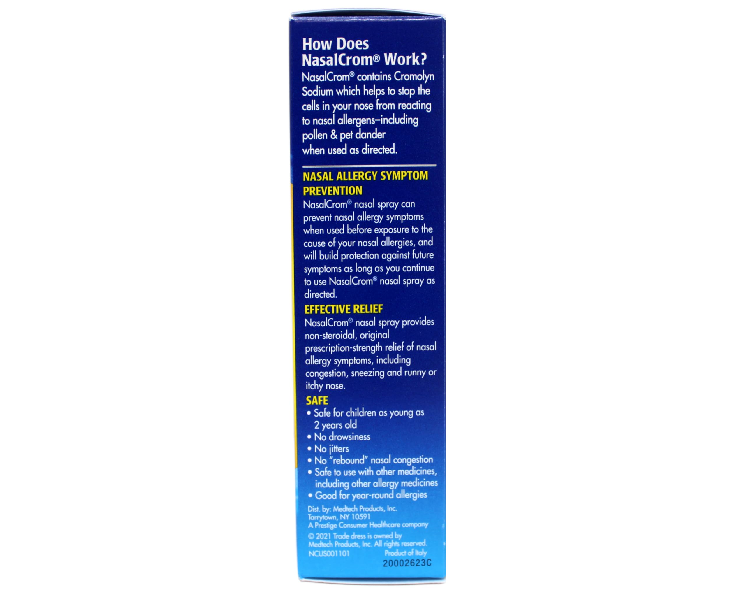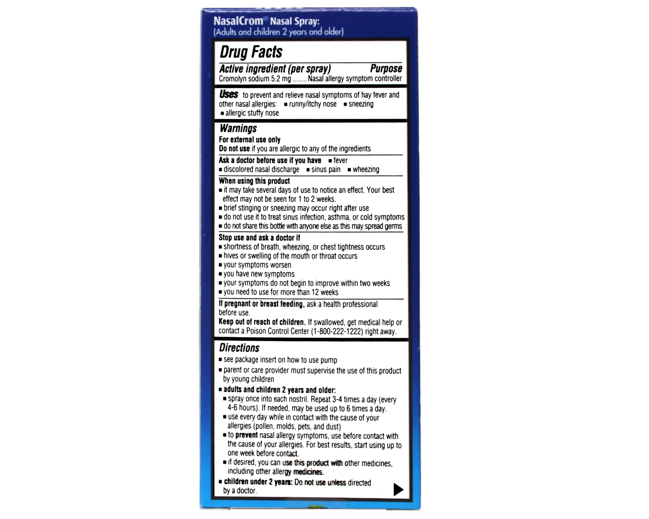 NasalCrom works differently other over-the-counter allergy products and brings relief from chronic allergy symptoms before they begin. When used before exposure to many common allergens, NasalCrom can prevent the onset of nasal allergy attacks and build protection against future symptoms as long as you continue to use it as directed. NDC: 52183-199-13 (HUMAN OTC DRUG LABEL)