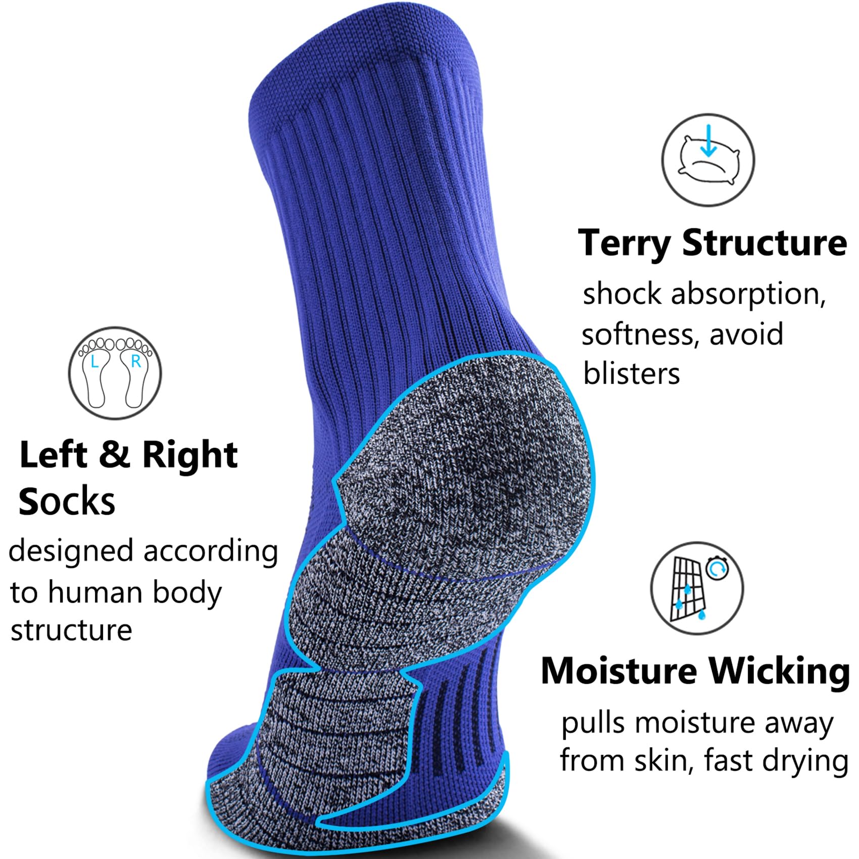 UNIQUE SOLE: Design LEFT AND RIGHT SOCKS according to the plantar structure; Combed Cotton and Tech-dry yarns; Cushioned, more soft and comfy, shock absorption