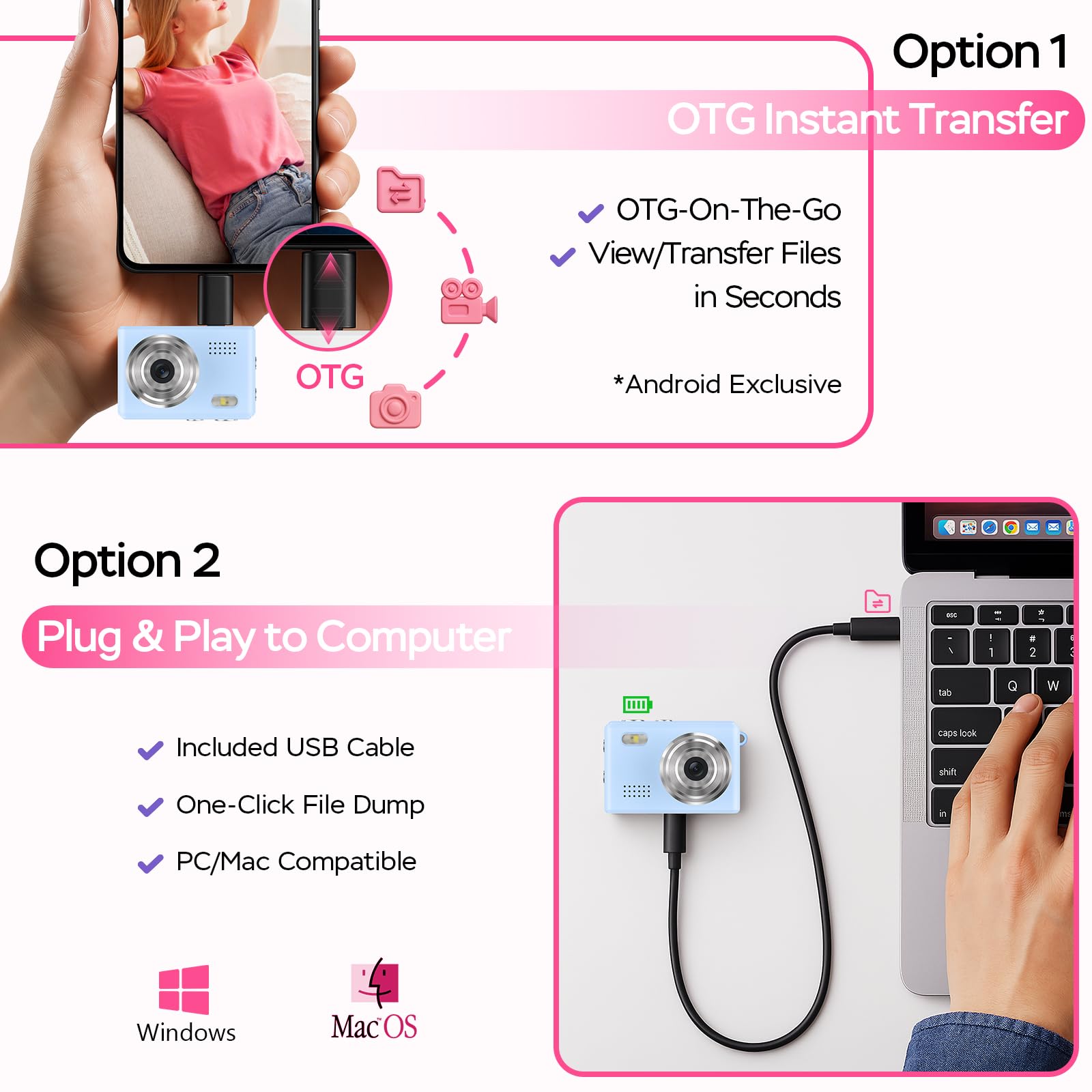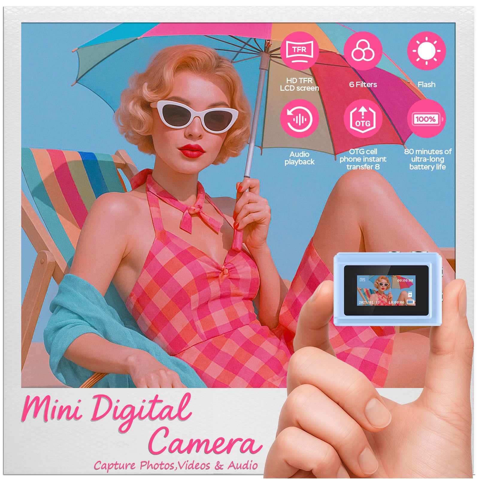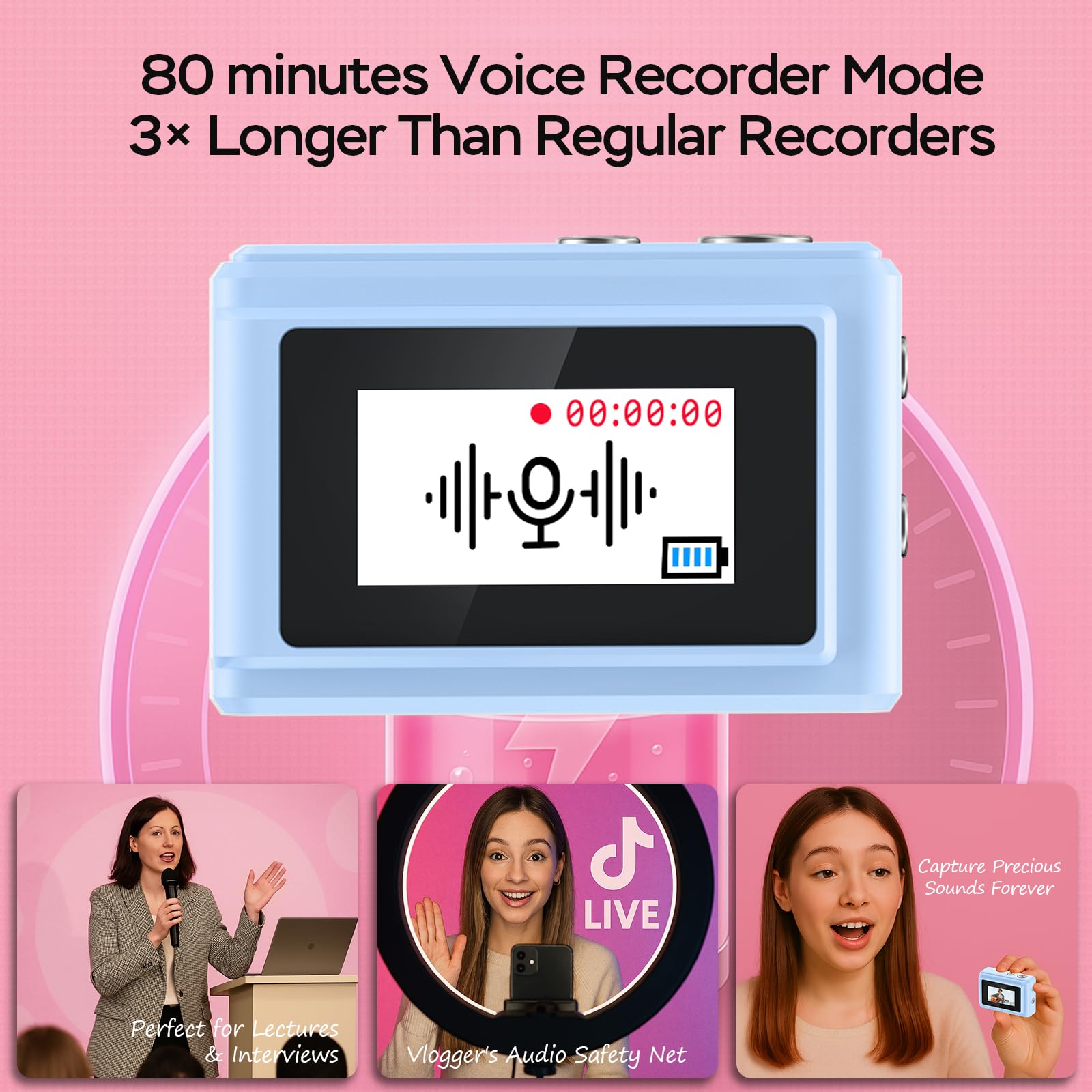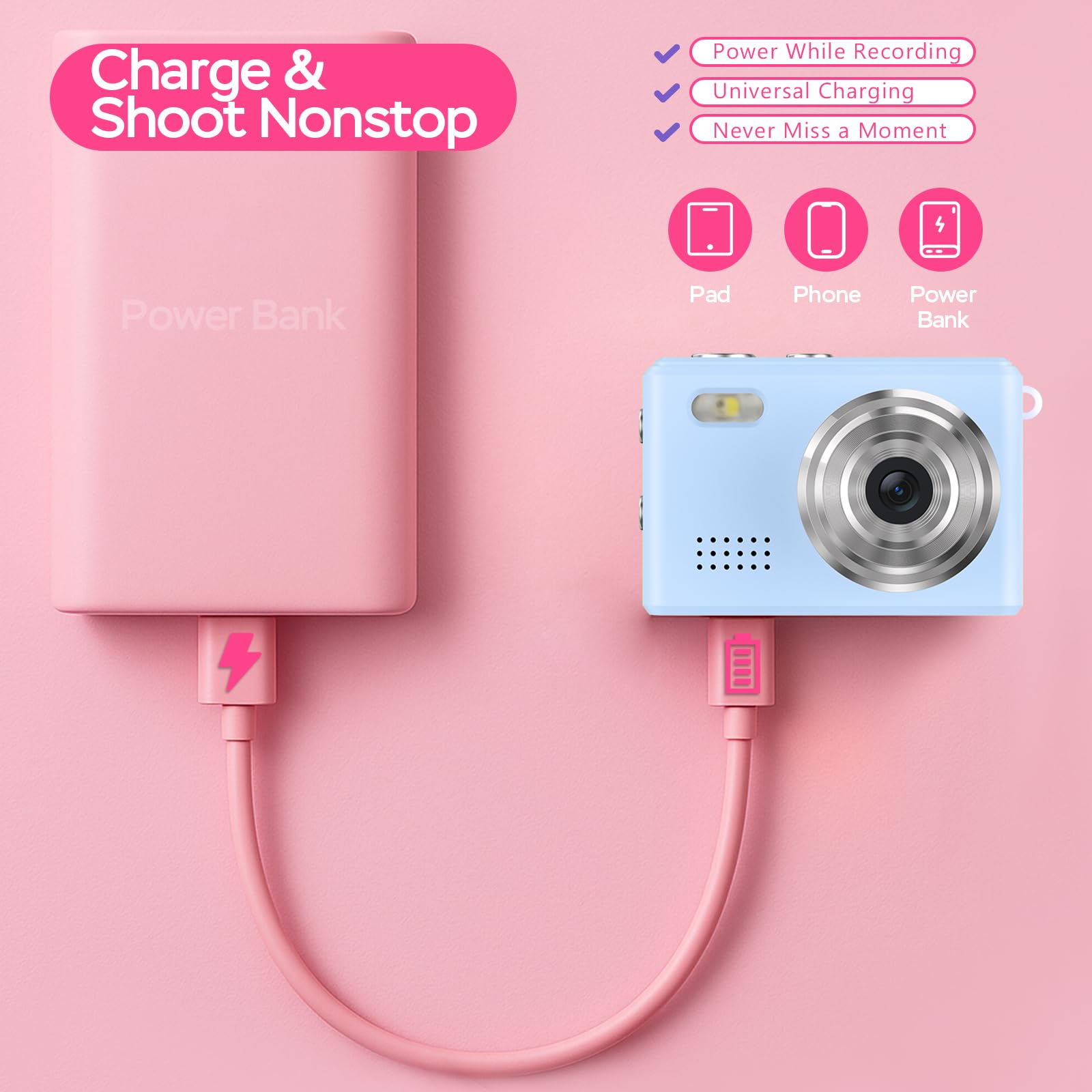 ⚡️【80+Mins Continuous Powerhouse】 Keep shooting longer! Our mini digital camera features a 180mAh battery supporting 80+ minutes of non-stop filming. Unique Type-C live charging allows simultaneous recording/powering - ideal for extended events like graduations or road trips.