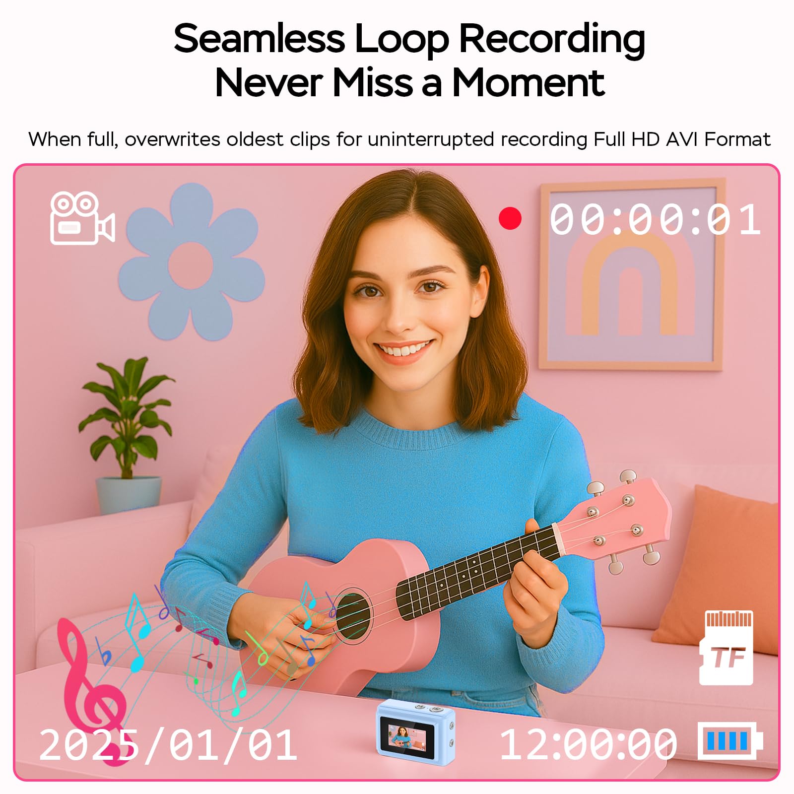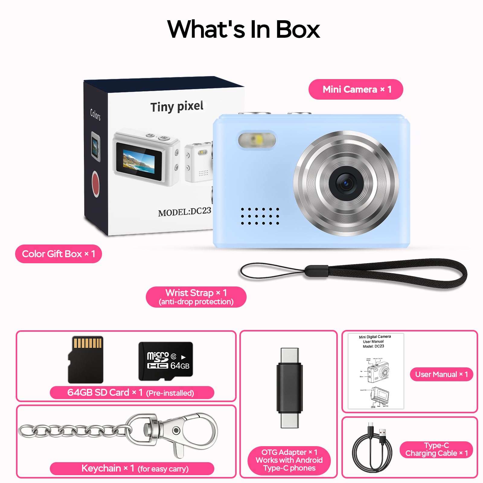 ✅【Complete Recording Toolkit】 Package contains a small camera, 64GB card, keychain camera accessories, wrist strap, Type-C cable, and manual. Backed by a 1-year warranty, it’s a thoughtful gift for kids, teens, or first-time camera users. If there is any problem with the little camera, please feel free to contact us, we will reply within 24 hours and provide you with a satisfactory solution.