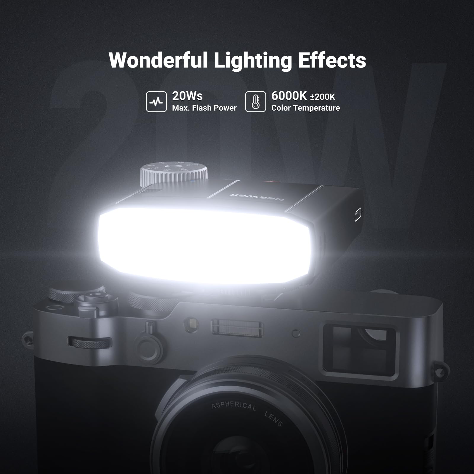 【Bright & Powerful Output】 Featuring a 20Ws output with a GN15 (ISO 100, meters) and a 6000 (±200K) color temperature, this camera hot shoe flash delivers bright fill light to reduce harsh shadows from the main light, naturally highlight portrait contours, and brighten fine details