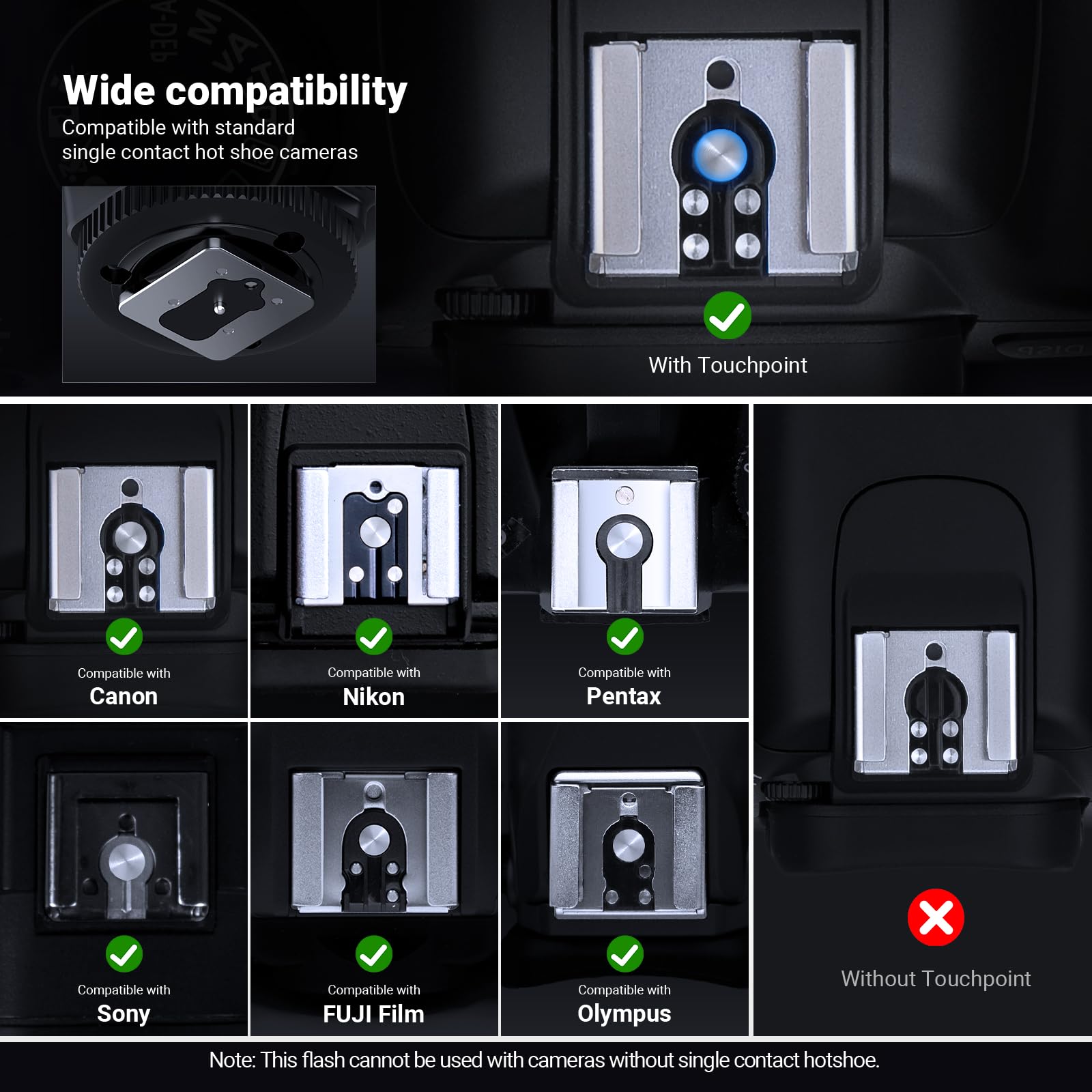 【Speedlight for Standard Hot Shoe】 The speedlite flash as camera photography accessories is compatible with Canon 5DIII 5DIV 70D 80D 1DX 90D M6 M5 M3 EOS RP R5 Nikon D800 D780 D5 D4 D500 D750 Z8 ZFC D7500 D3100 Sony A7III A7IV A7RIV A9 A6400 ZV-1 ZV-E10 Panasonic S1R GH5 Olympus E-M1 Pentax K-31 645Z KP K-70 K-S2 K-1 K50 Fuji X-Pro2 X-T2 X-T1 GFX50s X-T30 X-T4 X-T3 LEICA M10 Q2, etc. NOT compatible with Canon R6 3000D 1500D 200DII R50 Sony ZV1-F A9III A99 A77 A350 Zv1 Mark 2 Fujifilm X-A3 X100T