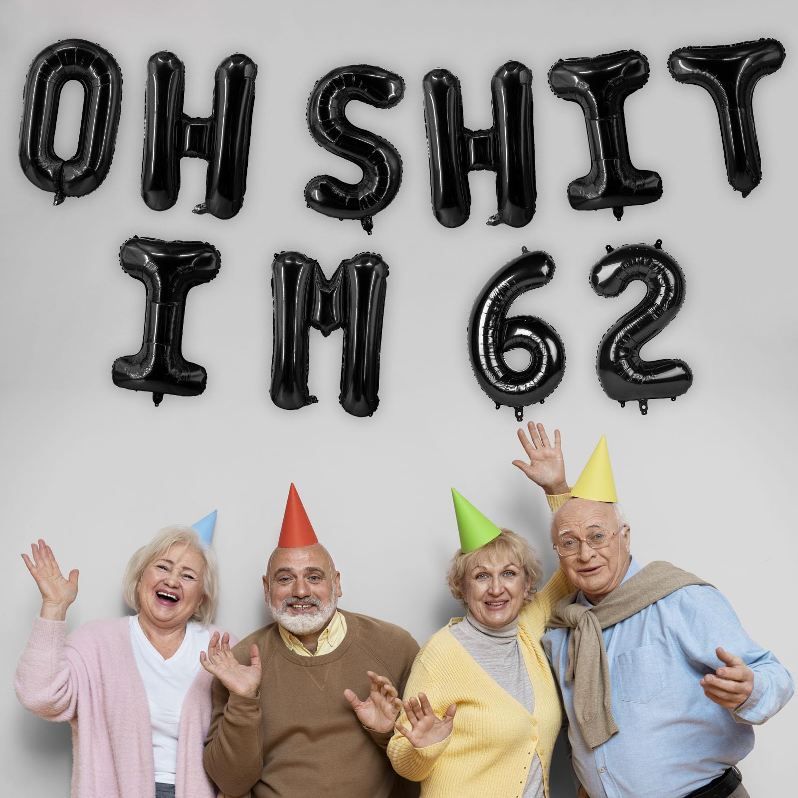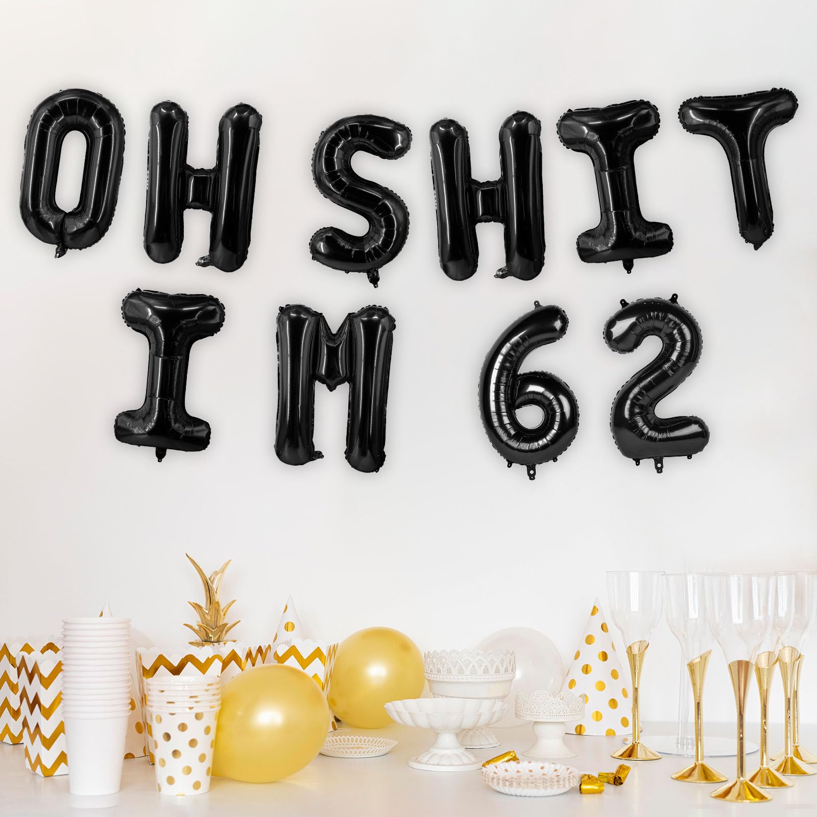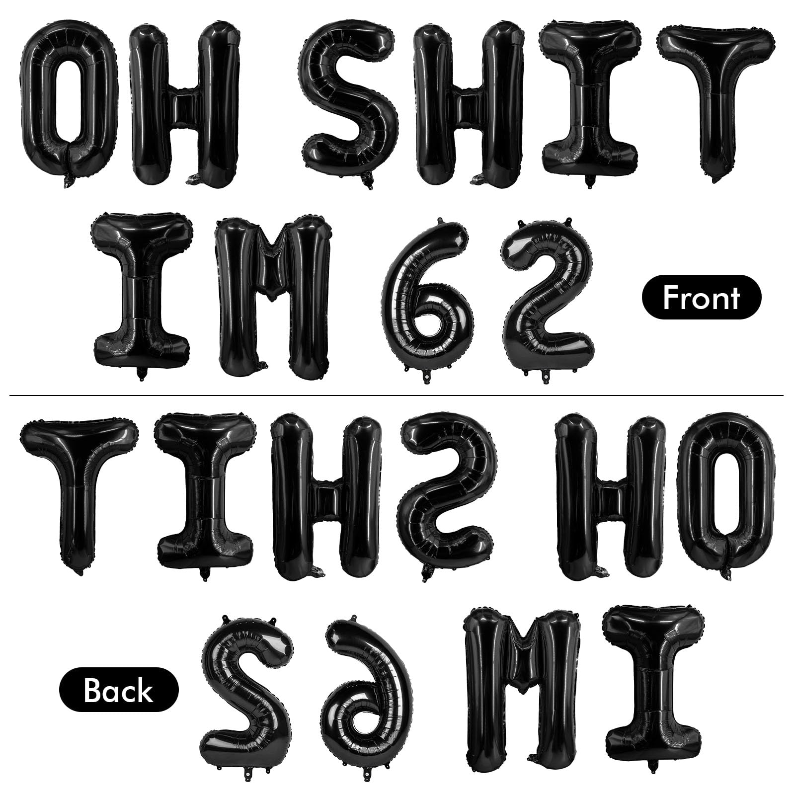 Funny Birthday themed decorations: All balloons are printed with black color(O H S H I T I M 6 2), Make your birthday party more fun