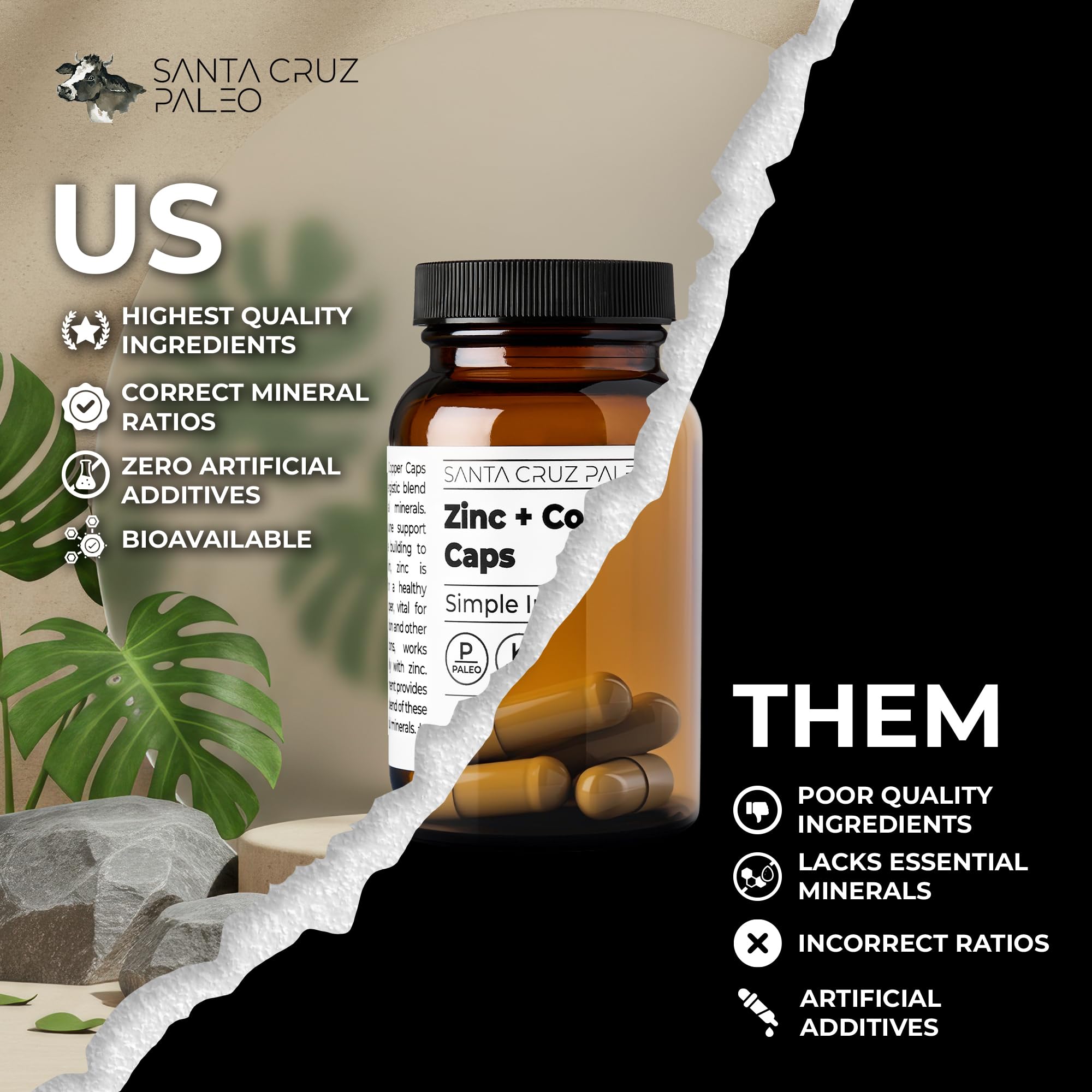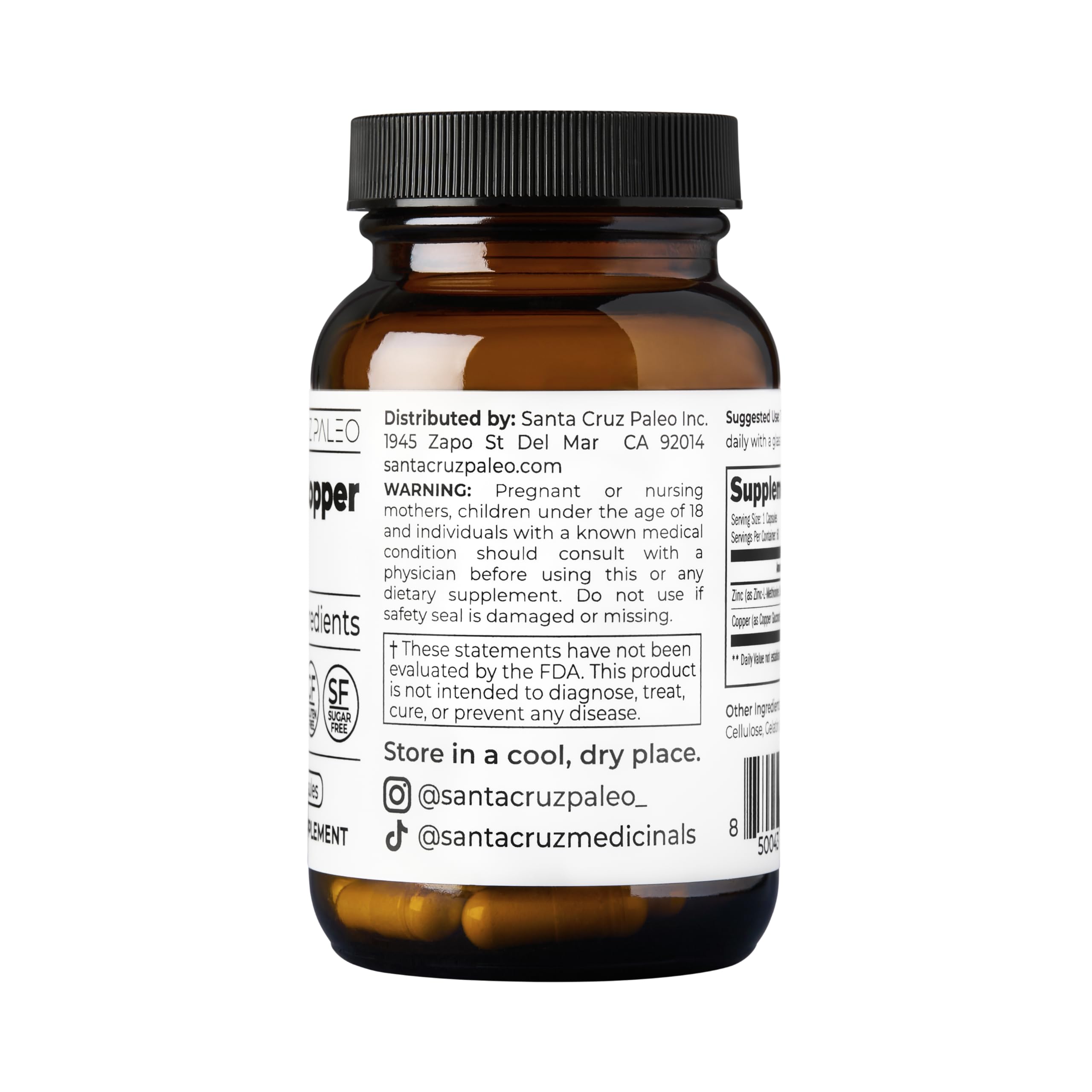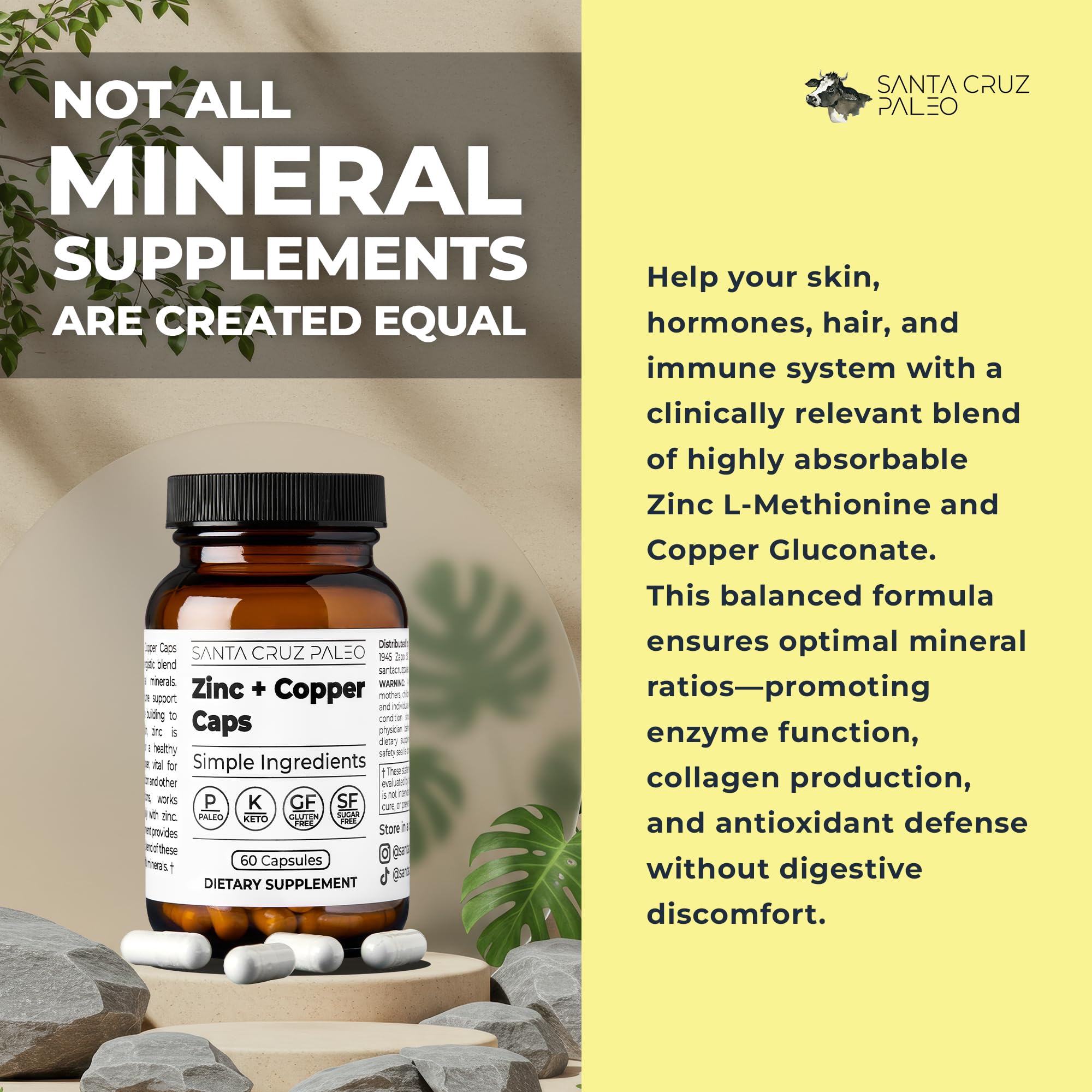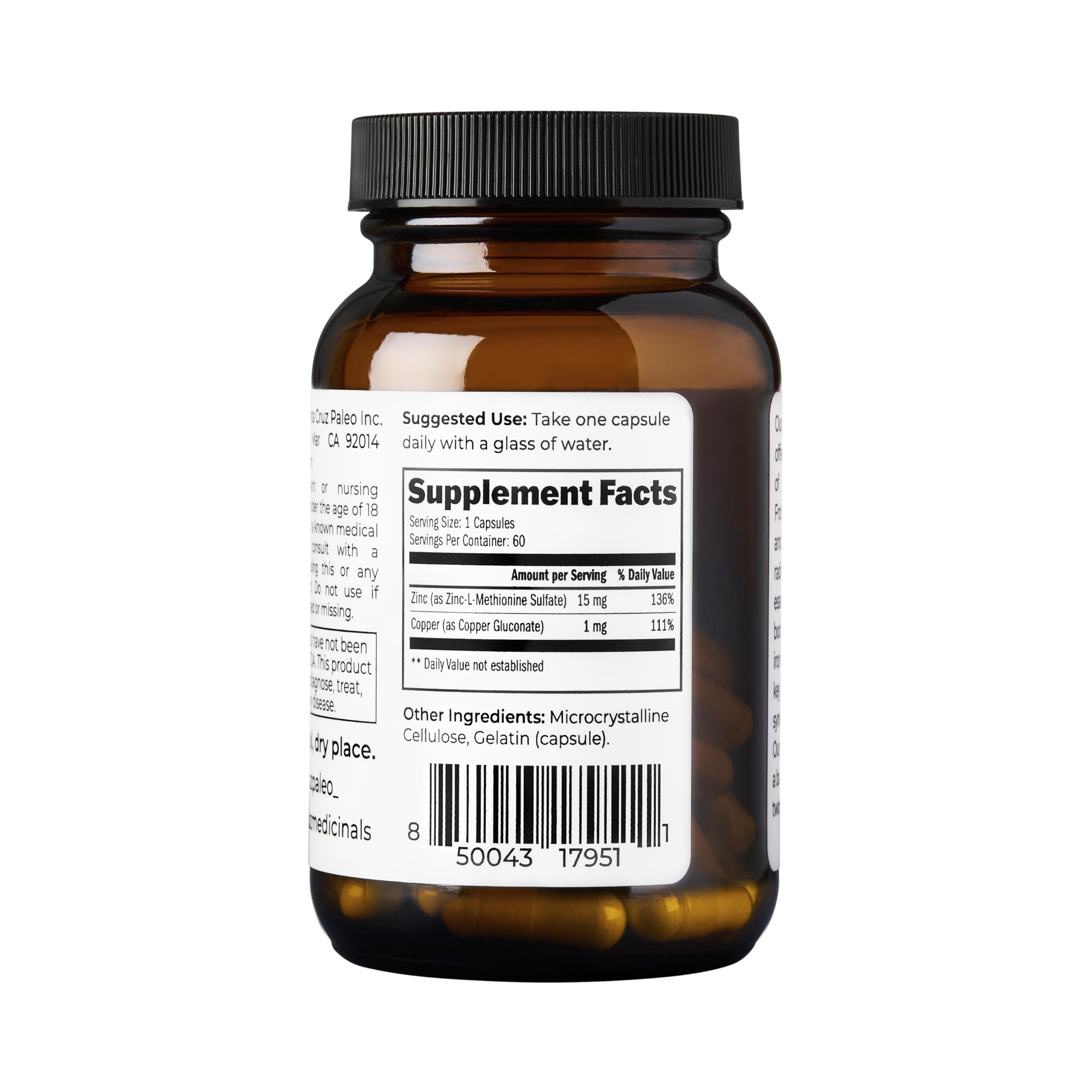 Support your foundational health with Santa Cruz Paleo Zinc + Copper Capsβa clean and effective addition to your daily vitamins and mineral supplements. This formula combines zinc L-methionine and copper gluconate, two bioavailable forms designed for better tolerance and absorption. Each capsule provides 15 mg of zinc and 1 mg of copper, delivering a targeted dose of zinc with copper to help support collagen formation, iron metabolism, and immune support. Ideal for those seeking zinc supplements for men or zinc supplements for women, this product fits seamlessly into a variety of wellness routines. Amino acids like L-methionine enhance the bioavailability of zinc, making this formula gentler on the stomach than traditional zinc oxide. Free from unnecessary fillers, binders, and additives, itβs also an excellent choice for those looking for simple, trustworthy copper supplements. A smart choice for anyone prioritizing balance in their daily nutrient intake.